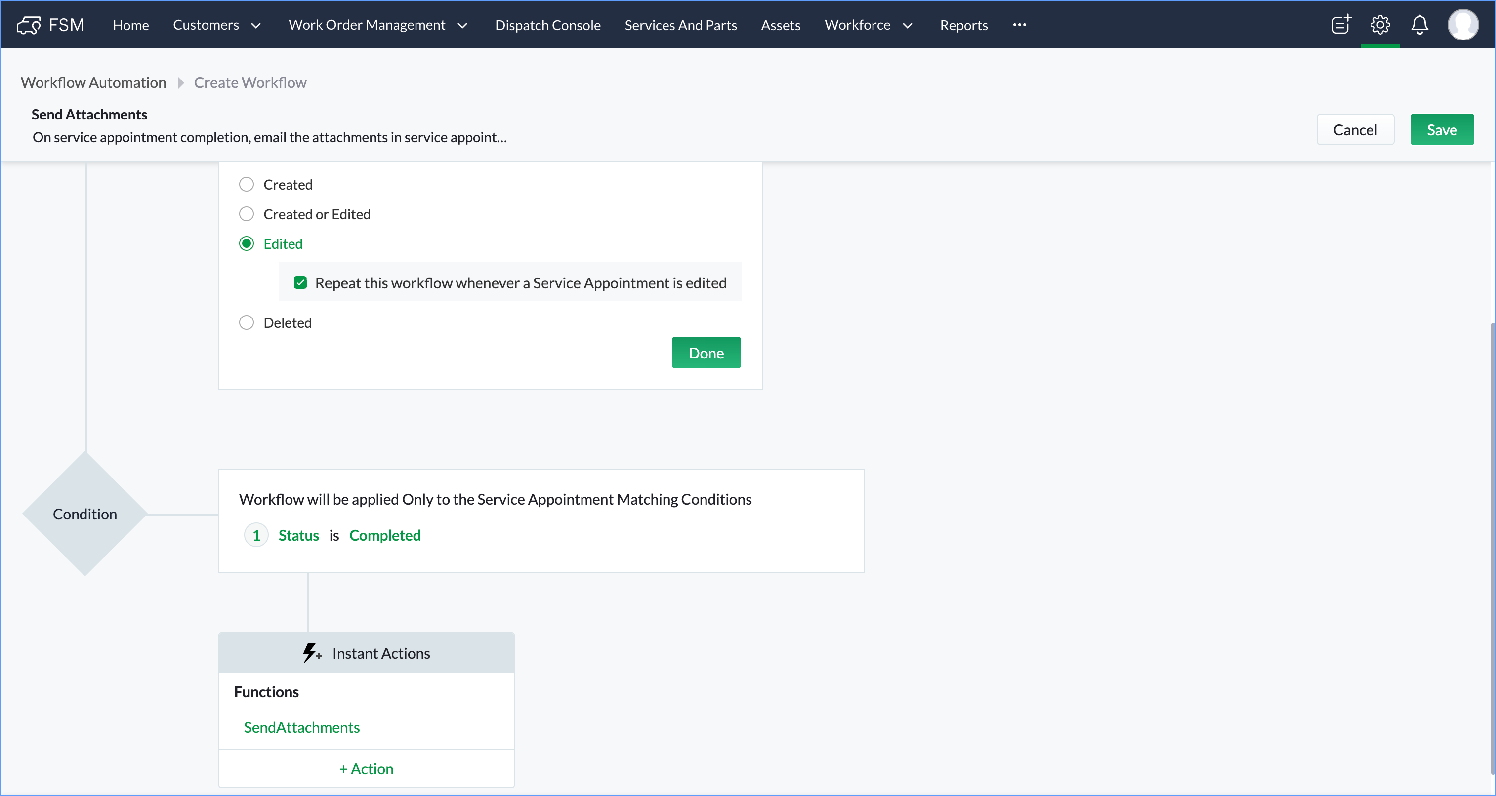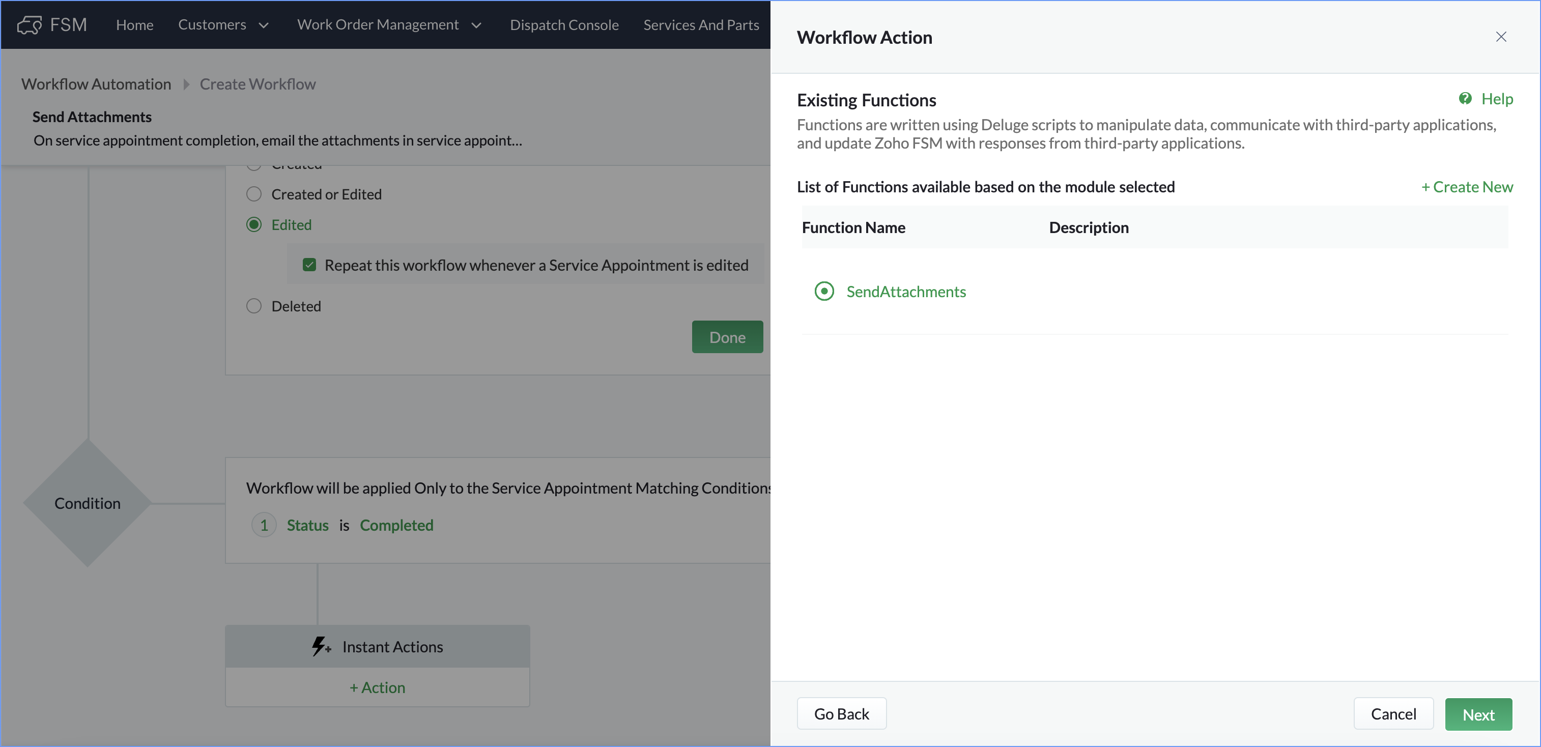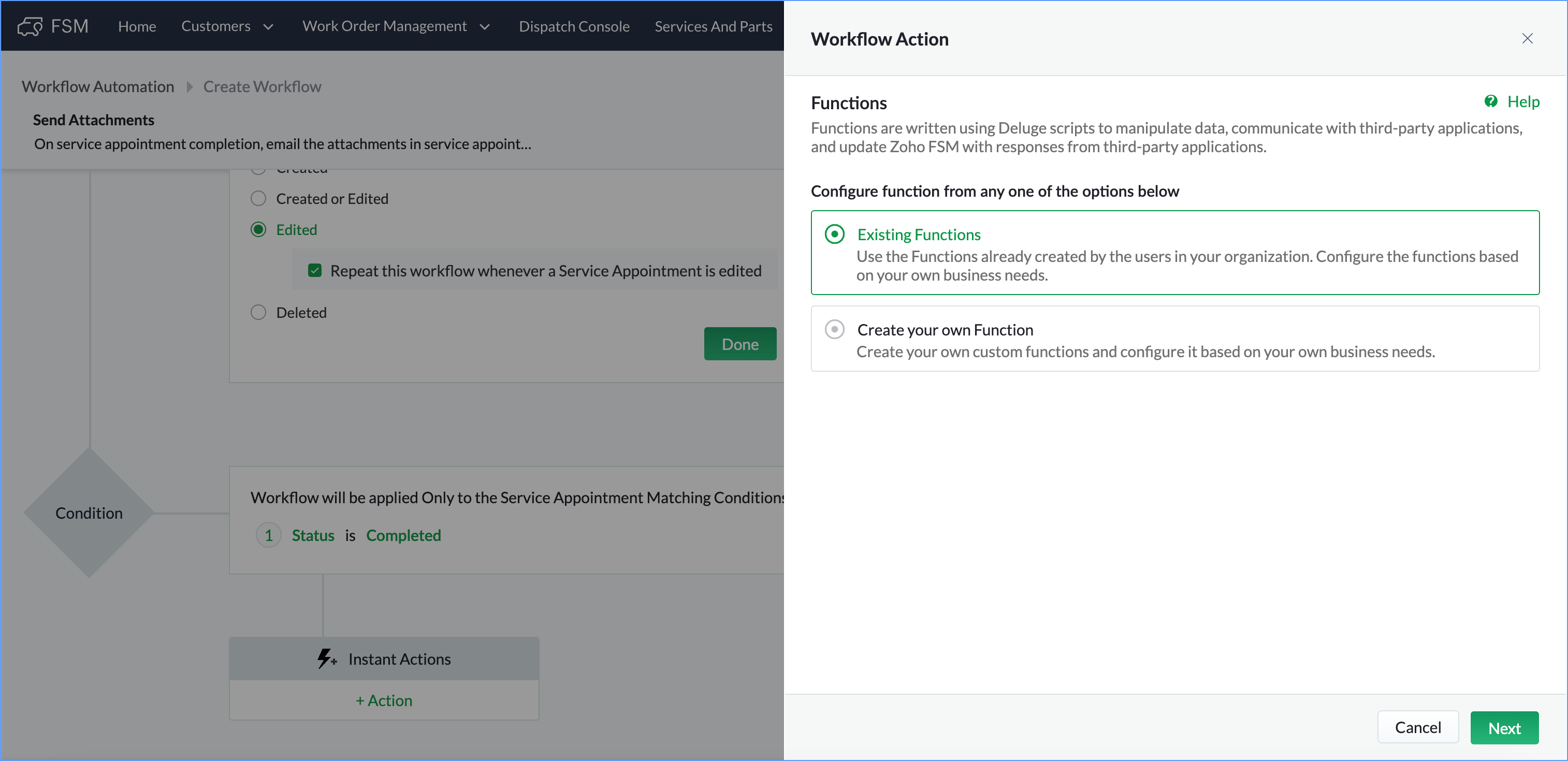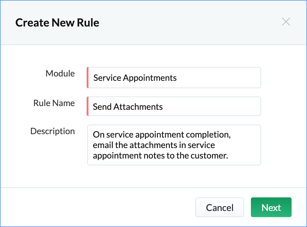id = service_appointment.get("id"); contactId = service_appointment.get("Contact").get("id"); contactResp = zoho.fsm.getRecordById("Contacts",contactId); email = contactResp.get("data").toMap().get("Email"); related_resp = zoho.fsm.getRelatedRecords("Notes","Service_Appointments",id); if(related_resp.isEmpty()) { info "No notes added !!!"; }else { related_resp_list = related_resp.get("data").toList(); for each each_related_resp in related_resp_list { each_related_resp_map = each_related_resp.toMap(); attachmentsResp = each_related_resp_map.get("$attachments"); if(attachmentsResp.isNull()){ info "No attachment present in the Note !!!"; }else{ attachments_list = each_related_resp_map.get("$attachments").toList(); for each attachment in attachments_list { file_id = attachment.get("$file_id"); fileResp = invokeurl [ url :"https://fsm.zoho.com/fsm/v1/files?file_id=" + file_id type :GET connection:"zfsm" ]; sendmail [ from :zoho.adminuserid to :email subject :"Zoho FSM Notes Attachments" message :"Please find attached the files in service appointment Notes." Attachments :file:fileResp ] } } } } |