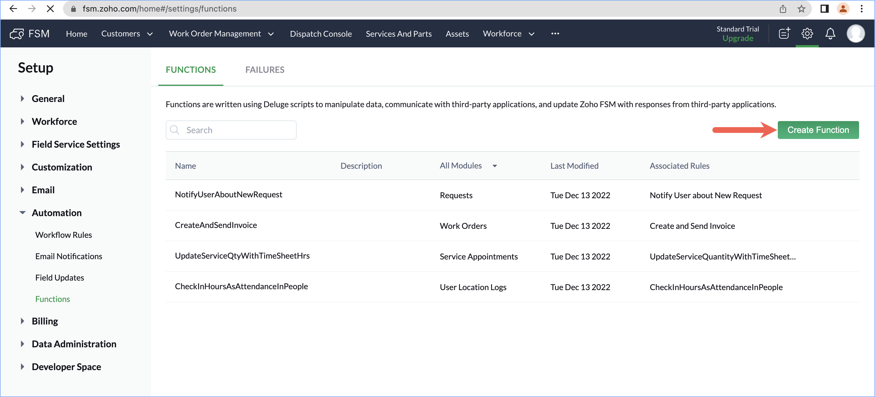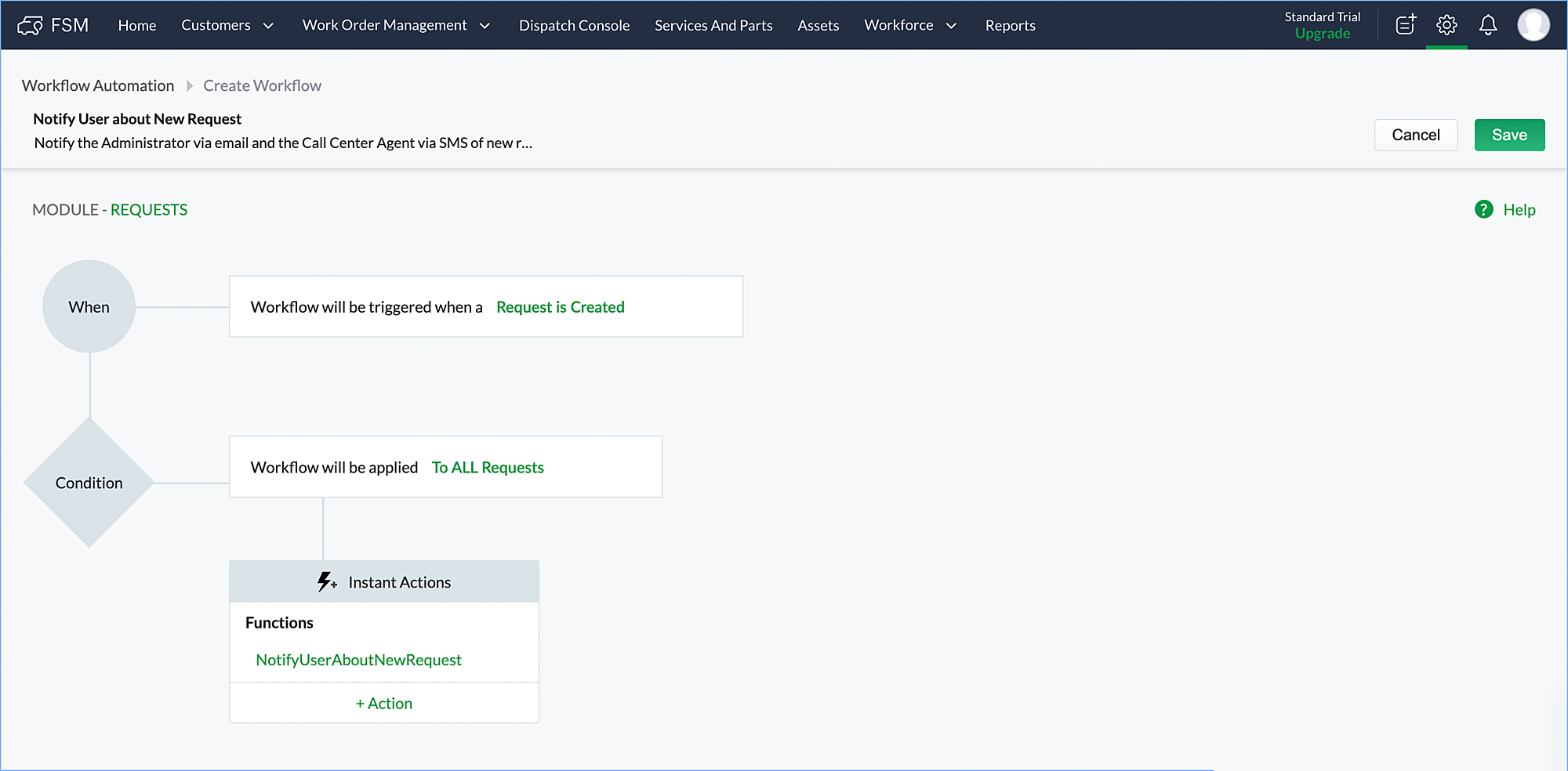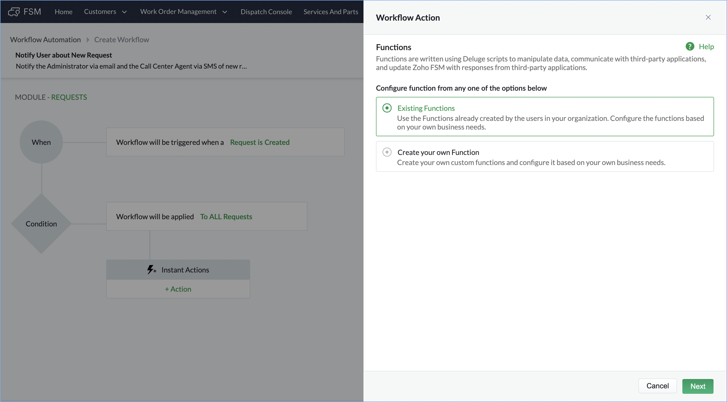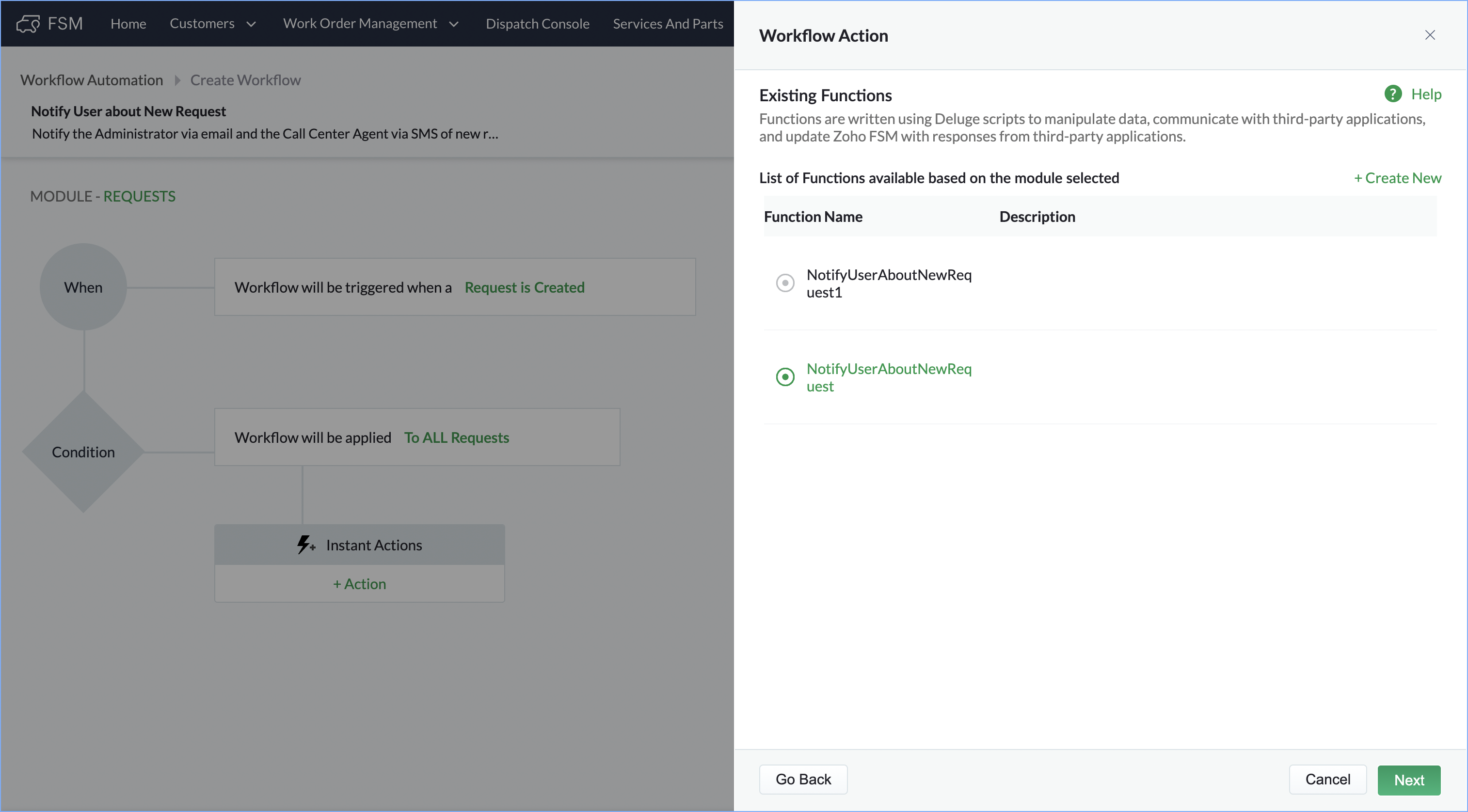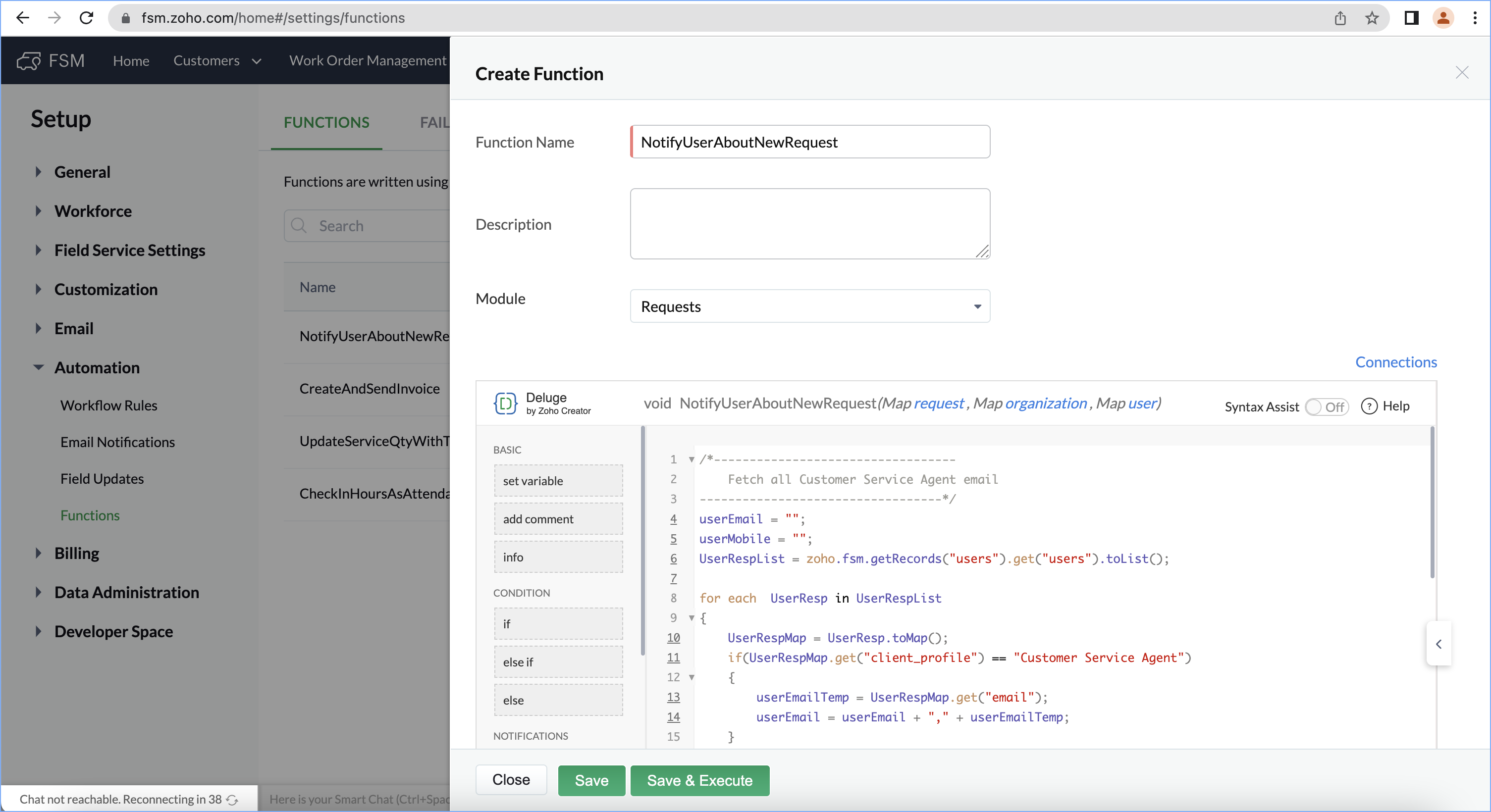 /*---------------------------------- Fetch all Customer Service Agent email ----------------------------------*/ userEmail = ""; userMobile = ""; UserRespList = zoho.fsm.getRecords("users").get("users").toList(); for each UserResp in UserRespList { UserRespMap = UserResp.toMap(); if(UserRespMap.get("client_profile") == "Customer Service Agent") { userEmailTemp = UserRespMap.get("email"); userEmail = userEmail + "," + userEmailTemp; } if(UserRespMap.get("client_profile") == "Administrator") { userMobile = UserRespMap.get("mobile"); } } if(userEmail != "") { userEmail = userEmail.subString(1,userEmail.length()); } /*---------------------------------- Fetch Request Detail ----------------------------------*/ requestId = request.get("id"); requestResp = zoho.fsm.getRecordById("Requests",requestId); requestData = requestResp.get("data").toMap(); Name = requestData.get("Summary"); id = requestData.get("id"); Phone = requestData.get("Phone"); Email = requestData.get("Email"); Priority = requestData.get("Priority"); Contact = requestData.get("Contact").toMap().get("name"); /*---------------------------------- construct message ----------------------------------*/ message = "Dear Customer Service Agents,<br><br> A new request has been added to FSM. Details are as follows: <br><br> Request Summary - " + Name + ", <br>Priority - " + Priority + ", <br>Customer name - " + Contact + ",<br> Customer Email - " + Email + ",<br> Customer Phone - " + Phone + ",<br> FSM Link - https://fsm.zoho.com/home#/tab/Requests/" + id + "<br><br>Kindly check the request and do the needful. <br><br>Thanks & Regard,<br>Admin"; /*---------------------------------- Send Mail ----------------------------------*/ sendmail [ from :zoho.adminuserid to :userEmail subject :"New Request received in FSM" message :message ] /*---------------------------------- Send SMS ----------------------------------*/ bodymap = Map(); bodymap.put("To",userMobile); bodymap.put("From","+15139958354"); bodymap.put("Body",message); //Replace {AccountSid} with actual value sms_response = invokeurl [ type :POST parameters:bodymap connection:"twilio" ]; info sms_response; |
