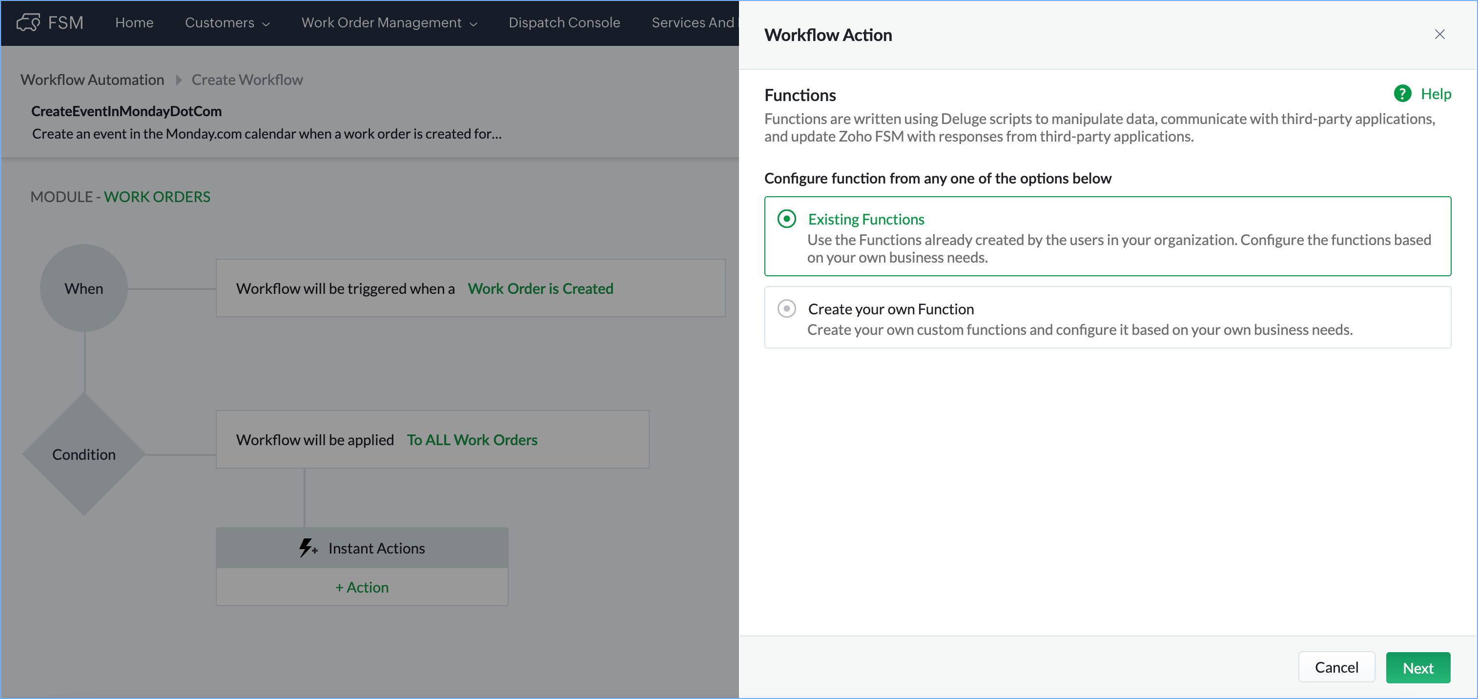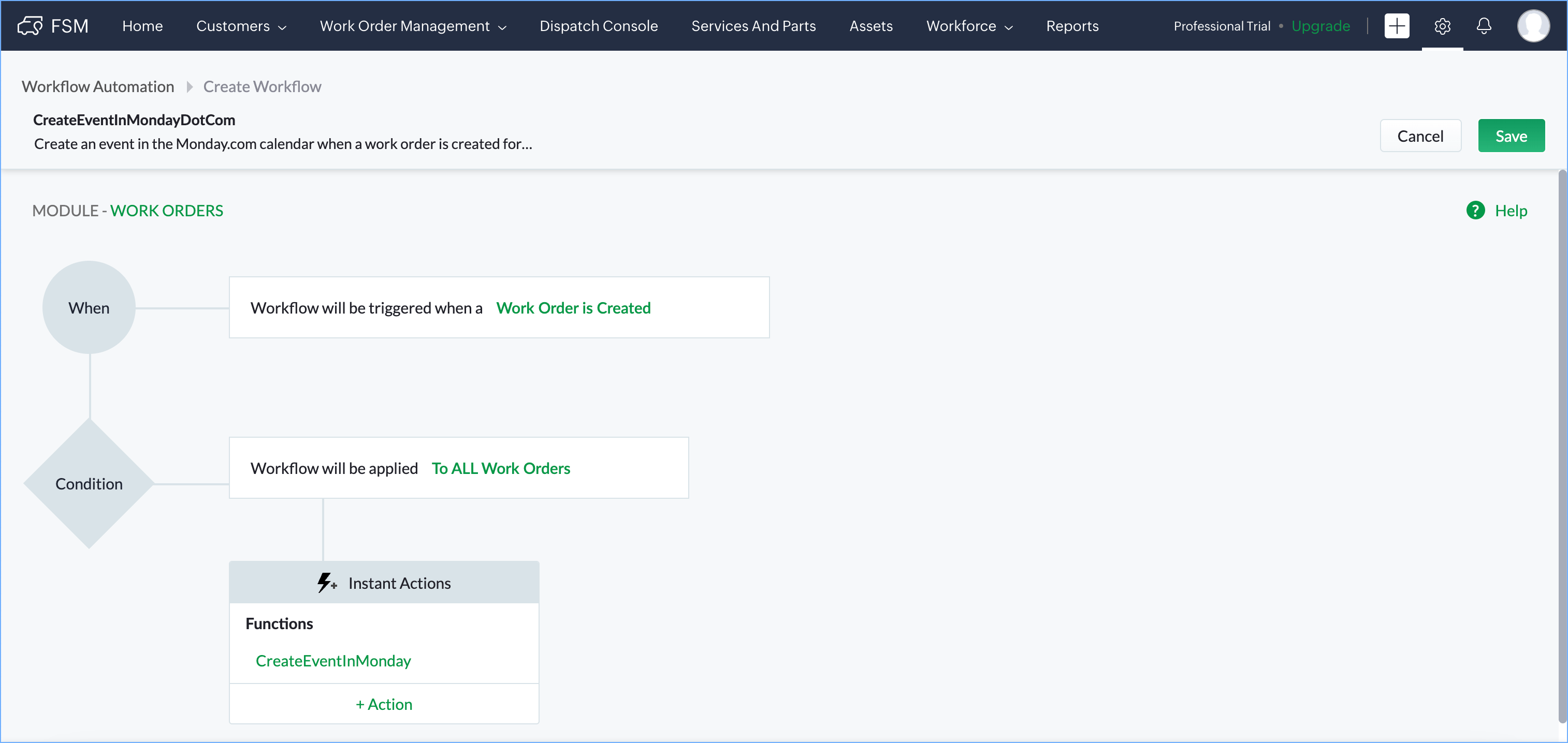 try { board_id = "<Your board ID>"; //info work_order; evdate = ""; Due_Date = work_order.get("Due_Date"); if(!Due_Date.isNull() && !Due_Date.isEmpty()) { evdate = Due_Date; } else { predate1 = work_order.get("Preference").get("Preferred_Date_1"); if(!predate1.isNull() && !predate1.isEmpty()) { evdate = predate1; } else { predate2 = work_order.get("Preference").get("Preferred_Date_2"); if(!predate2.isNull() && !predate2.isEmpty()) { evdate = predate2; } else { evdate = ""; } } } info evdate; wo_name = work_order.get("Name"); summary_name = work_order.get("Summary"); header_data = Map(); header_data.put("Authorization","<API Token>"); header_data.put("Content-Type","application/json"); Territory_name = work_order.get("Territory").get("name").toString(); info Territory_name; if(evdate != "") { event = {"query":"mutation {create_item (board_id:" + board_id + "item_name: \"" + wo_name + "\", column_values: \"{\\\"date\\\":\\\"" + evdate + "\\\", \\\"text\\\":\\\"My Text\\\"}\") {id}}"}; info event; response = invokeurl [ url :"https://api.monday.com/v2" type :POST parameters:event headers:header_data ]; info response; item_id = response.toMap().get("data").toMap().get("create_item").get("id"); data = {"query":"mutation {change_multiple_column_values(item_id:" + item_id + ", board_id:" + board_id + ", column_values: \"{\\\"date\\\" : {\\\"date\\\" : \\\"" + evdate + "\\\", \\\"time\\\" : \\\"18:00:00\\\"}}\") {id}}"}; info data; response = invokeurl [ type :POST parameters:data headers:header_data ]; info response; } else { sendmail [ from :zoho.adminuserid to :zoho.adminuserid subject :"Event is Not created" message :" Date field is Mandatory for event creation" ] } } catch (e) { info e; sendmail [ from :zoho.adminuserid to :zoho.adminuserid subject :"Event is Not created" message :e ] } |