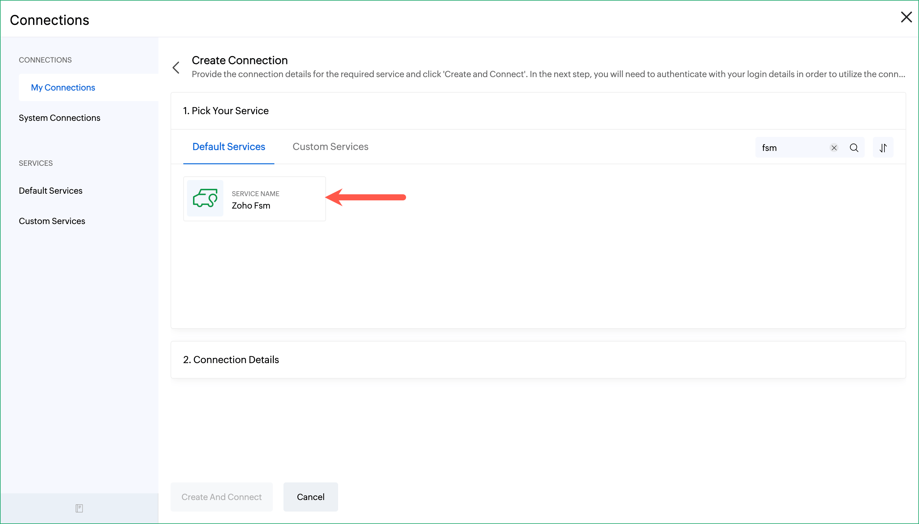 To create a connection for Zoho FSM that can be used in Zoho Books for invoking the Zoho FSM APIs, do the following: