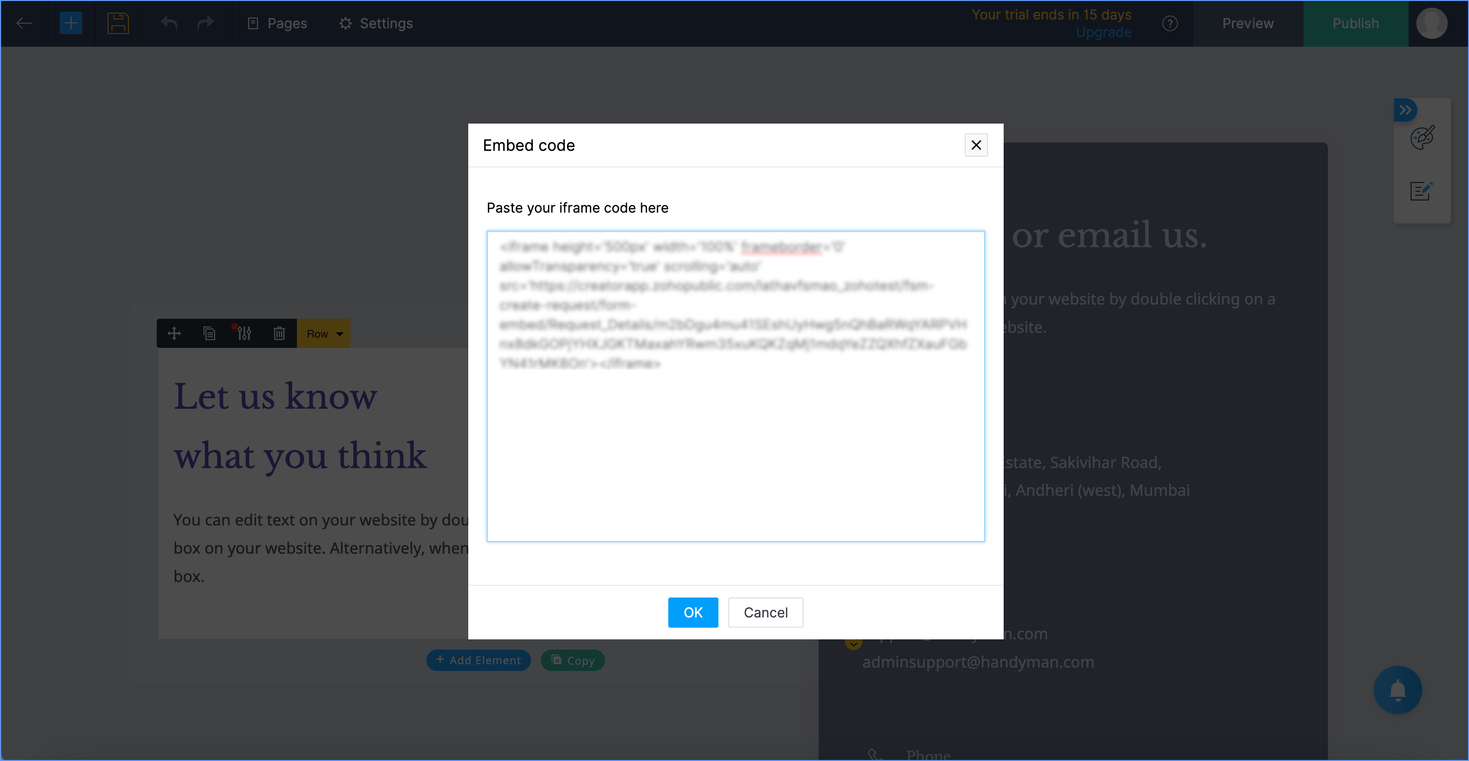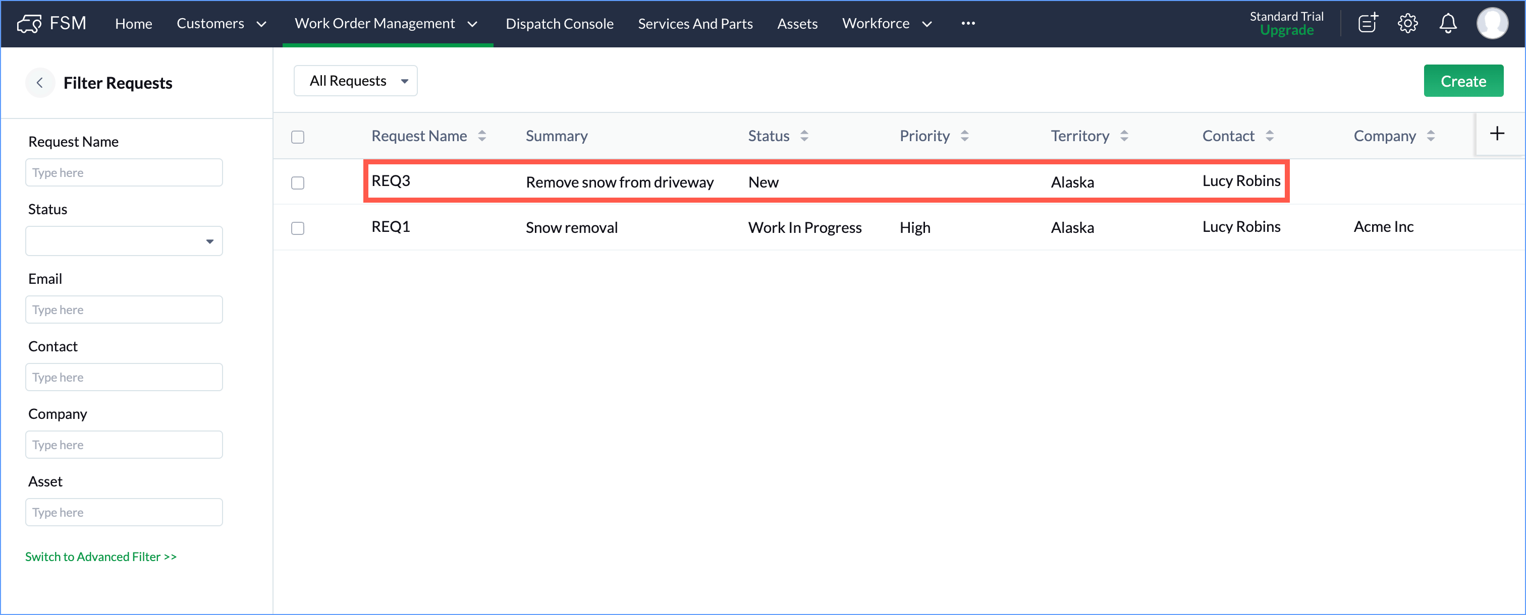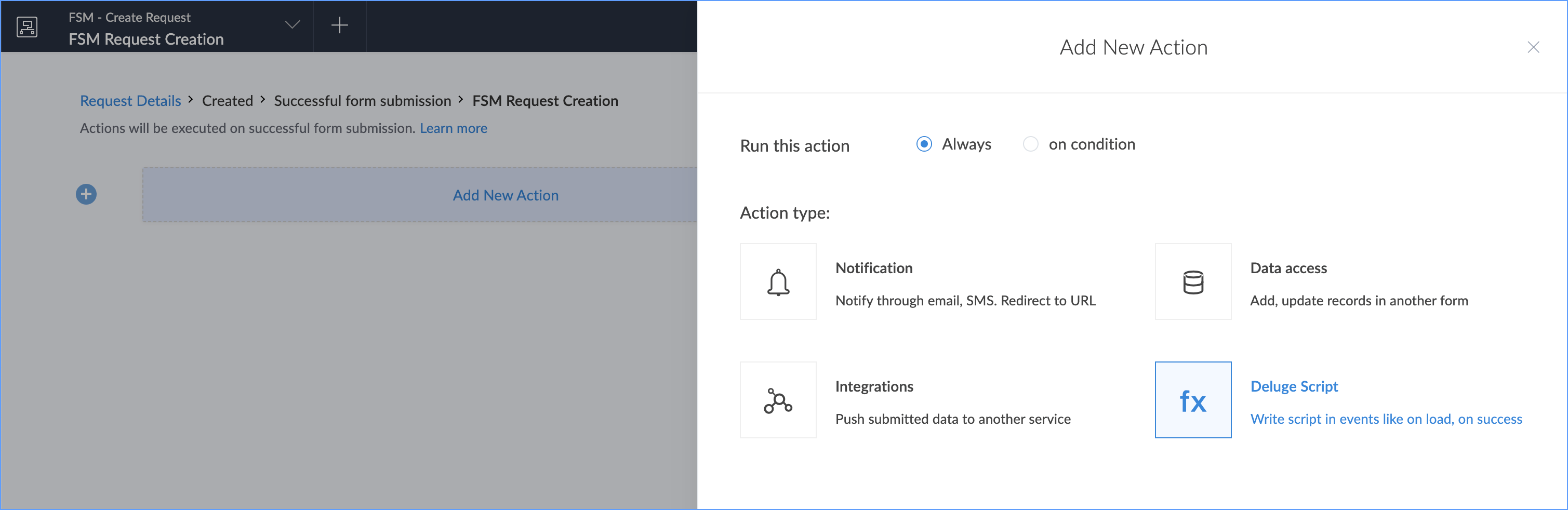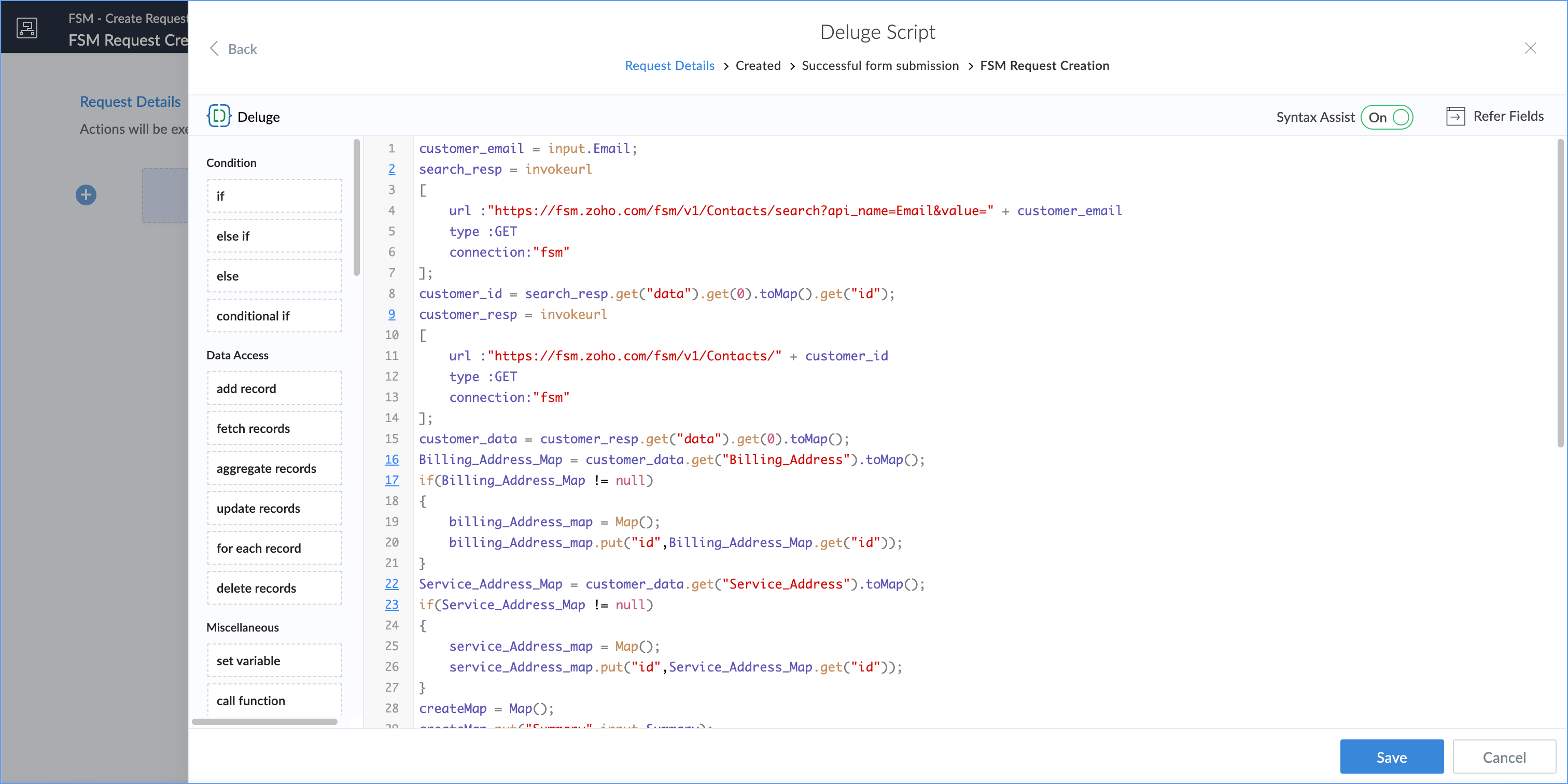 customer_email = input.Email; search_resp = invokeurl [ url :"https://fsm.zoho.com/fsm/v1/Contacts/search?api_name=Email&value=" + customer_email type :GET connection:"fsm" ]; customer_id = search_resp.get("data").get(0).toMap().get("id"); customer_resp = invokeurl [ url :"https://fsm.zoho.com/fsm/v1/Contacts/" + customer_id type :GET connection:"fsm" ]; customer_data = customer_resp.get("data").get(0).toMap(); Billing_Address_Map = customer_data.get("Billing_Address").toMap(); if(Billing_Address_Map != null) { billing_Address_map = Map(); billing_Address_map.put("id",Billing_Address_Map.get("id")); } Service_Address_Map = customer_data.get("Service_Address").toMap(); if(Service_Address_Map != null) { service_Address_map = Map(); service_Address_map.put("id",Service_Address_Map.get("id")); } territoryResp = invokeurl [ url :"https://fsm.zoho.com/fsm/v1/Territories" type :GET connection:"fsm" ]; terrId = territoryResp.get("data").get(0).get("id"); createMap = Map(); createMap.put("Summary",input.Summary); createMap.put("Contact",customer_id); createMap.put("Priority",input.Priority); createMap.put("Billing_Address",billing_Address_map); createMap.put("Service_Address",service_Address_map); createMap.put("Phone",input.Phone_Number); Preference_Map = Map(); Preference_Map.put("Preferred_Time",input.Preferred_Time); Preference_Map.put("Preference_Note",input.Preference_Note); createMap.put("Preference",Preference_Map); createMap.put("Territory",terrId); createList = list(); createList.add(createMap); NewCreateMap = Map(); NewCreateMap.put("data",createList); create_resp = invokeurl [ url :"https://fsm.zoho.com/fsm/v1/Requests" type :POST parameters:NewCreateMap.toString() connection:"fsm" ]; info create_resp; |