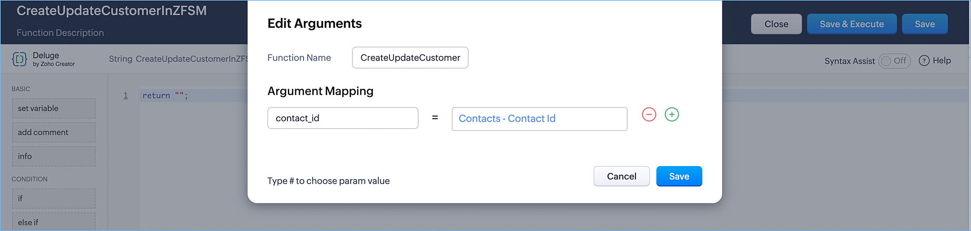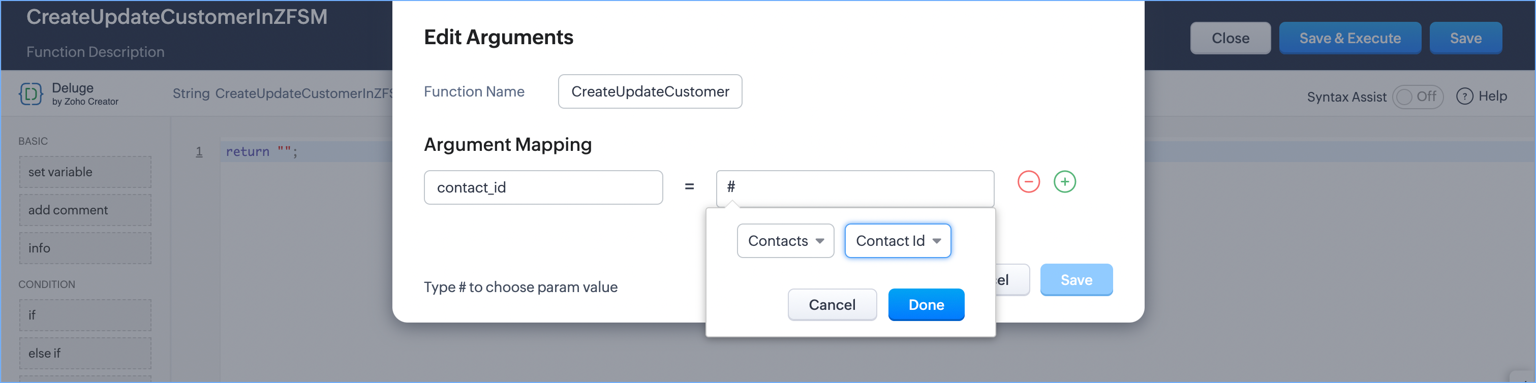 - For the argument value, type # and select Contacts - Contact Id and click Done.