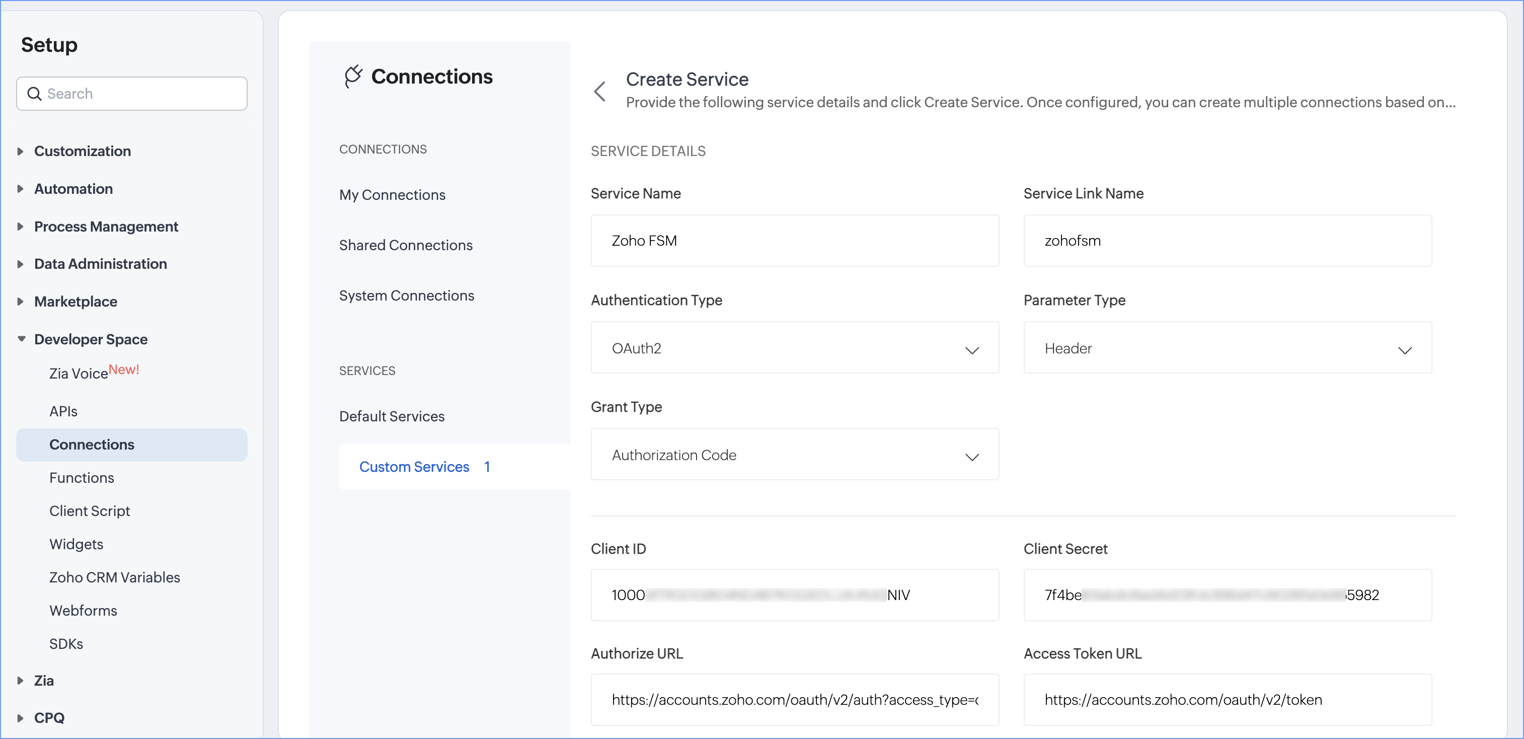 To create a connection for Zoho FSM that can be used in Zoho CRM for invoking the Zoho FSM APIs, do the following: