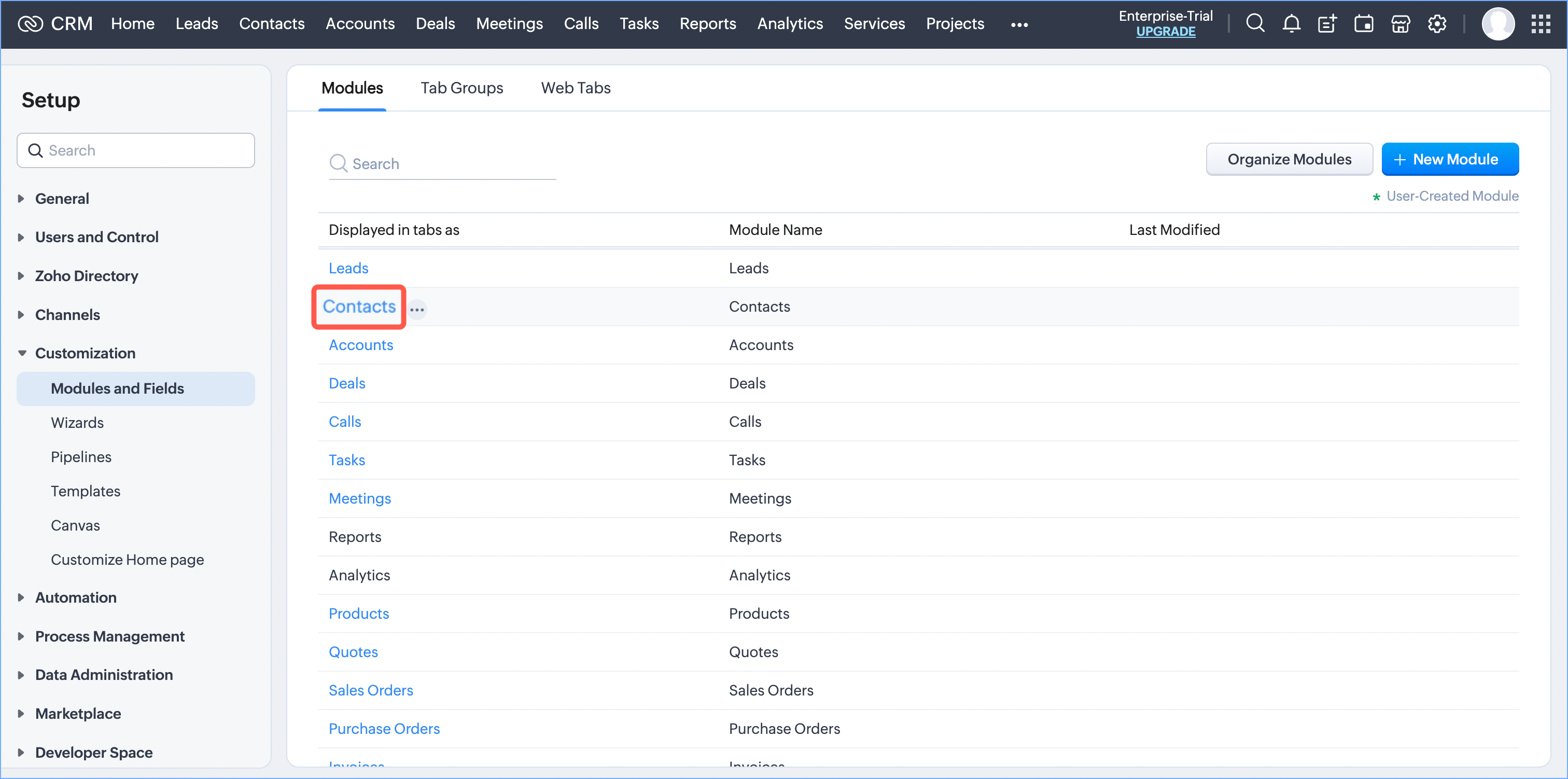 - Navigate to Setup > Customization > Modules and Fields and click the Contacts module.