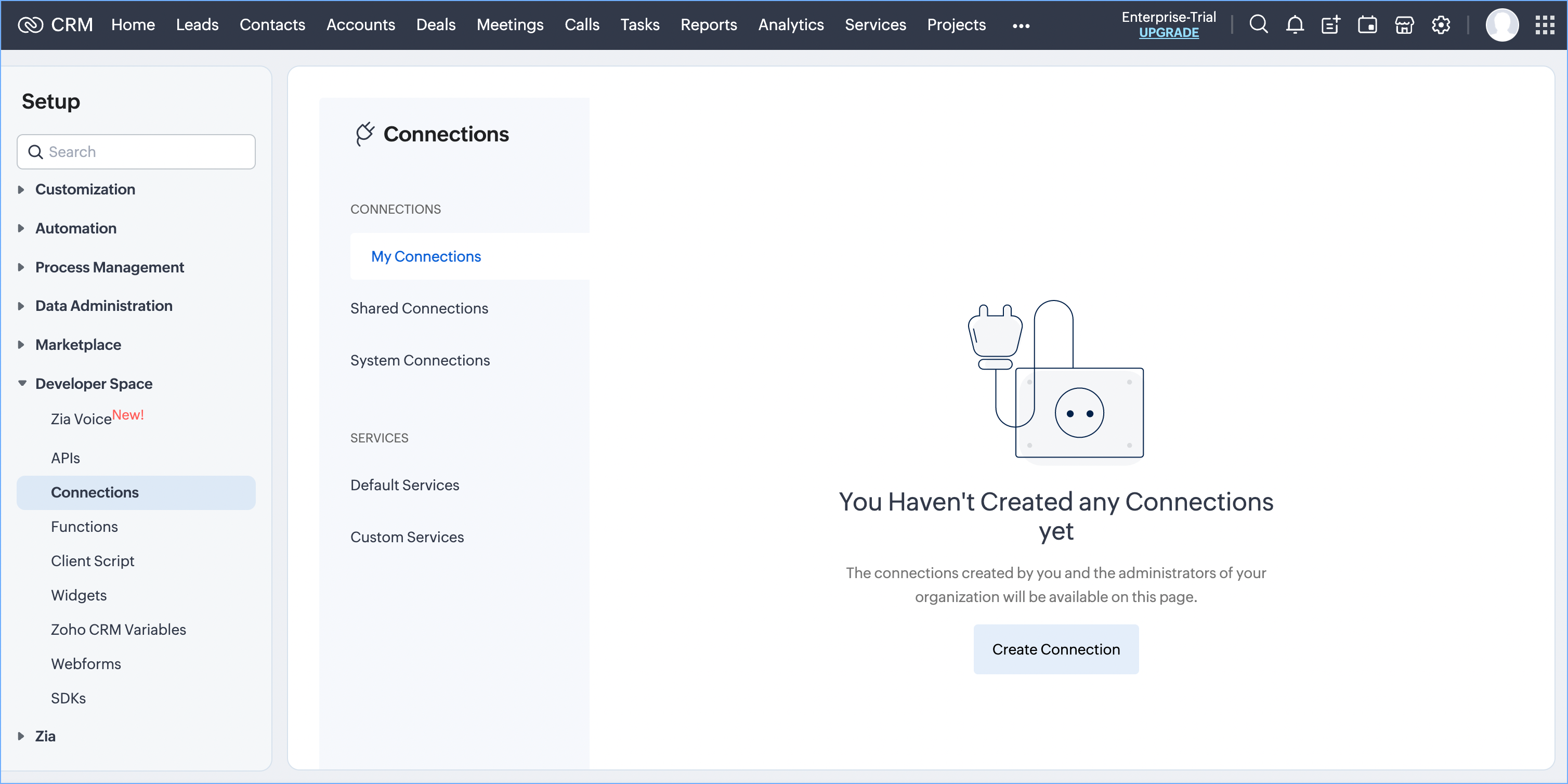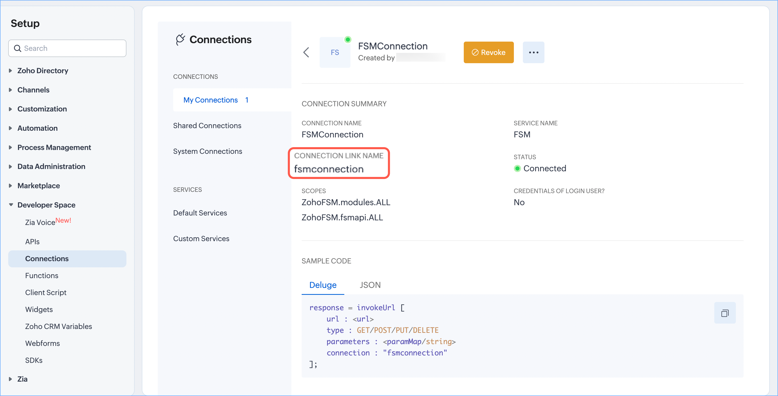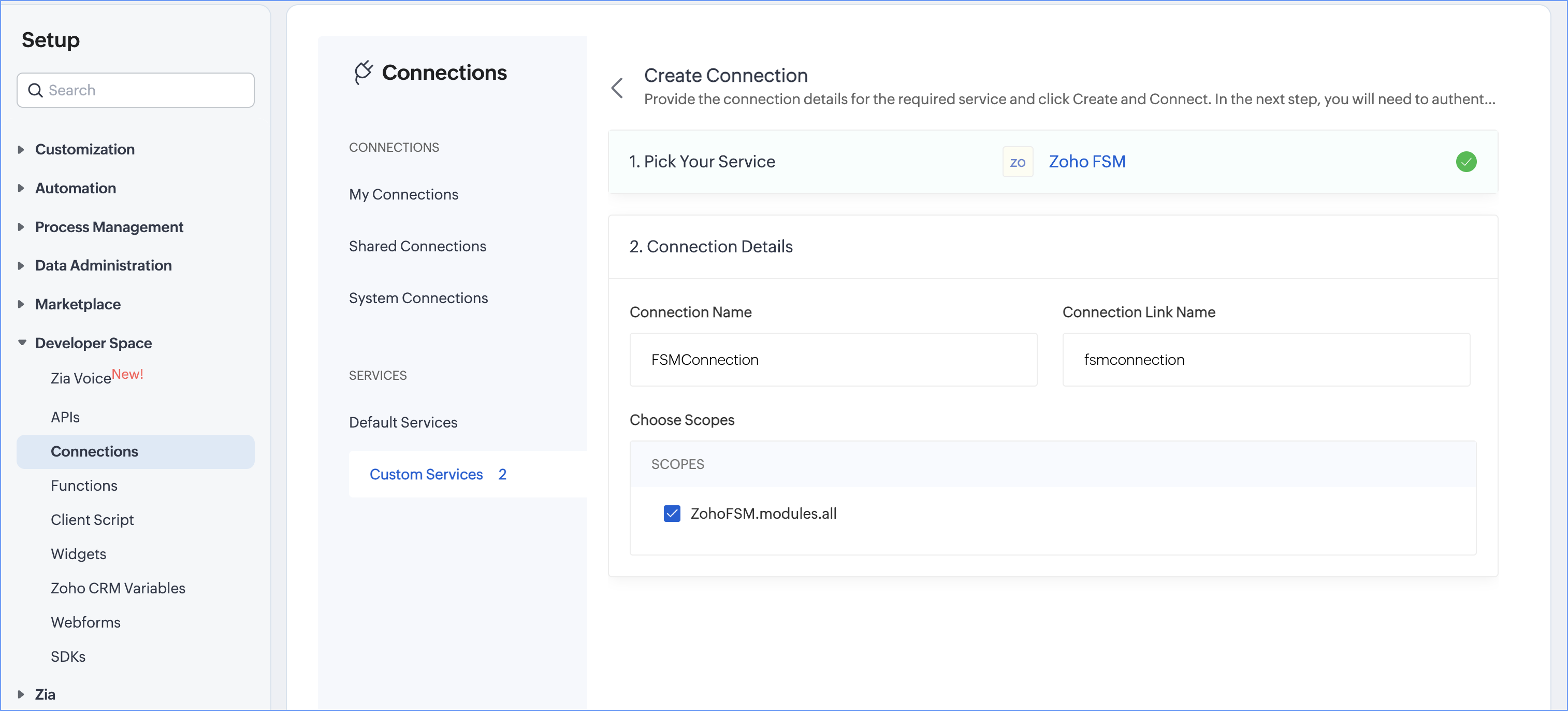 Step 1: Create a connection for Zoho FSM in Zoho CRM