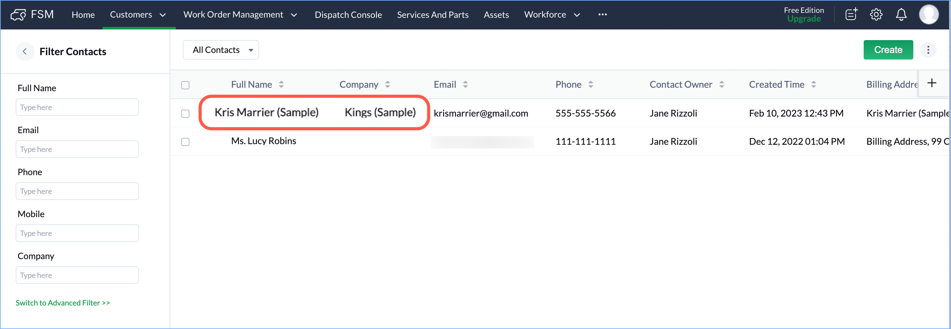 A new Contact and the associated Company (if present) will be created in FSM if not already present. If the Contact is already present, then the details will be updated.