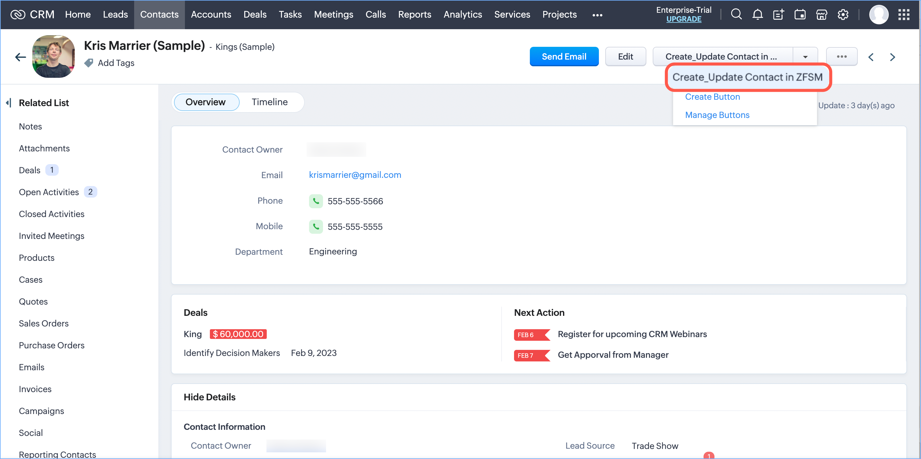 Click the Create_Update Contact in ZFSM button in a Contacts record.