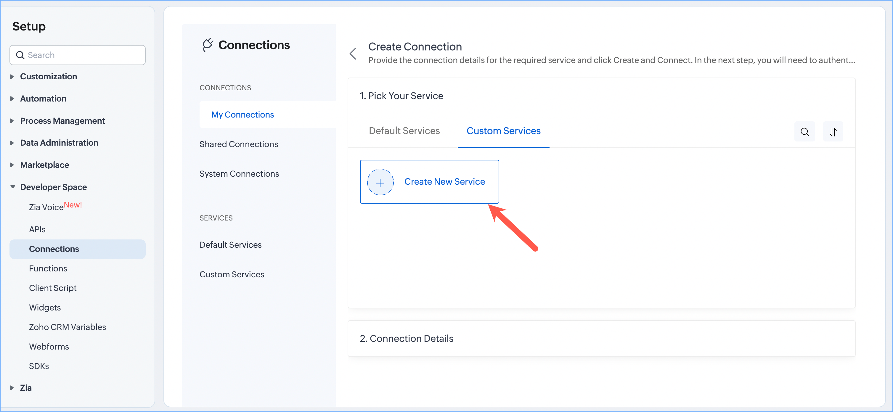 - In the Create Connection page, select the Custom Services tab and click Create New Service.