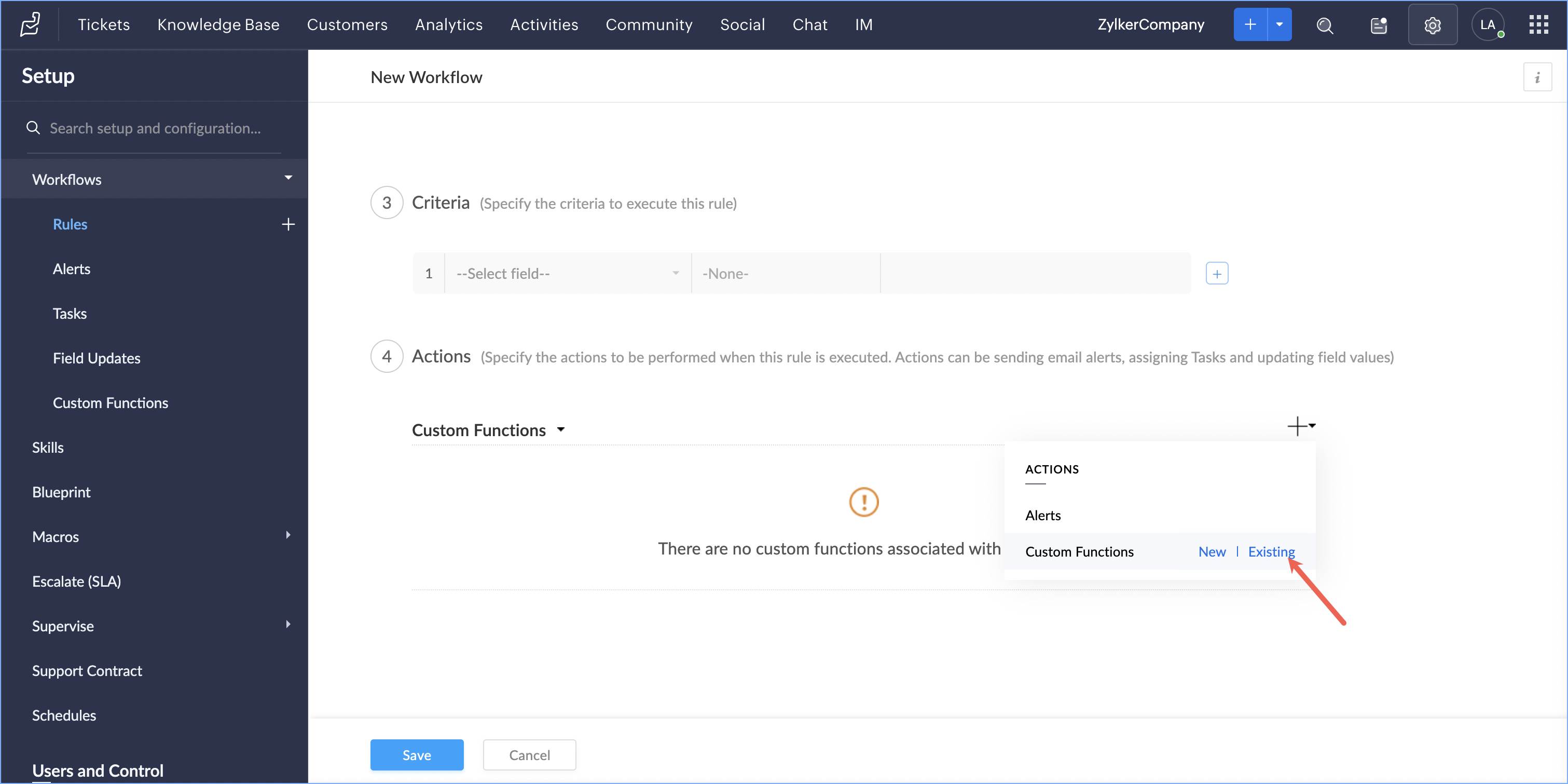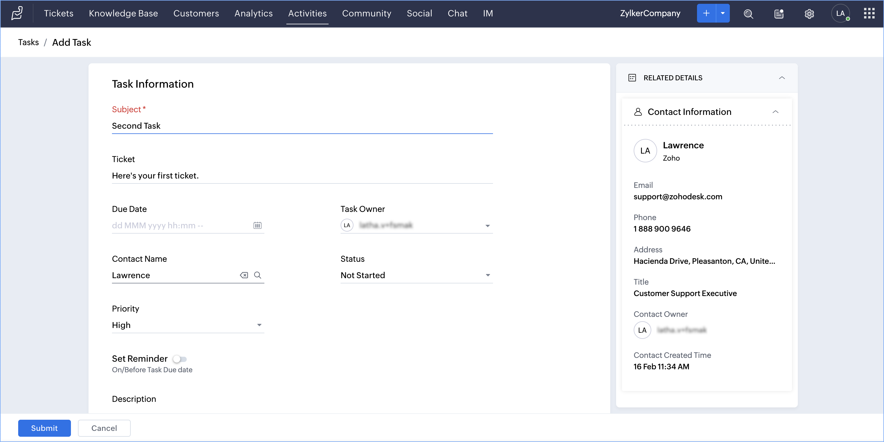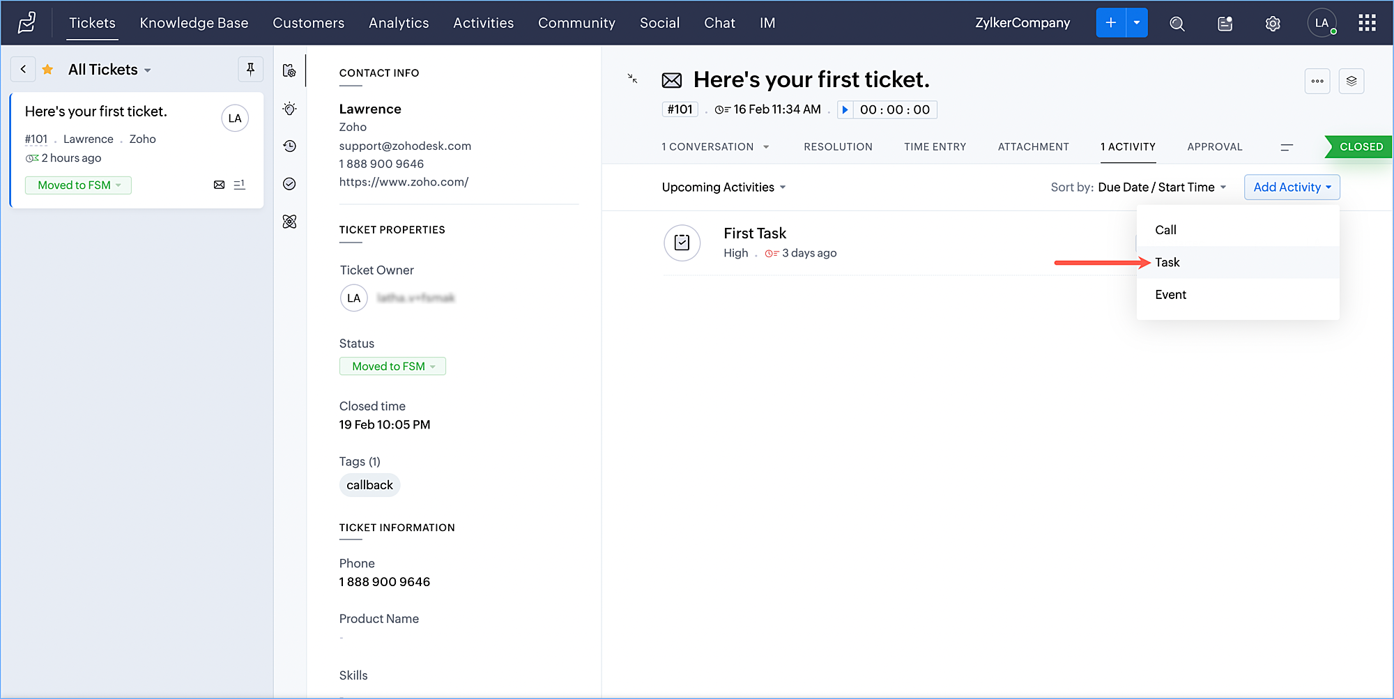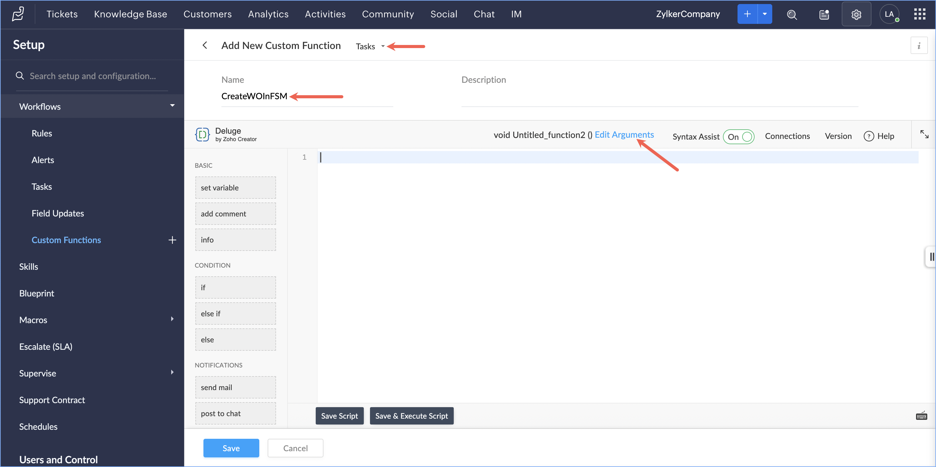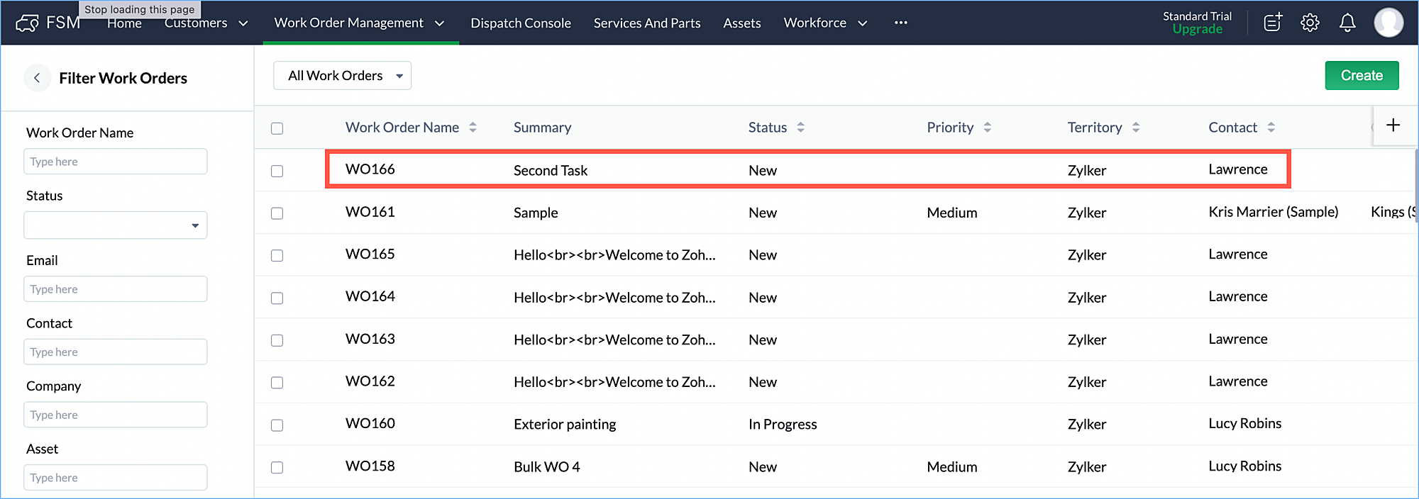 try { resp = zoho.desk.getRecordById("<OrgId>","tasks",task_id); ticket_id = resp.get("ticketId"); ticket_resp = zoho.desk.getRecordById("<OrgId>","tickets",ticket_id); description = resp.get("subject"); customer_email = ticket_resp.get("email"); search_resp = invokeurl [ url :"https://fsm.zoho.com/fsm/v1/Contacts/search?api_name=Email&value=" + customer_email type :GET connection:"fsmconnection" ]; if(search_resp == "" || search_resp == null) { desk_contact_search_resp = zoho.desk.searchRecords("<OrgId>","Contacts",{"email":customer_email}); desk_contact_search_data = desk_contact_search_resp.get("data").toMap(); contact_create_Map = Map(); contact_create_Map.put("Salutation","Mr."); contact_create_Map.put("First_Name",desk_contact_search_data.get("firstName")); contact_create_Map.put("Last_Name",desk_contact_search_data.get("lastName")); contact_create_Map.put("Email",desk_contact_search_data.get("email")); contact_create_Map.put("Phone",desk_contact_search_data.get("phone")); contact_create_Map.put("Mobile",desk_contact_search_data.get("mobile")); contact_Service_Address_Map = Map(); contact_Service_Address_Map.put("Address_Name",desk_contact_search_data.get("lastName") + " Shipping Address"); contact_Service_Address_Map.put("Street_1",desk_contact_search_data.get("street")); contact_Service_Address_Map.put("City",desk_contact_search_data.get("city")); contact_Service_Address_Map.put("State",desk_contact_search_data.get("state")); contact_Service_Address_Map.put("Zip_Code",desk_contact_search_data.get("zip")); contact_Service_Address_Map.put("Country",desk_contact_search_data.get("country")); contact_Billing_Address_Map = Map(); contact_Billing_Address_Map.put("Address_Name",desk_contact_search_data.get("lastName") + " Billing Address"); contact_Billing_Address_Map.put("Street_1",desk_contact_search_data.get("street")); contact_Billing_Address_Map.put("City",desk_contact_search_data.get("city")); contact_Billing_Address_Map.put("State",desk_contact_search_data.get("state")); contact_Billing_Address_Map.put("Zip_Code",desk_contact_search_data.get("zip")); contact_Billing_Address_Map.put("Country",desk_contact_search_data.get("country")); contact_create_Map.put("Service_Address",contact_Service_Address_Map); contact_create_Map.put("Billing_Address",contact_Billing_Address_Map); cr_resp = zoho.fsm.createRecord("Contacts",contact_create_Map); customer_id = cr_resp.get("data").toMap().get("Contacts").toMap().get("id"); } else { customer_id = search_resp.get("data").toMap().get("id"); } customer_resp = zoho.fsm.getRecordById("Contacts",customer_id); customer_data = customer_resp.get("data").toMap(); Billing_Address_Map = customer_data.get("Billing_Address").toMap(); if(Billing_Address_Map != null) { billing_Address_map = Map(); billing_Address_map.put("id",Billing_Address_Map.get("id")); billing_Address_map.put("Billing_Street_1",Billing_Address_Map.get("Street_1")); billing_Address_map.put("Billing_Street_2",Billing_Address_Map.get("Street_2")); billing_Address_map.put("Billing_City",Billing_Address_Map.get("City")); billing_Address_map.put("Billing_State",Billing_Address_Map.get("State")); billing_Address_map.put("Billing_Country",Billing_Address_Map.get("Country")); billing_Address_map.put("Billing_Zip_Code",Billing_Address_Map.get("Zip_Code")); } Service_Address_Map = customer_data.get("Service_Address").toMap(); if(Service_Address_Map != null) { service_Address_map = Map(); service_Address_map.put("id",Service_Address_Map.get("id")); service_Address_map.put("Service_Street_1",Service_Address_Map.get("Street_1")); service_Address_map.put("Service_Street_2",Service_Address_Map.get("Street_2")); service_Address_map.put("Service_City",Service_Address_Map.get("City")); service_Address_map.put("Service_State",Service_Address_Map.get("State")); service_Address_map.put("Service_Country",Service_Address_Map.get("Country")); service_Address_map.put("Service_Zip_Code",Service_Address_Map.get("Zip_Code")); } Service_Line_Items_List = list(); Service_Line_Items_Map = Map(); servResp = zoho.fsm.searchRecordsByField("Service_And_Parts","Type","Service",Map(),"fsmconnection"); service_id = servResp.get("data").toMap().get("id"); Service_Line_Items_Map.put("Service",service_id); Service_Line_Items_Map.put("Quantity",1); Service_Line_Items_Map.put("Sequence",1); Service_Line_Items_Map.put("Contact",customer_id); Service_Line_Items_List.add(Service_Line_Items_Map); terrResp = zoho.fsm.getRecords("Territories"); terrId = terrResp.get("data").toMap().get("id"); createMap = Map(); createMap.put("Summary",description); createMap.put("Contact",customer_id); createMap.put("Type","Service"); createMap.put("Billing_Address",billing_Address_map); createMap.put("Service_Address",service_Address_map); createMap.put("Territory",terrId); createMap.put("Service_Line_Items",Service_Line_Items_List); response = zoho.fsm.createRecord("Work_Orders",createMap); info response; } catch (err) { sendmail [ from :zoho.adminuserid to :zoho.adminuserid subject :"Error creating work order from task" message :err ] } |