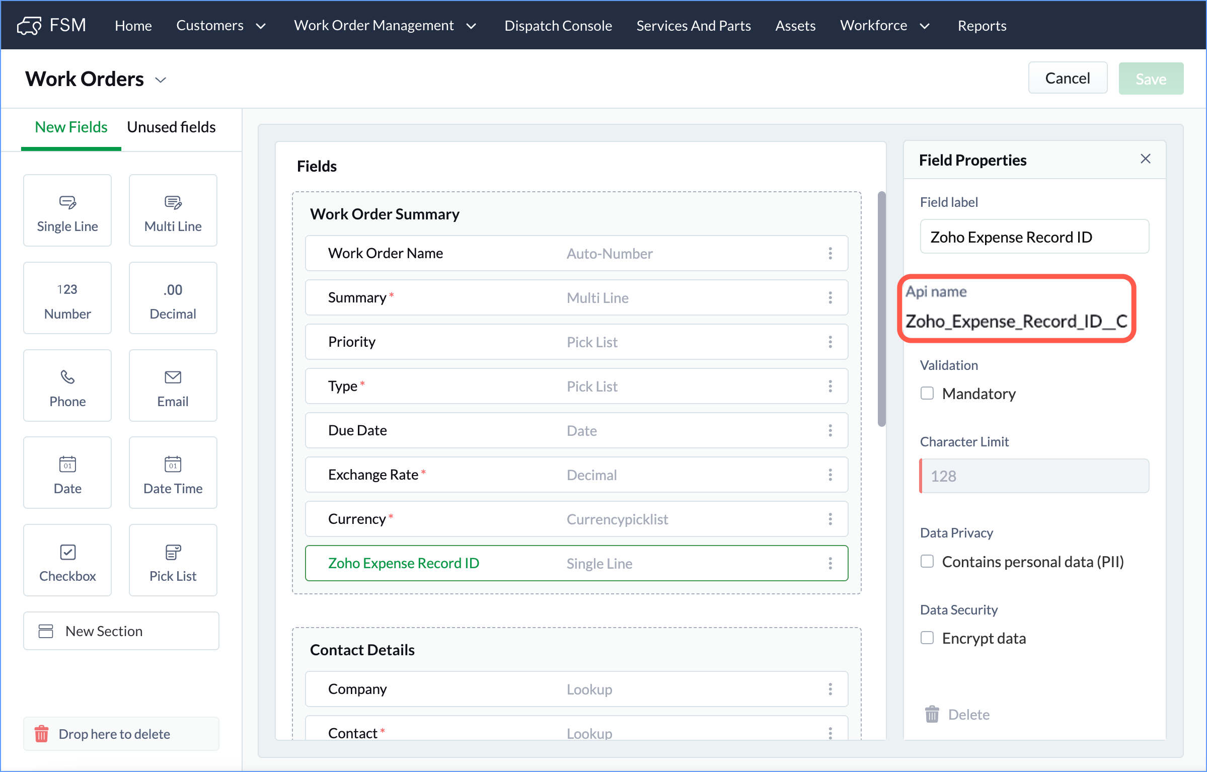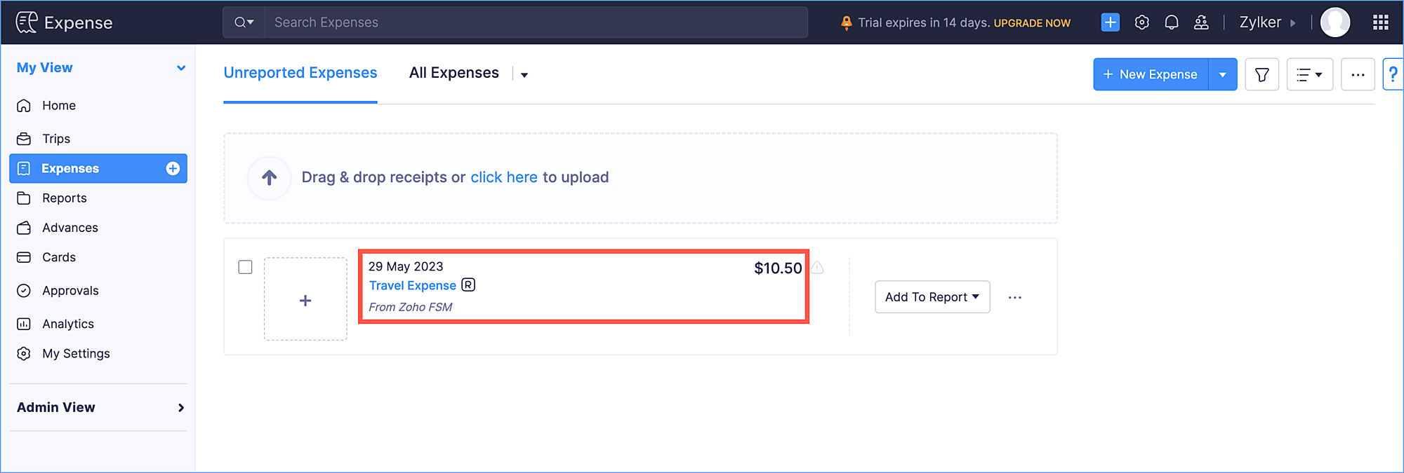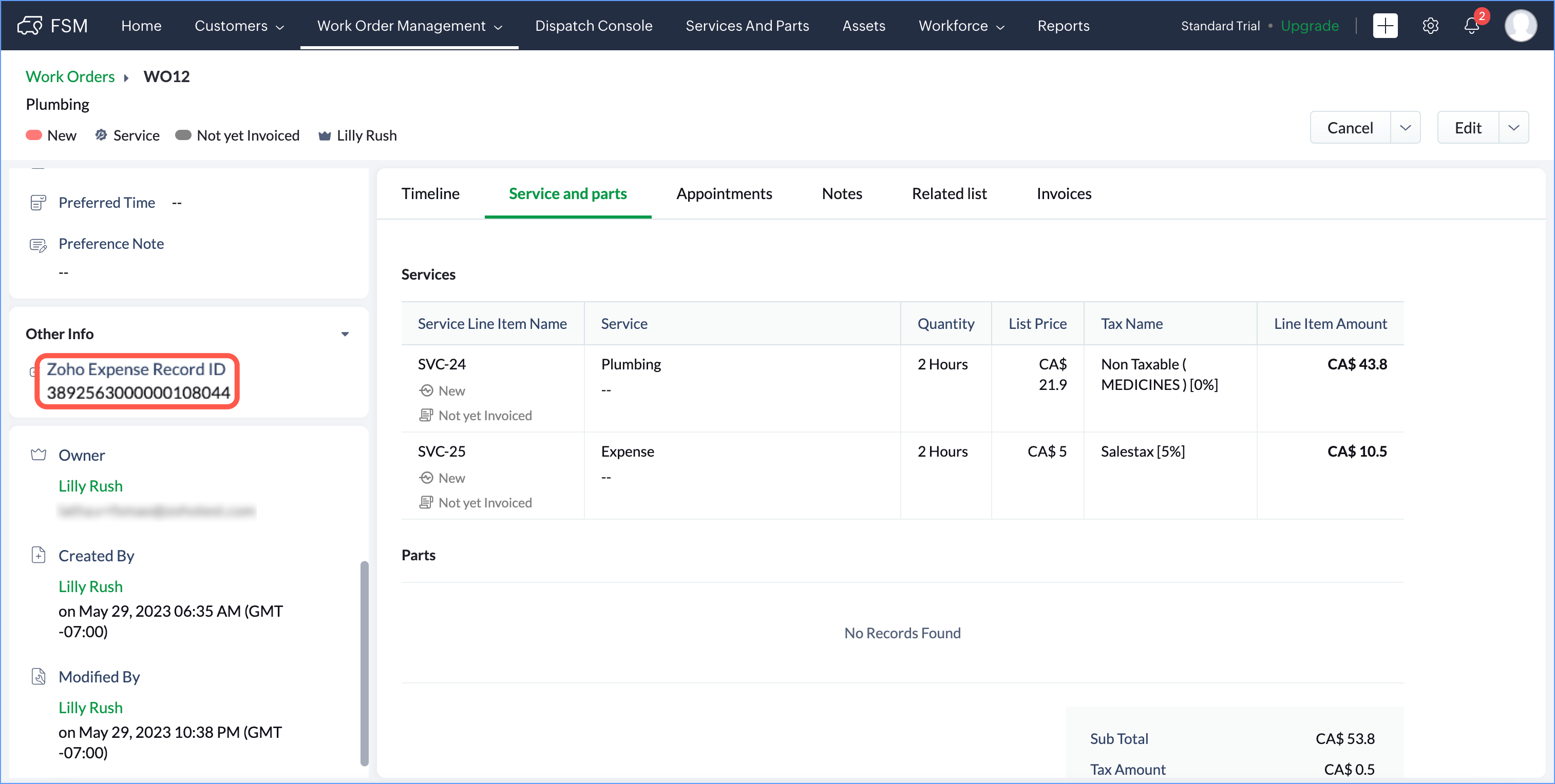 work_order_id = work_order.get("id"); Amount = 0; Service_Line_Items_List = work_order.get("Service_Line_Items").toList(); for each Service_Line_Items in Service_Line_Items_List { Service_Line_Items_Map = Service_Line_Items.toMap(); if(Service_Line_Items_Map.get("Service").toMap().get("name") == "Expense") { //Get Currency Id headers_data = Map(); headers_data.put("X-com-zoho-expense-organizationid","<orgId>"); response = invokeurl [ type :GET headers:headers_data connection:"zexpense" ]; currencyList = response.get("currencies").toList(); for each eachCurrencyList in currencyList { CurrencyMap = eachCurrencyList.toMap(); if(CurrencyMap.get("currency_code") == "USD") { currency_id = CurrencyMap.get("currency_id"); } } //Get Category Id headers_data_1 = Map(); headers_data_1.put("X-com-zoho-expense-organizationid","<orgId>"); response_1 = invokeurl [ type :GET headers:headers_data_1 connection:"zexpense" ]; expense_categories_list = response_1.get("expense_accounts").toList(); for each each_expense_categories_list in expense_categories_list { expense_categories_map = each_expense_categories_list.toMap(); //Use the Expense Category - Travel Expense if(expense_categories_map.get("category_name") == "Travel Expense") { category_id = expense_categories_map.get("category_id"); } } Amount = Amount + Service_Line_Items_Map.get("Line_Item_Amount"); Created_Time = Service_Line_Items_Map.get("Created_Time").toString(); Create_Date = Created_Time.getPrefix("T"); lineItemList = list(); lineItemMap = Map(); lineItemMap.put("category_id",category_id); lineItemMap.put("amount",Amount); lineItemMap.put("description","From Zoho FSM"); lineItemList.add(lineItemMap); createMap = Map(); createMap.put("currency_id",currency_id); createMap.put("date",Create_Date); createMap.put("is_reimbursable",true); createMap.put("line_items",lineItemList); headers_data_2 = Map(); headers_data_2.put("X-com-zoho-expense-organizationid","<orgId>"); response_2 = invokeurl [ type :POST parameters:createMap.toString() headers:headers_data_2 connection:"zexpense" content-type:"application/json" ]; expense_id = response_2.get("expenses").toMap().get("expense_id").toString(); updateResp = zoho.fsm.updateRecord("Work_Orders",work_order_id,{"<custom_field_Api_name>":expense_id}); } } |