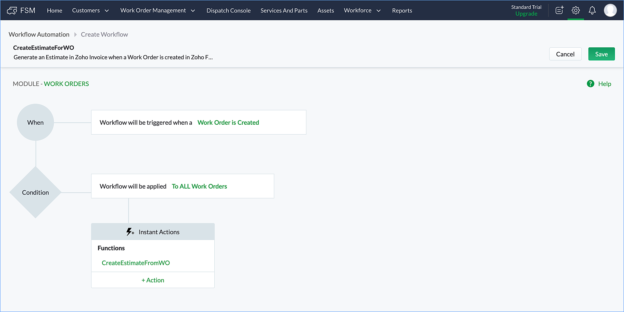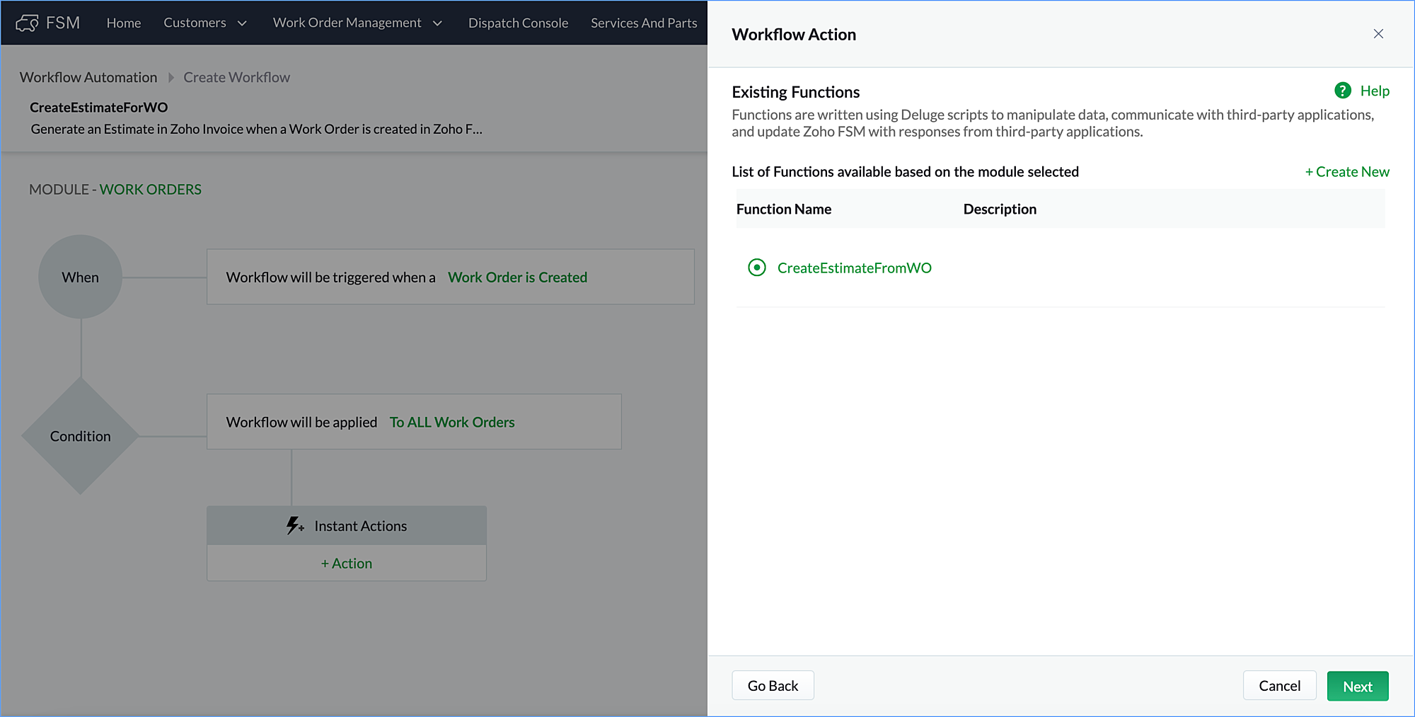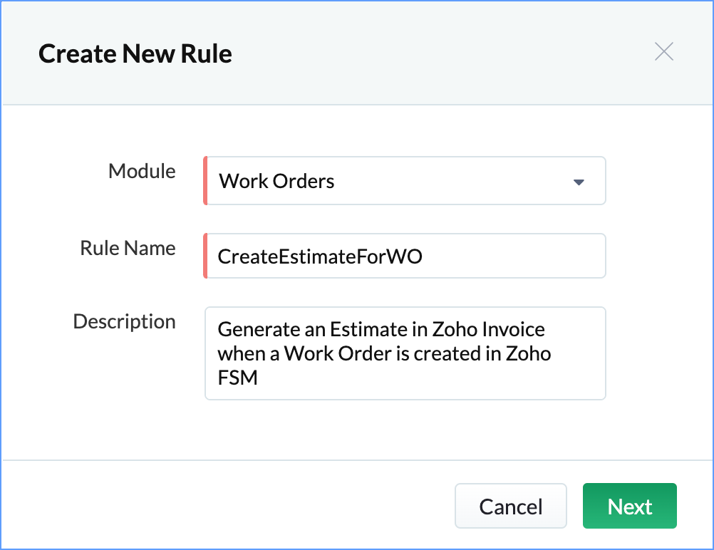 contact_id = work_order.get("Contact").toMap().get("id"); contact_resp = zoho.fsm.getRecordById("Contacts",contact_id); invoice_contact_id = contact_resp.get("data").toMap().get("ZBilling_Id"); listVar = List(); Service_Line_Item_List = work_order.get("Service_Line_Items").toList(); for each line in Service_Line_Item_List { line_map = line.toMap(); line_name = line_map.get("Service").toMap().get("name"); line_id = line_map.get("Service").toMap().get("id"); line_resp = zoho.fsm.getRecordById("Service_And_Parts",line_id); invoice_line_id = line_resp.get("data").toMap().get("ZBilling_Id"); mapVar = Map(); mapVar.put("item_id",invoice_line_id); mapVar.put("name",line_name); mapVar.put("rate",line_map.get("List_Price")); mapVar.put("quantity",line_map.get("Quantity")); listVar.add(mapVar); } Part_Line_Item_List = work_order.get("Part_Line_Items").toList(); for each line in Part_Line_Item_List { line_map = line.toMap(); line_name = line_map.get("Part").toMap().get("name"); line_id = line_map.get("Part").toMap().get("id"); line_resp = zoho.fsm.getRecordById("Service_And_Parts",line_id); invoice_line_id = line_resp.get("data").toMap().get("ZBilling_Id"); mapVar = Map(); mapVar.put("item_id",invoice_line_id); mapVar.put("name",line_name); mapVar.put("rate",line_map.get("List_Price")); mapVar.put("quantity",line_map.get("Quantity")); listVar.add(mapVar); } values = Map(); values.put("customer_id",invoice_contact_id); values.put("line_items",listVar); response = zoho.invoice.create("Estimates","<orgId>",values); info response; |