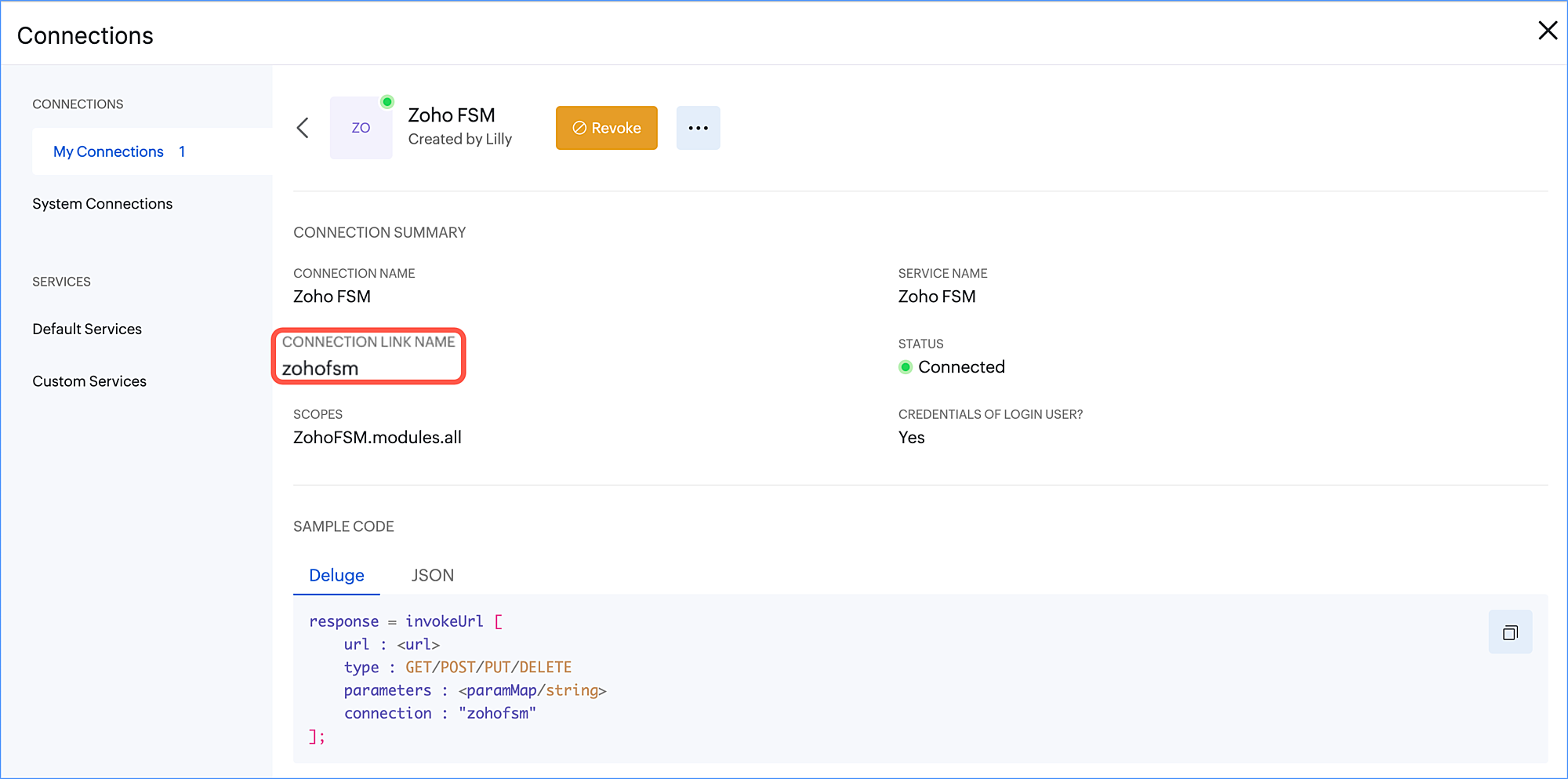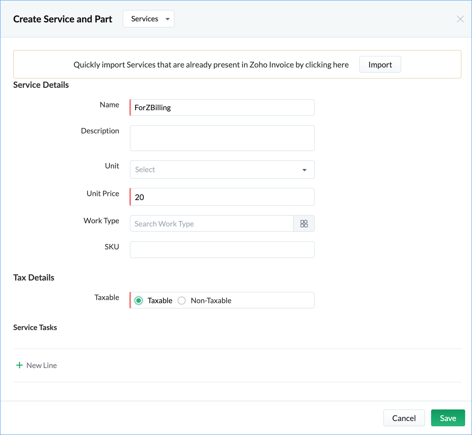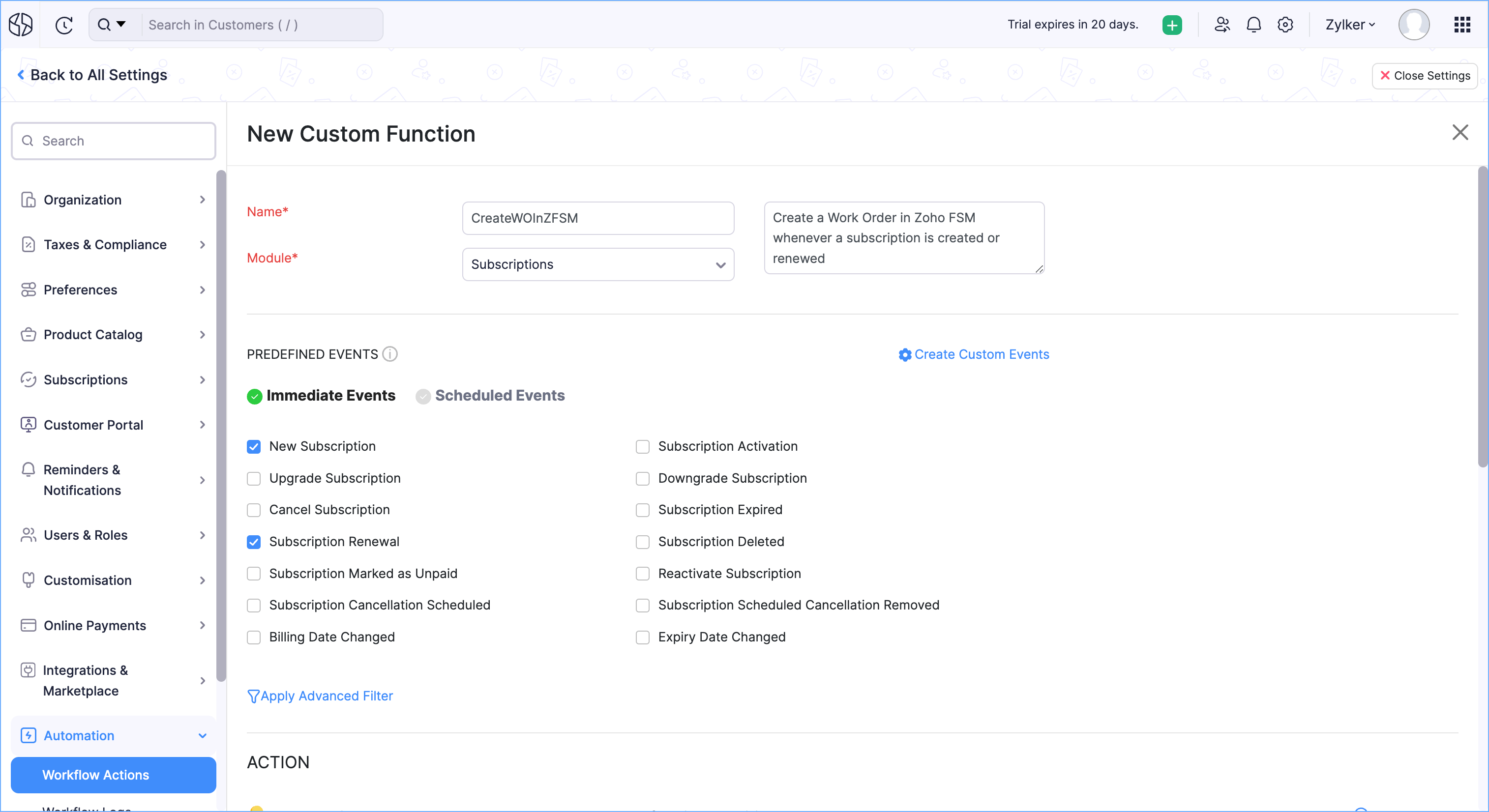 custEmail = subscriptions.get("customer").toMap().get("email"); response = zoho.fsm.searchRecordsByField("Contacts","Email",custEmail,Map(),"zohofsm"); subscription_number = subscriptions.get("subscription_number"); name = subscriptions.get("name"); summary = subscription_number + ":" + name; response = response.get("data").toMap(); tax = response.get("Tax").toMap(); //info tax; custId = response.get("id"); companyMap = response.get("Company"); if(companyMap == null) { compId = ""; } else { compId = companyMap.toMap().get("id"); } serviceAddressMap = response.get("Service_Address"); if(serviceAddressMap == null) { serviceAddressId = ""; } else { serviceAddressId = serviceAddressMap.toMap().get("id"); } billingAddressMap = response.get("Billing_Address"); if(billingAddressMap == null) { billingAddressId = ""; } else { billingAddressId = billingAddressMap.get("id"); } Service_Address_Map = Map(); Billing_Address_Map = Map(); Service_Address_Map.put("id",serviceAddressId); Billing_Address_Map.put("id",billingAddressId); serviceList = List(); response1 = zoho.fsm.searchRecordsByField("Service_And_Parts","Name","ForZBilling",Map(),"zohofsm"); //info response1; if(!response1.isNull() && !response1.isEmpty()) { service = response1.get("data").toMap(); serviceMap = Map(); serviceMap.put("Quantity",1); serviceMap.put("Sequence",1); serviceMap.put("List_Price",service.get("Unit_Price")); serviceMap.put("Service",service.get("id")); serviceMap.put("Contact",custId); serviceMap.put("Tax",tax); serviceList.add(serviceMap); } terrResp = zoho.fsm.getRecords("Territories"); terrId = terrResp.get("data").toMap().get("id"); createWOMap = Map(); createWOMap.put("Summary",summary); createWOMap.put("Priority","Medium"); createWOMap.put("Type","Service"); createWOMap.put("Email",custEmail); createWOMap.put("Contact",custId); createWOMap.put("Company",compId); createWOMap.put("Territory",terrId); createWOMap.put("Service_Address",Service_Address_Map); createWOMap.put("Billing_Address",Billing_Address_Map); createWOMap.put("Service_Line_Items",serviceList); info "createWOMap: " + createWOMap; woResp = zoho.fsm.createRecord("Work_Orders",createWOMap); info woResp; |