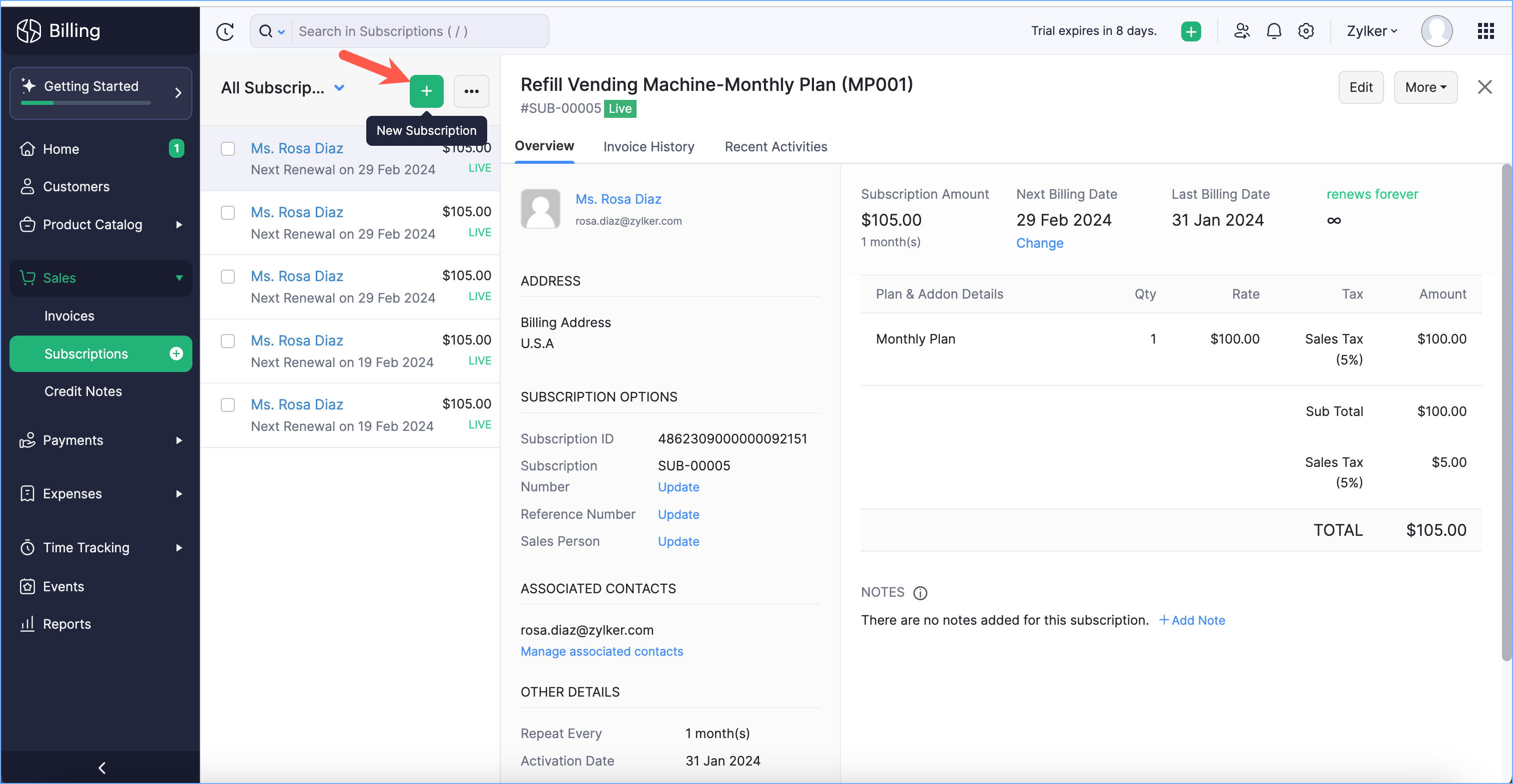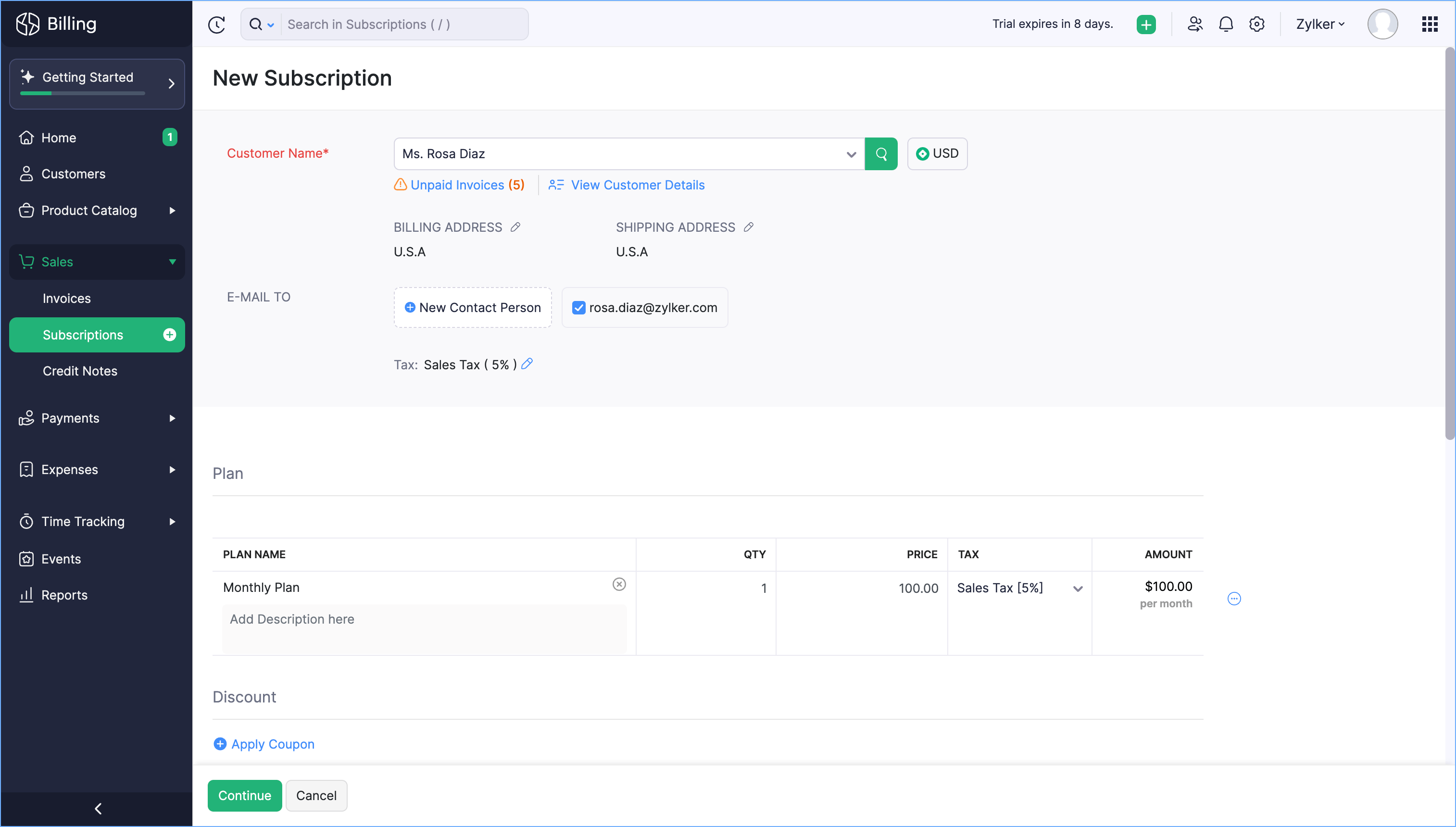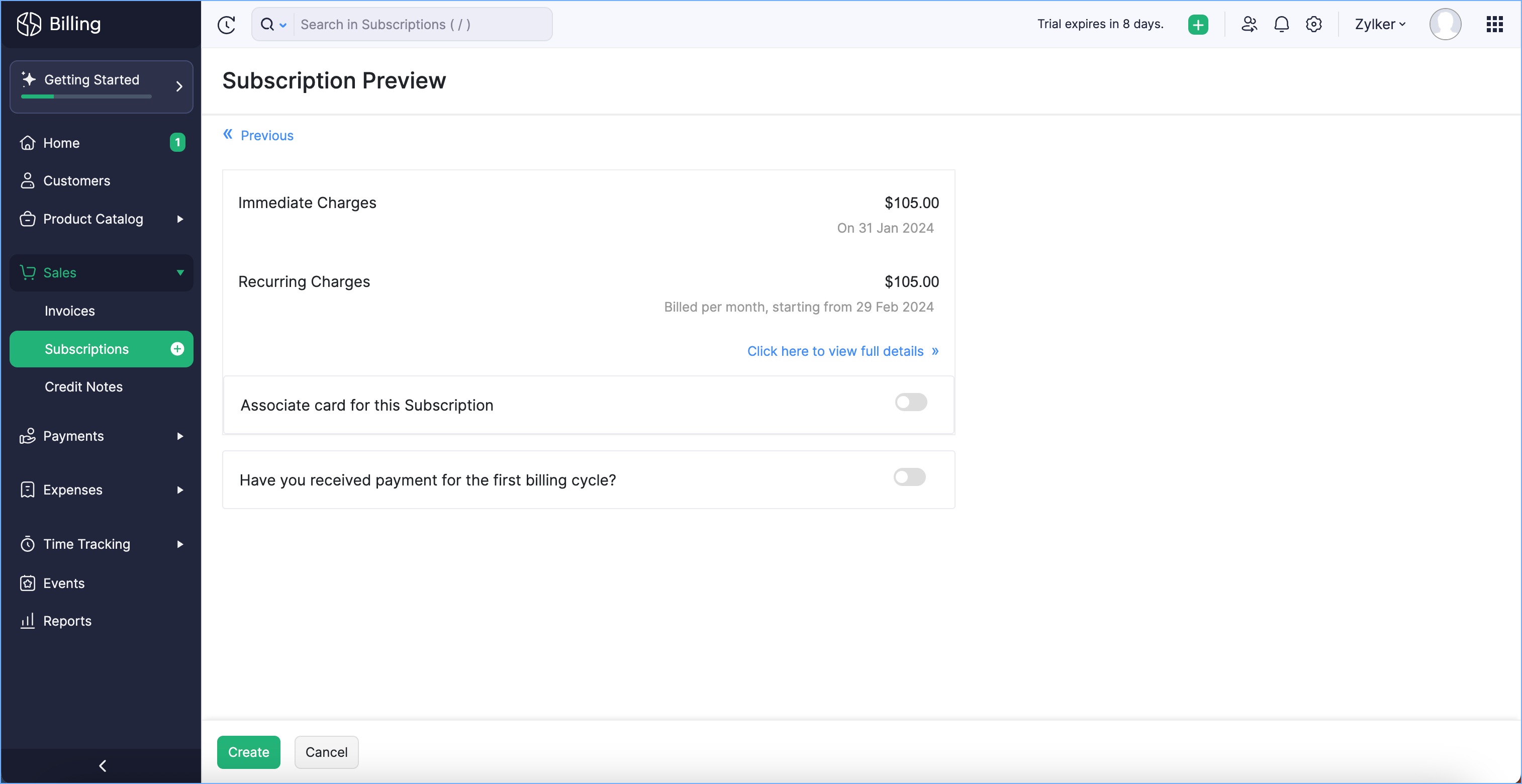 custEmail = subscriptions.get("customer").toMap().get("email"); response = zoho.fsm.searchRecordsByField("Contacts","Email",custEmail,Map(),"zohofsm"); subscription_number = subscriptions.get("subscription_number"); name = subscriptions.get("name"); summary = subscription_number + ":" + name; response = response.get("data").toMap(); tax = response.get("Tax").toMap(); //info tax; custId = response.get("id"); companyMap = response.get("Company"); if(companyMap == null) { compId = ""; } else { compId = companyMap.toMap().get("id"); } serviceAddressMap = response.get("Service_Address"); if(serviceAddressMap == null) { serviceAddressId = ""; } else { serviceAddressId = serviceAddressMap.toMap().get("id"); } billingAddressMap = response.get("Billing_Address"); if(billingAddressMap == null) { billingAddressId = ""; } else { billingAddressId = billingAddressMap.get("id"); } Service_Address_Map = Map(); Billing_Address_Map = Map(); Service_Address_Map.put("id",serviceAddressId); Billing_Address_Map.put("id",billingAddressId); serviceList = List(); response1 = zoho.fsm.searchRecordsByField("Service_And_Parts","Name","ForZBilling",Map(),"zohofsm"); //info response1; if(!response1.isNull() && !response1.isEmpty()) { service = response1.get("data").toMap(); serviceMap = Map(); serviceMap.put("Quantity",1); serviceMap.put("Sequence",1); serviceMap.put("List_Price",service.get("Unit_Price")); serviceMap.put("Service",service.get("id")); serviceMap.put("Contact",custId); serviceMap.put("Tax",tax); serviceList.add(serviceMap); } terrResp = zoho.fsm.getRecords("Territories"); terrId = terrResp.get("data").toMap().get("id"); createWOMap = Map(); createWOMap.put("Summary",summary); createWOMap.put("Priority","Medium"); createWOMap.put("Type","Service"); createWOMap.put("Email",custEmail); createWOMap.put("Contact",custId); createWOMap.put("Company",compId); createWOMap.put("Territory",terrId); createWOMap.put("Service_Address",Service_Address_Map); createWOMap.put("Billing_Address",Billing_Address_Map); createWOMap.put("Service_Line_Items",serviceList); info "createWOMap: " + createWOMap; woResp = zoho.fsm.createRecord("Work_Orders",createWOMap); info woResp; |