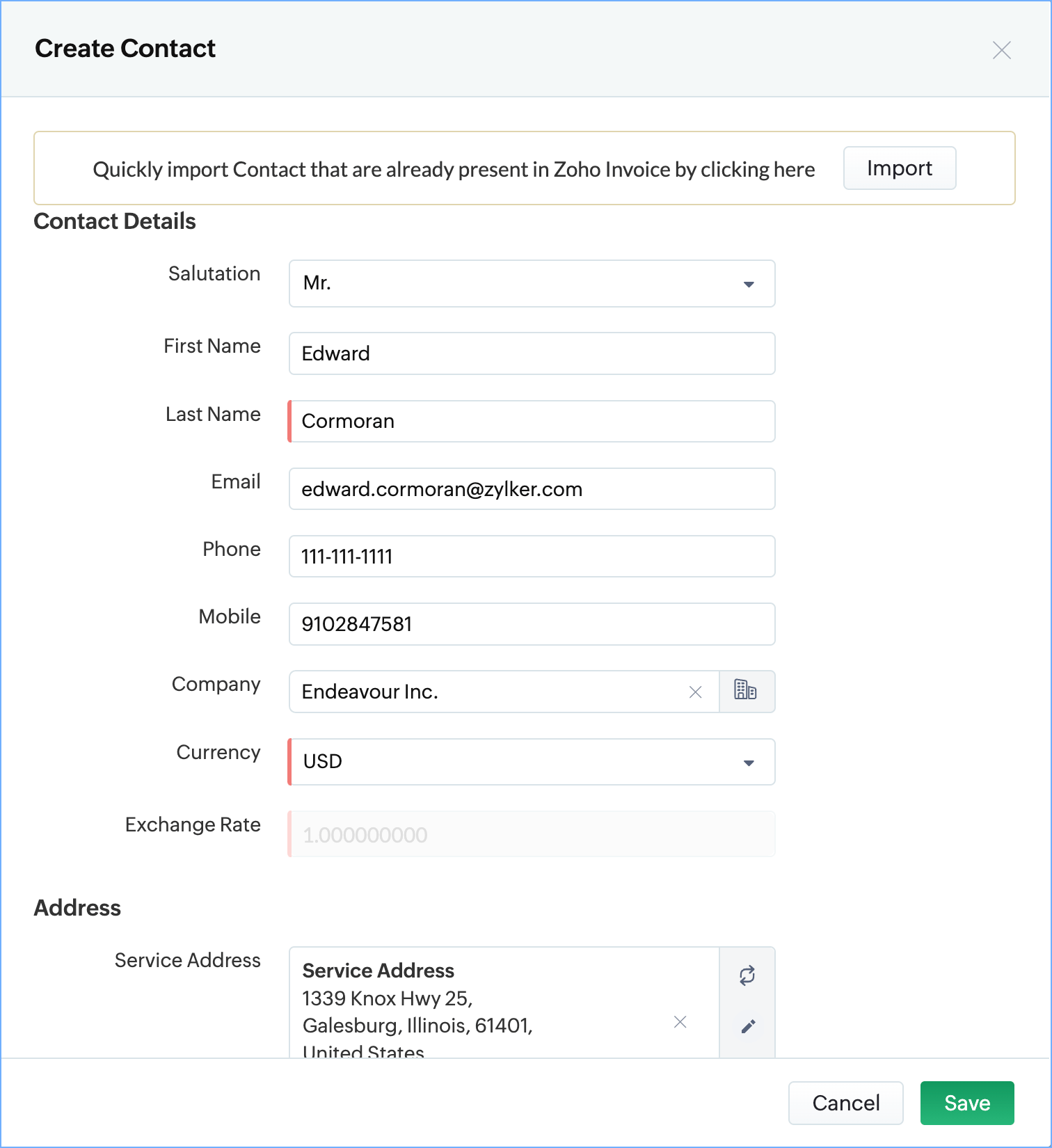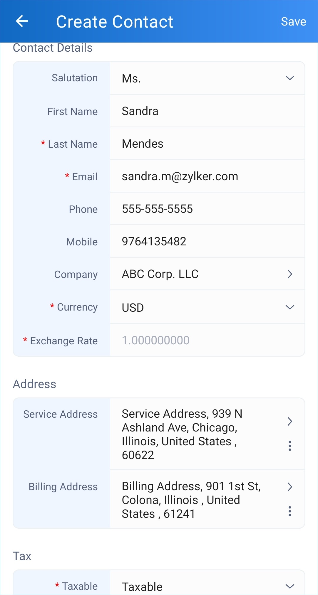 3. Add address : Multiple addresses can be added to a contact. Click the Add icon []. In the Add Address overlay, enter the details and click Save.
