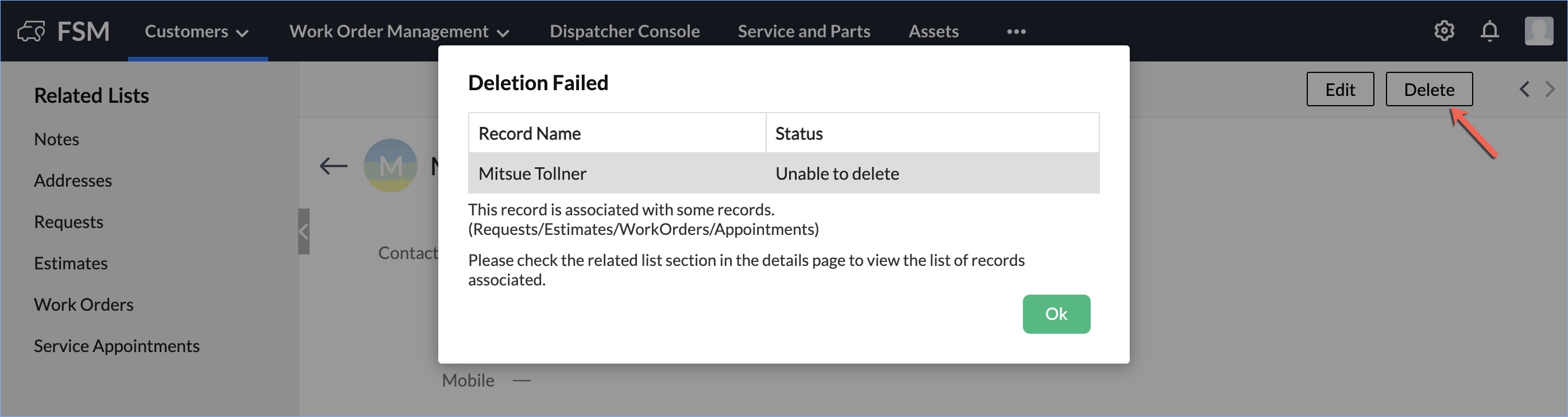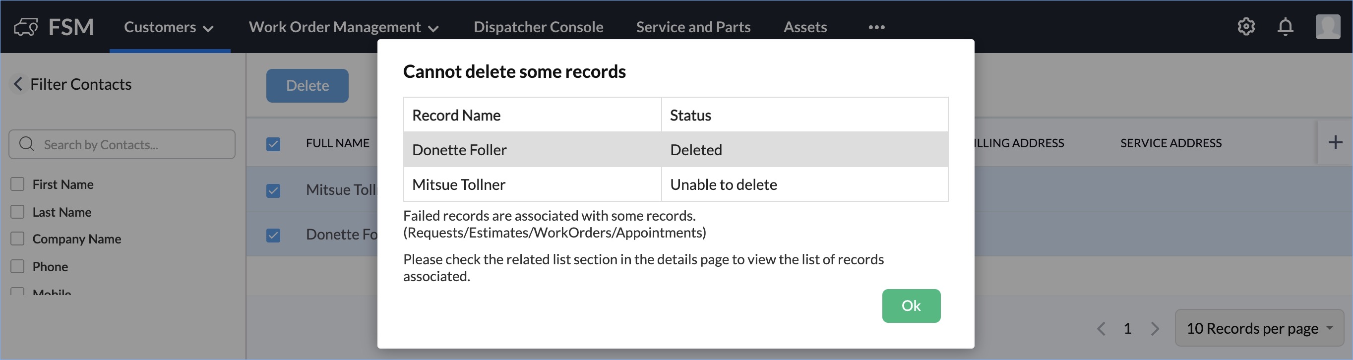 If there are contacts which are associated with active Requests, Estimates, Work Orders, or Appointments, then they cannot be deleted. The outcome of the deletion will be displayed (see the screenshot below).