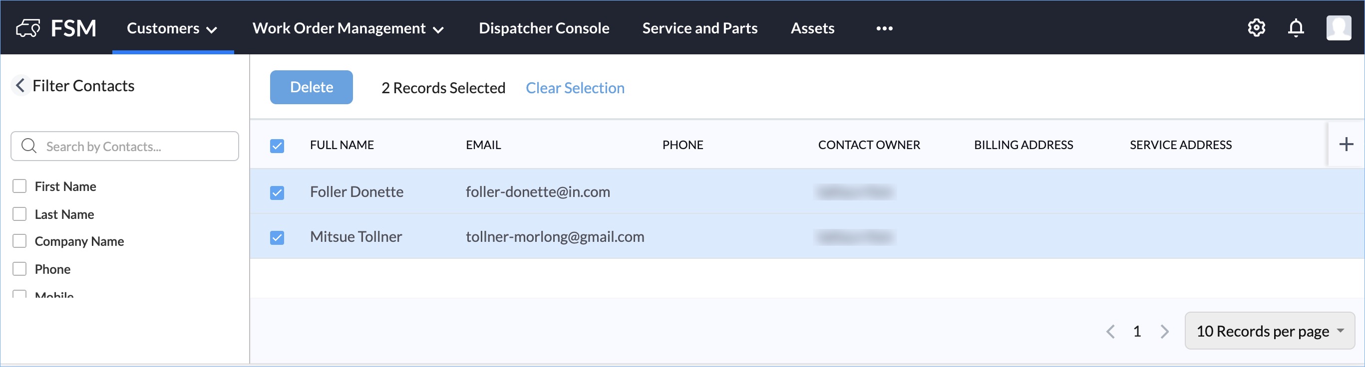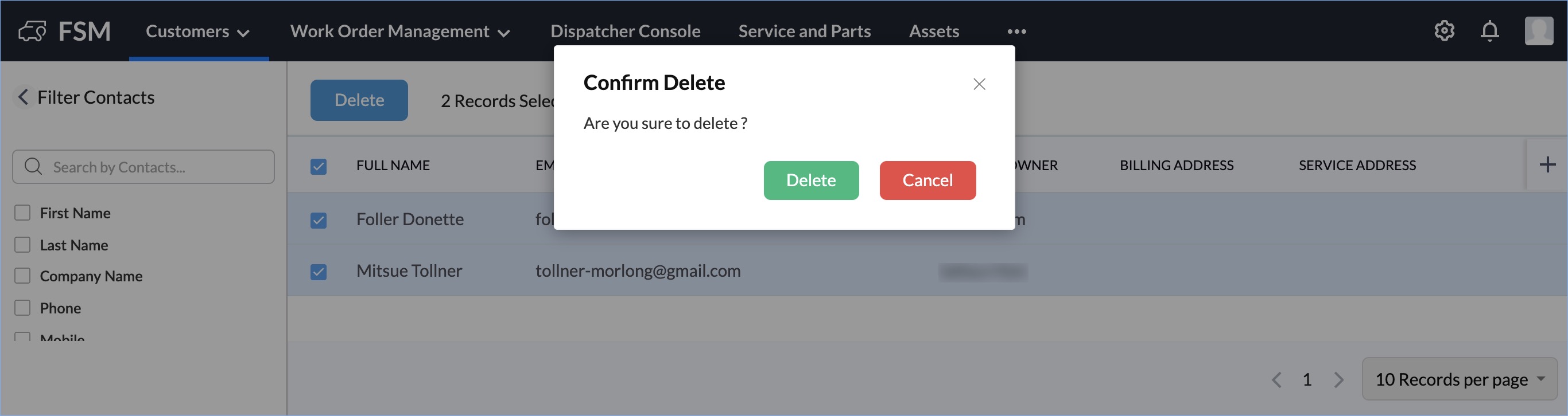 Contacts can be deleted either from the list view page or the contact details page. Contacts associated with active Requests, Estimates, Work Orders, or Appointments can not be deleted.