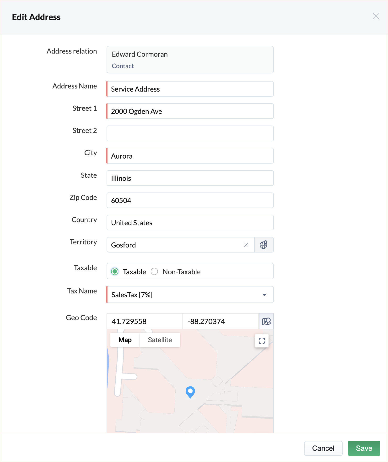 2. Edit address : After adding an address in the Service/Billing address field, click the Edit icon []. In the Edit Address overlay make the necessary changes and click Save.