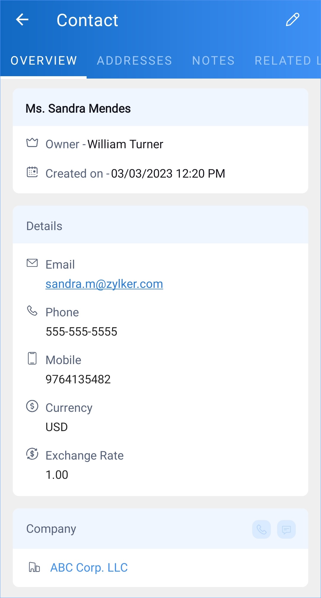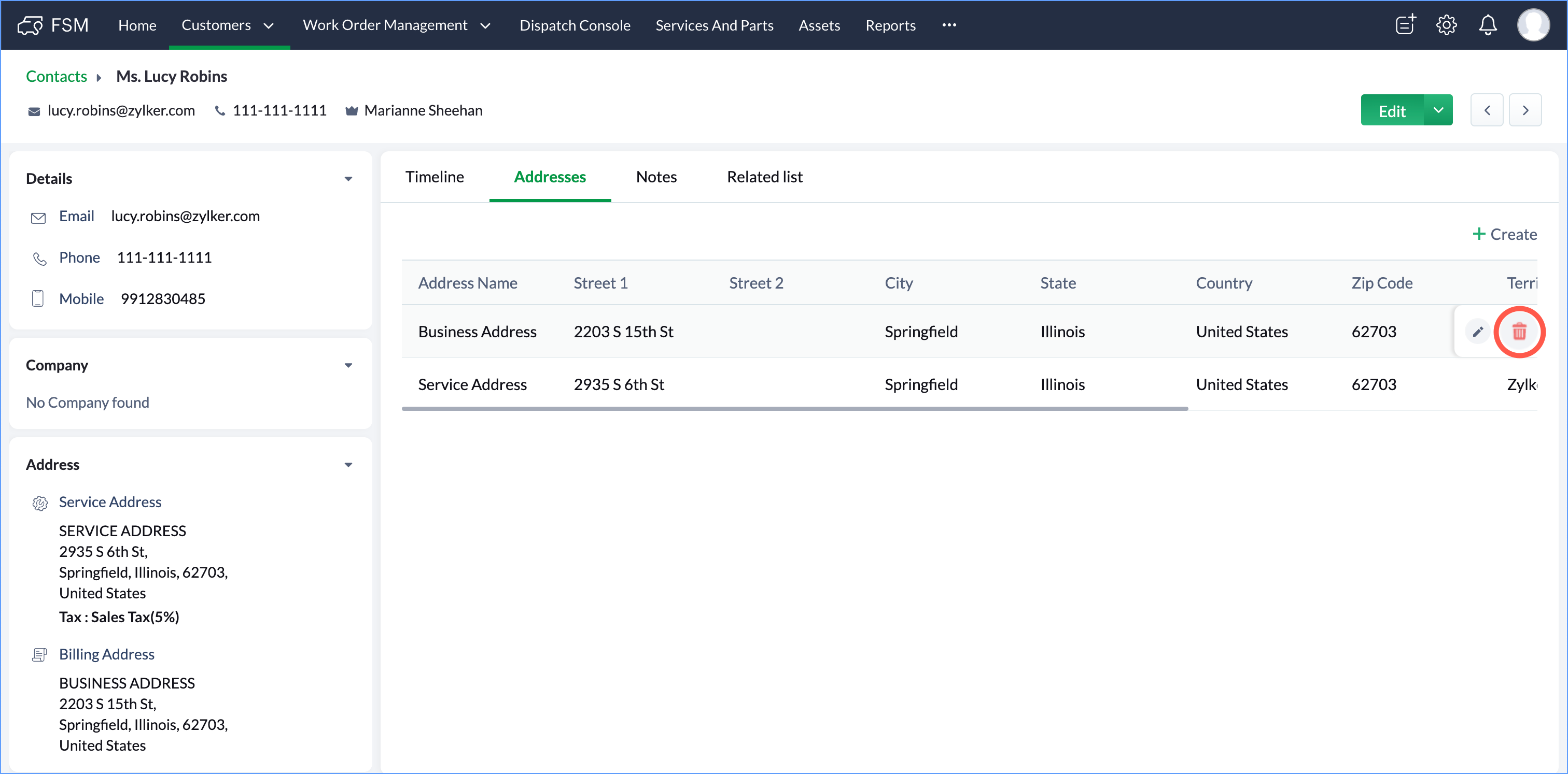 1. Select Contacts from the Customers menu and select the contact record whose address you want to delete.