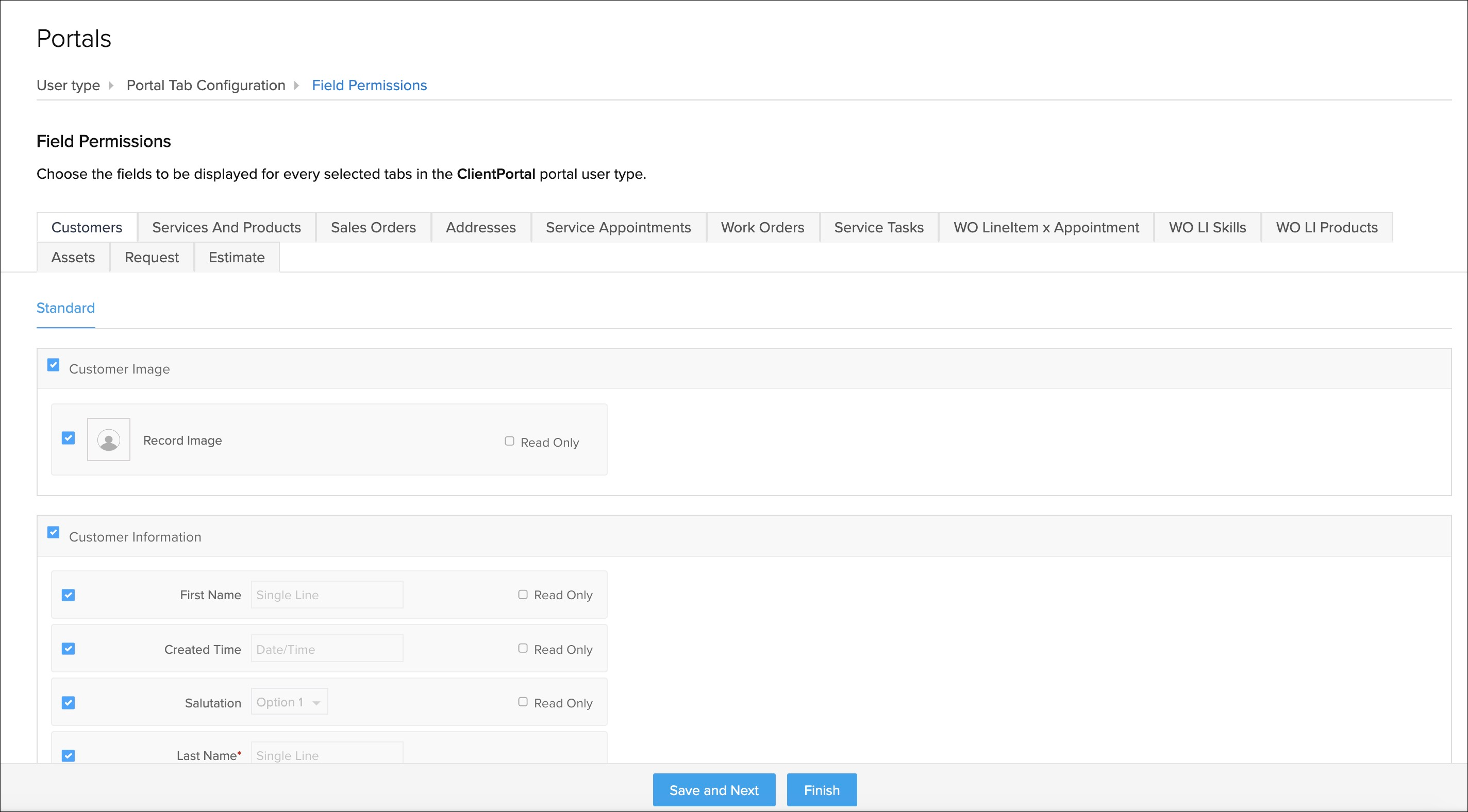 5. For each module/section that was selected for access by Portal users (in step 3a), select the fields to be displayed to your Portal users. Click Save and Next to proceed to the next tab, or click Finish to exit.