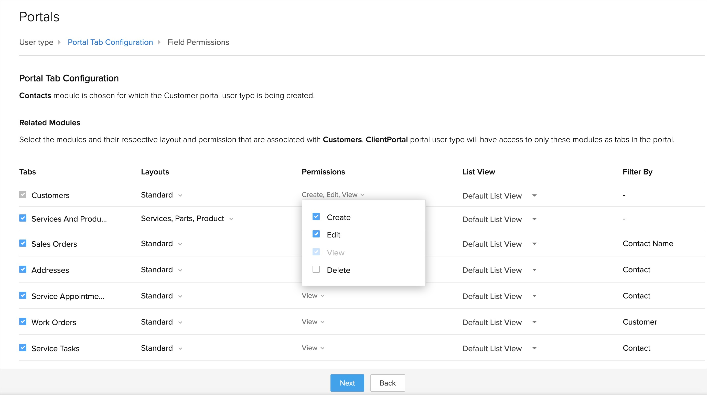 Permissions: Choose whether Portal users can create, edit, view, and delete records.