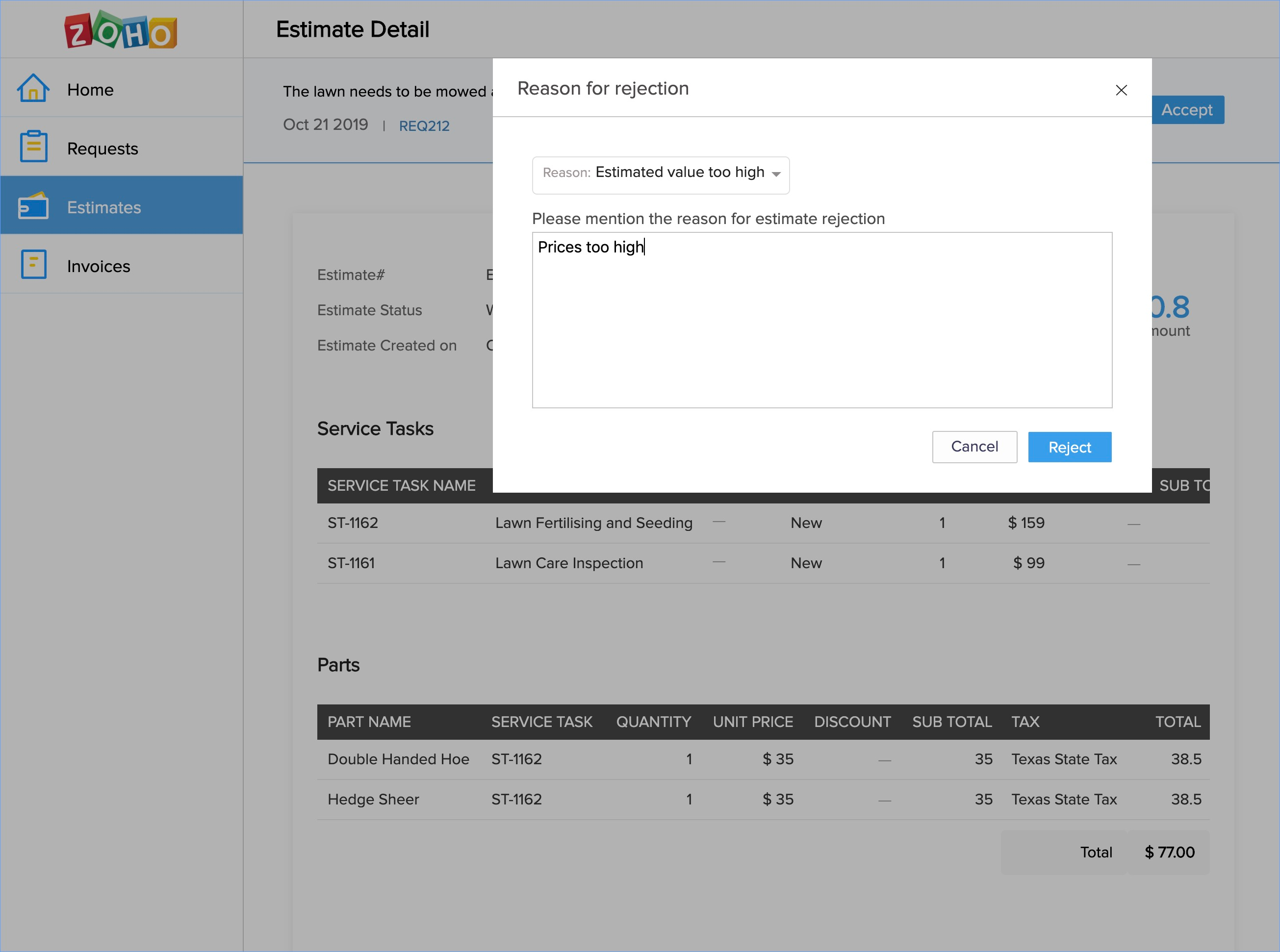 Click the Reject button for the estimate in the Estimate List page or click on an estimate and click the Reject button in the Estimate details page. Enter a reason in Reason for rejection pop-up and click Reject.