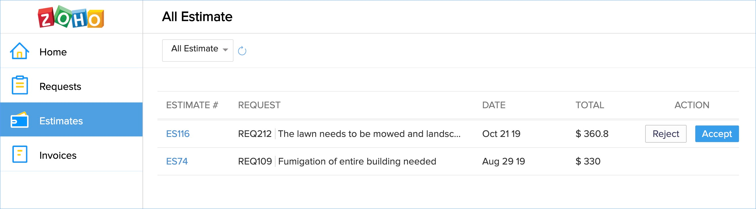 Click the Accept button for the estimate in the Estimate List page. This action can also be performed within the Estimate Details page. You can also accept an estimate by clicking the Accept button for the estimate in the Requests list page.