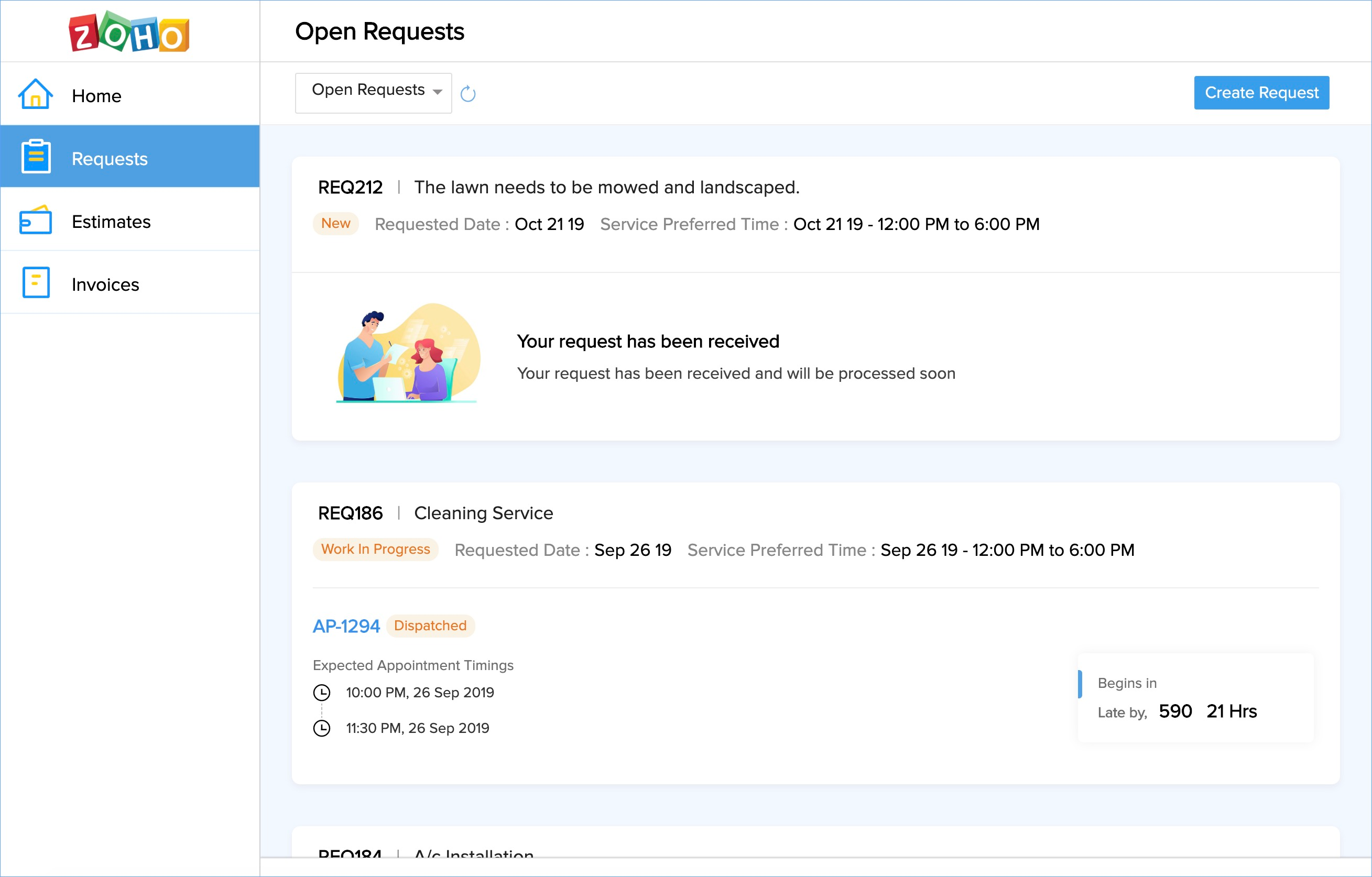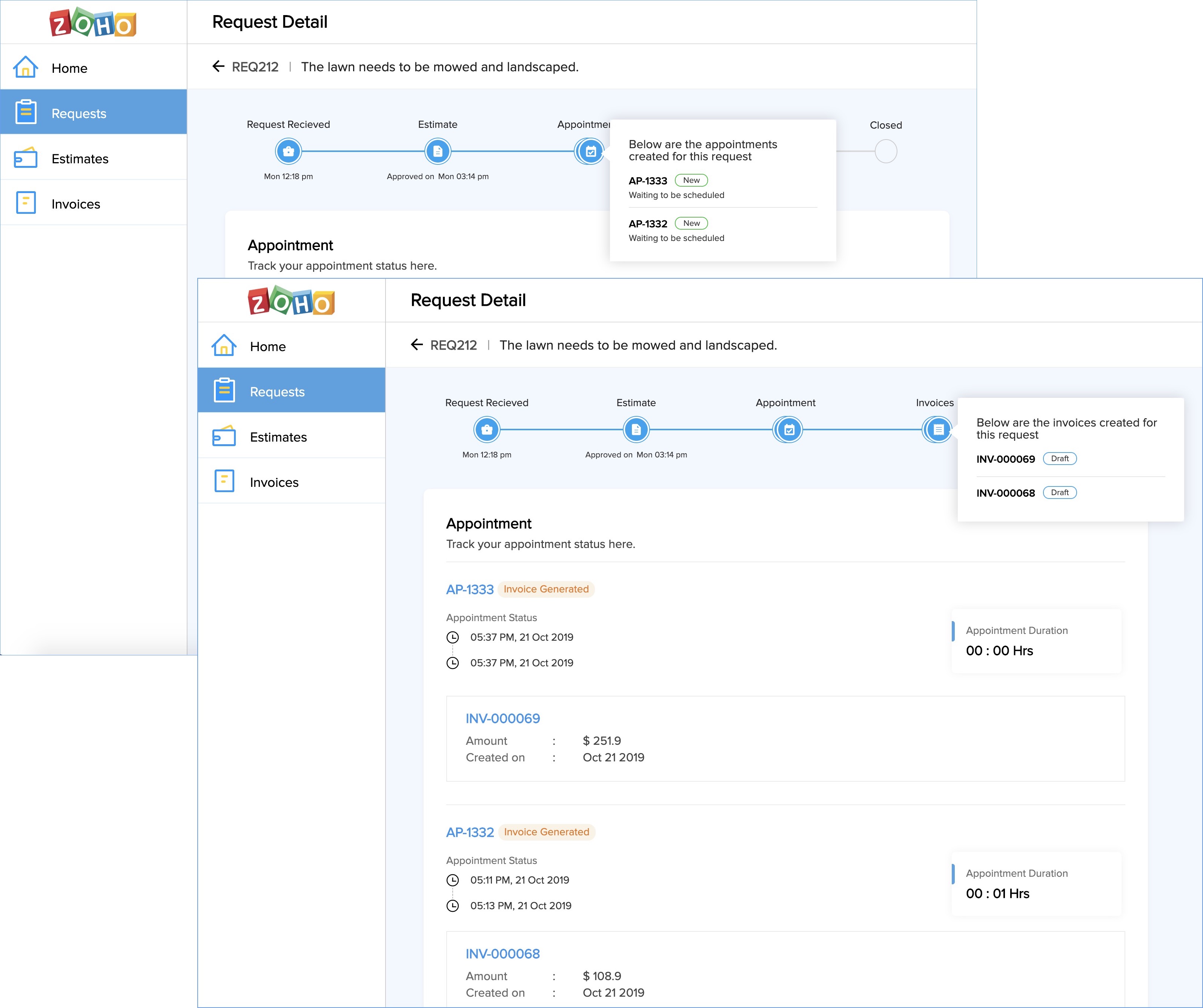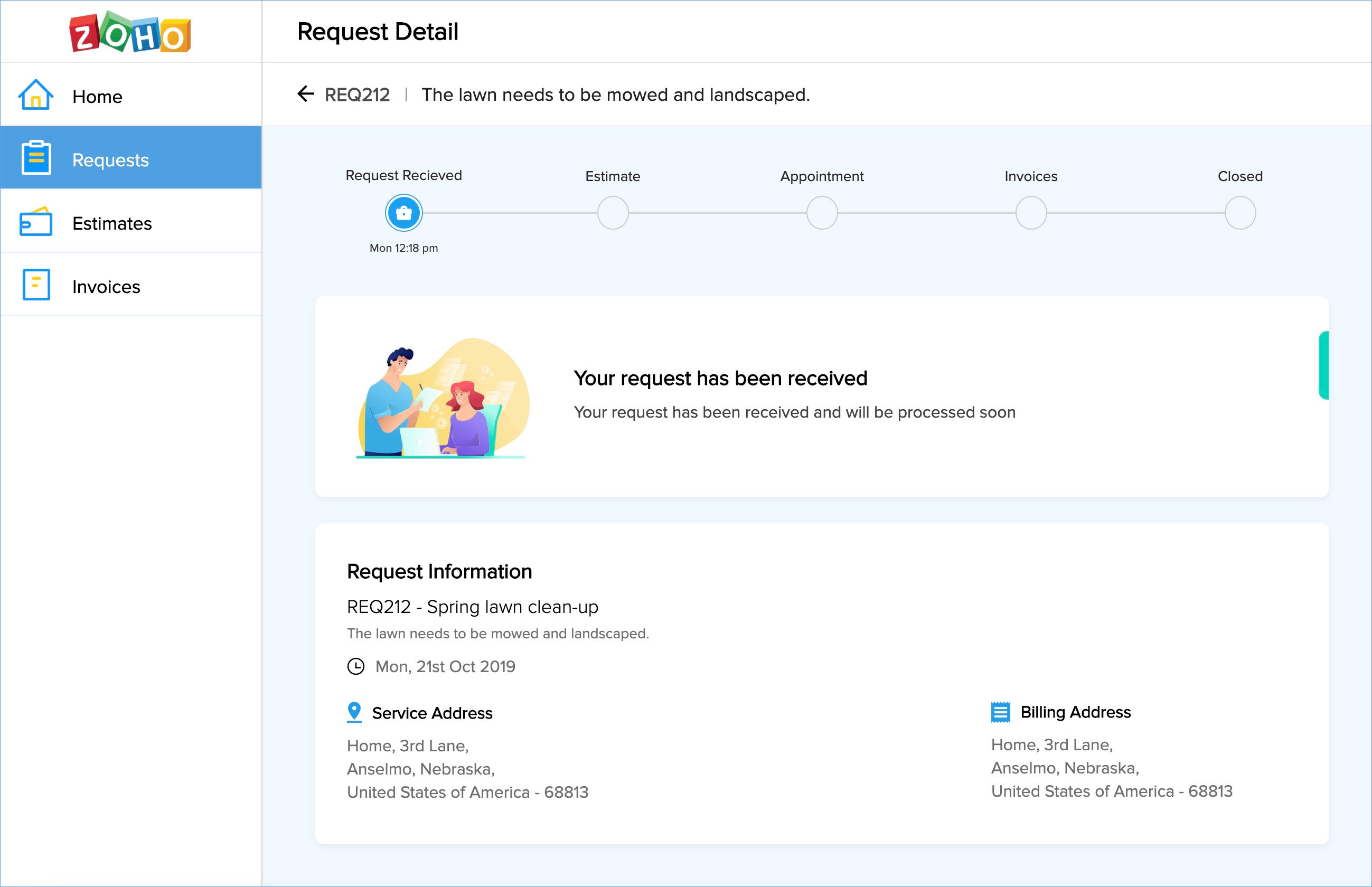 The Zoho FSM Customer Portal provides customers with an application to raise service requests. With the customer portal, they can view the estimates created for the requests, accept or reject them. They can keep tabs on the updates to the appointments created for their request through the notifications sent to the portal. Invoices generated for the services rendered can be viewed here and the payments for these invoices can also be done through the customer portal. Customers can also manage their profile details here. Thus the portal provides the customer with a convenient solution to manage their requests.