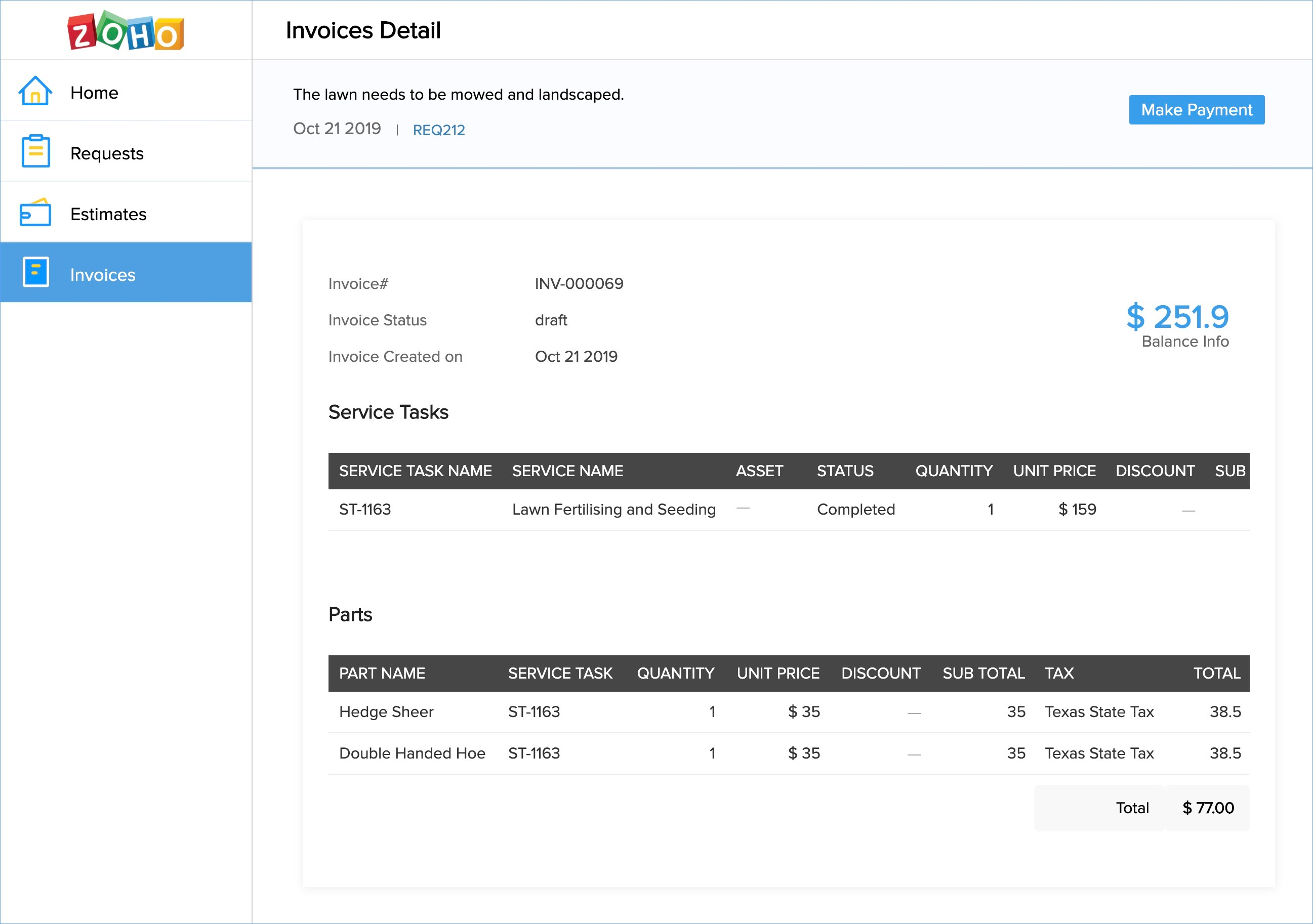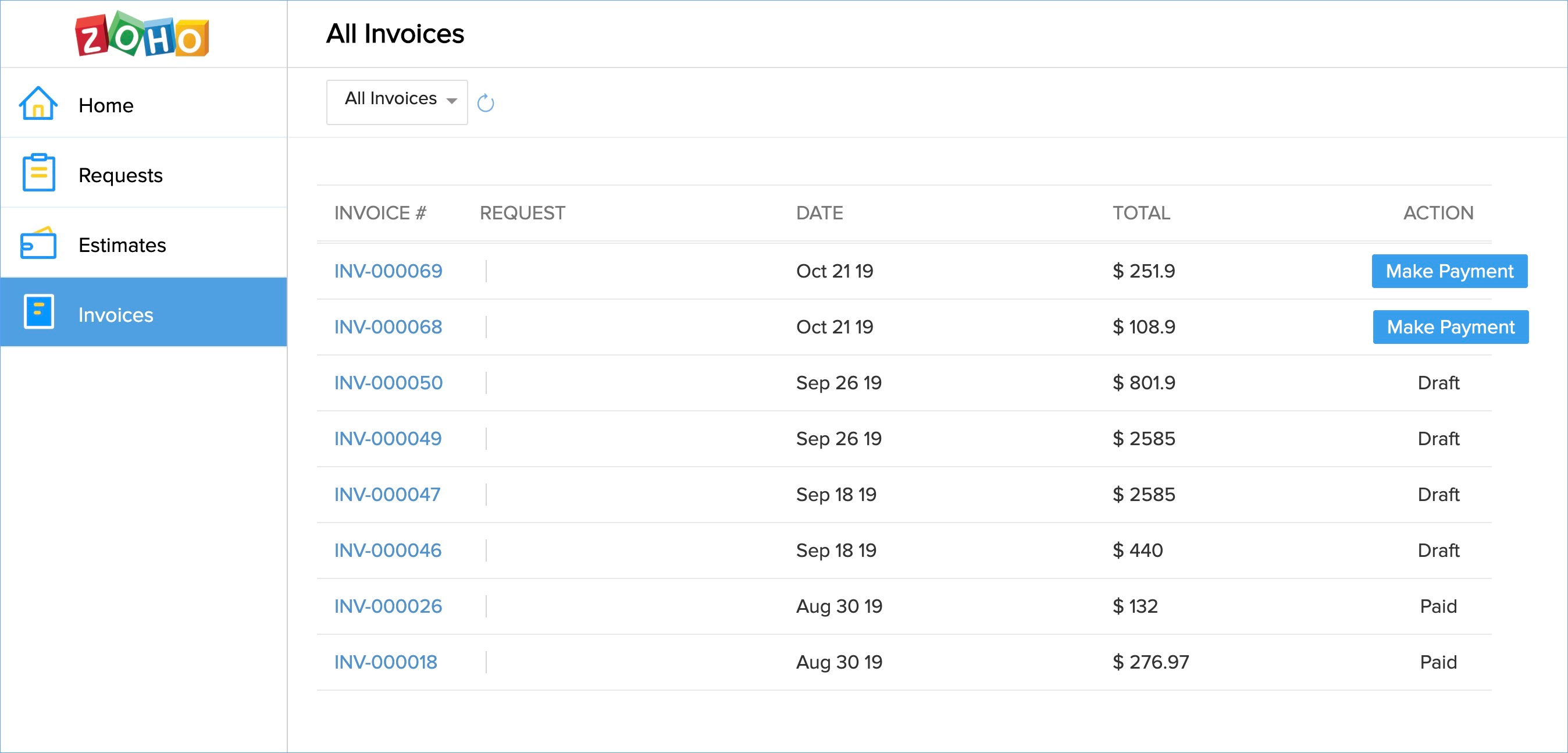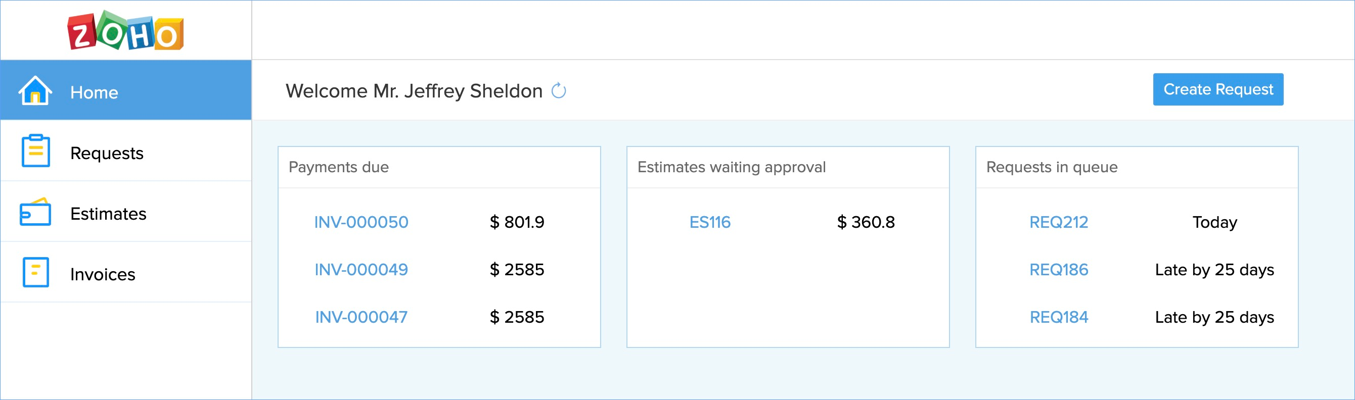 The Zoho FSM Customer Portal provides customers with an application to raise service requests. With the customer portal, they can view the estimates created for the requests, accept or reject them. They can keep tabs on the updates to the appointments created for their request through the notifications sent to the portal. Invoices generated for the services rendered can be viewed here and the payments for these invoices can also be done through the customer portal. Customers can also manage their profile details here. Thus the portal provides the customer with a convenient solution to manage their requests.