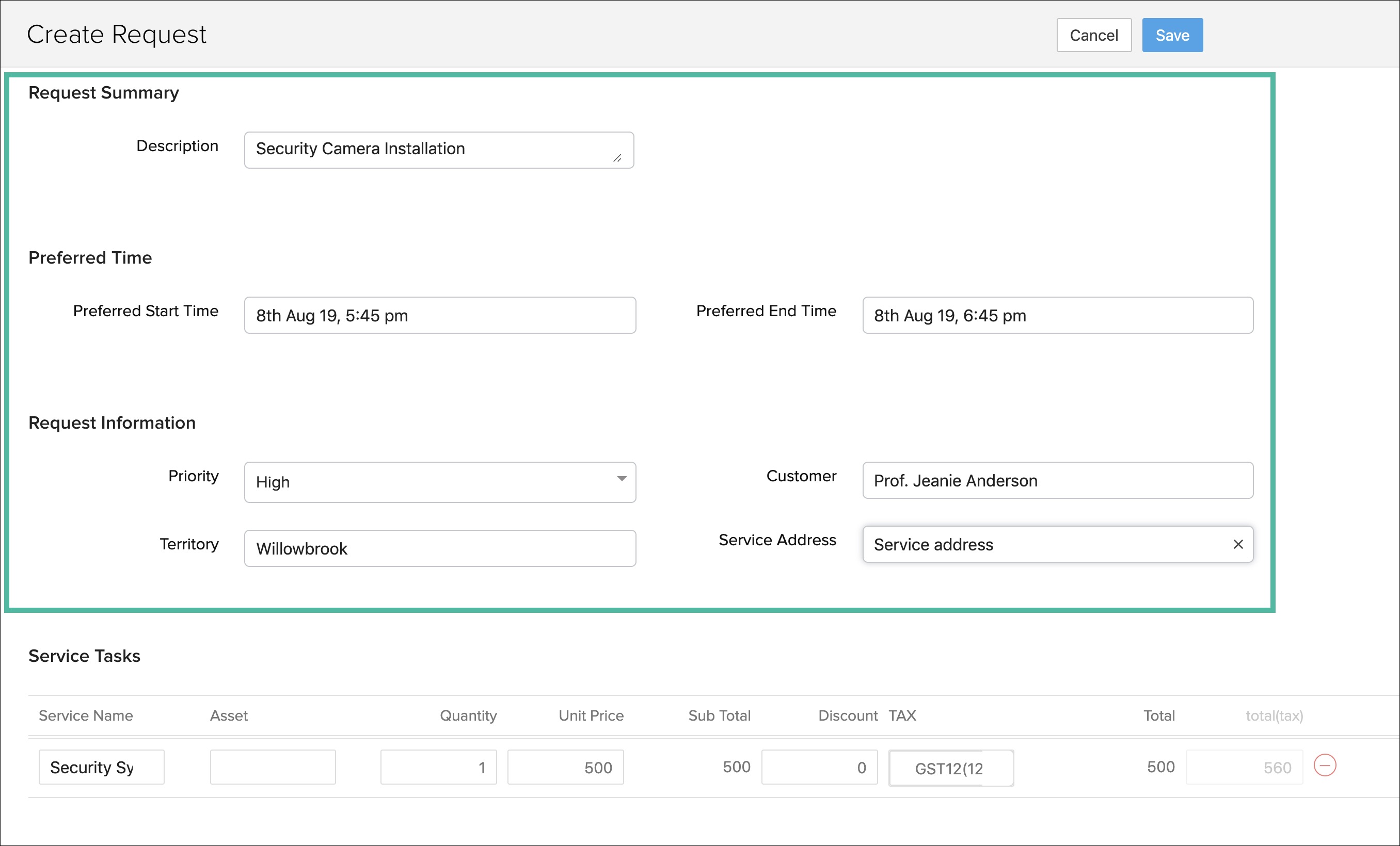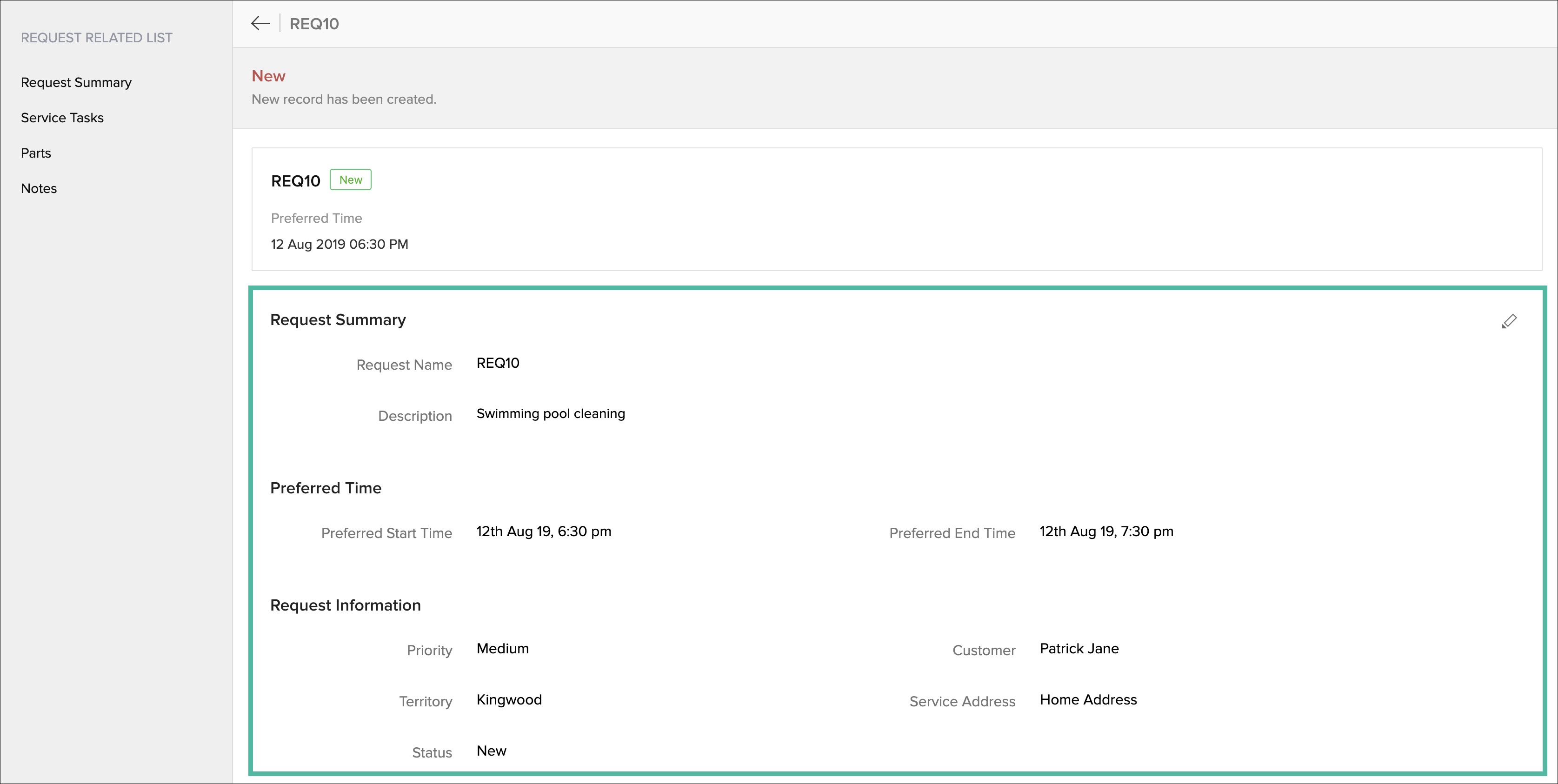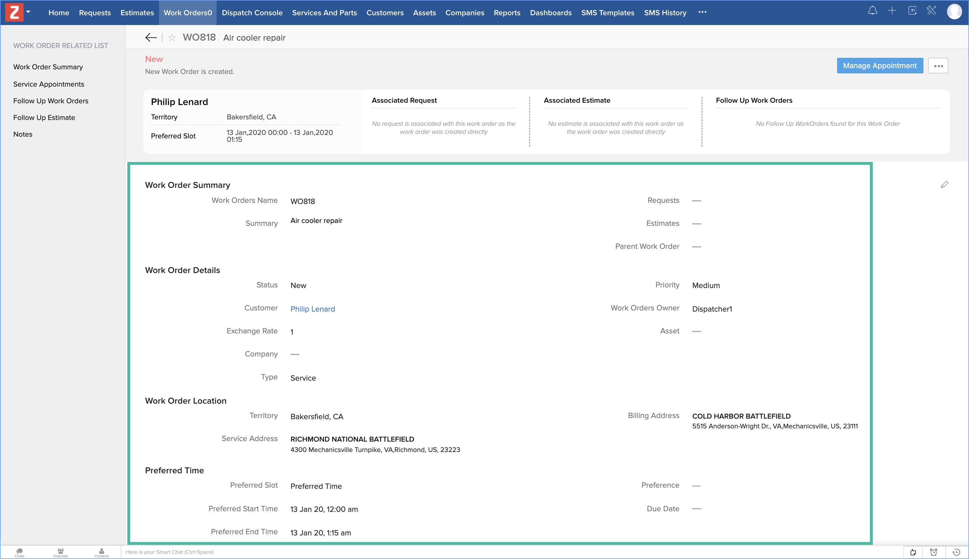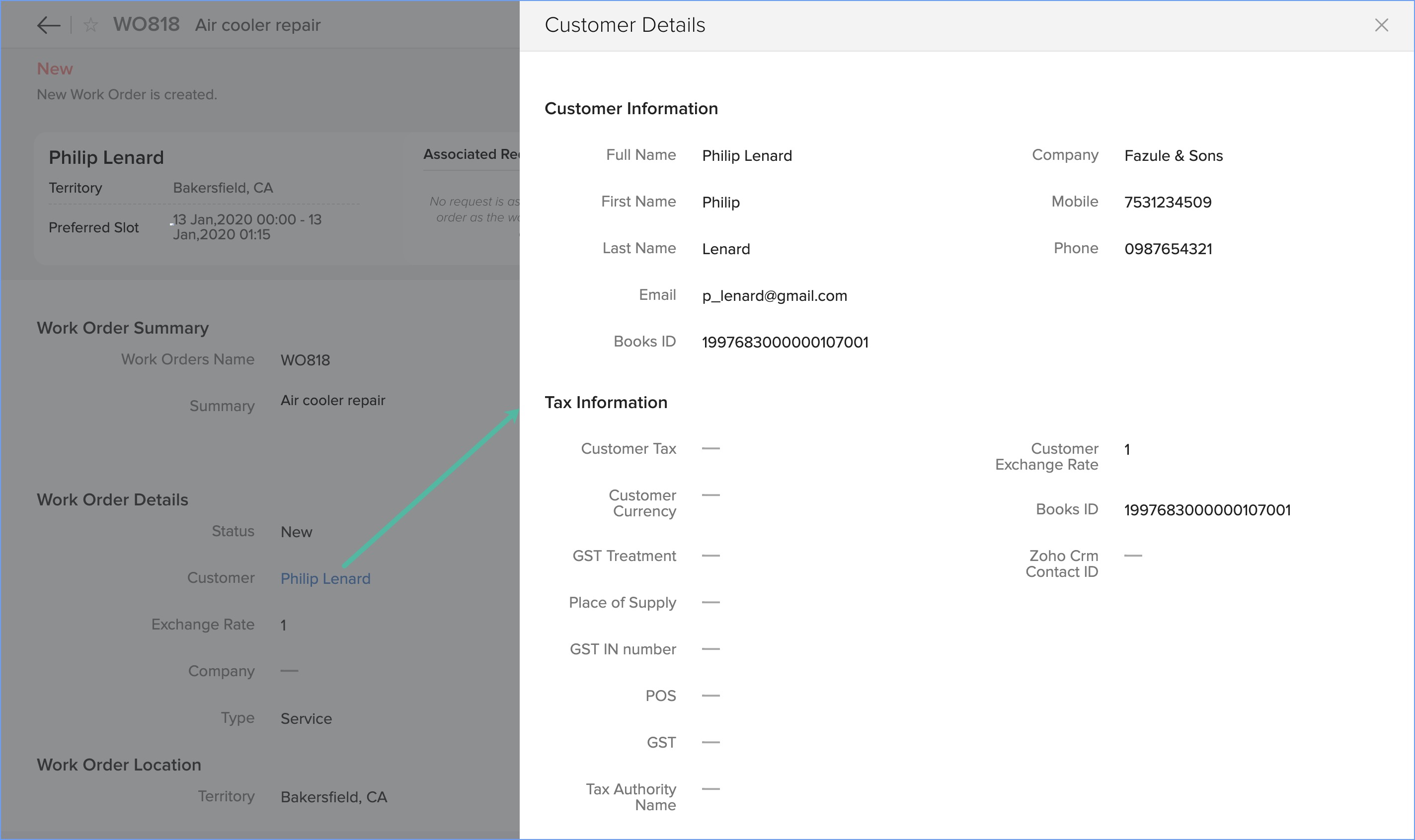 1. Customer Information: This section contains customer details of a work order that can be seen by clicking the name of the Contact in the Work Order details page.