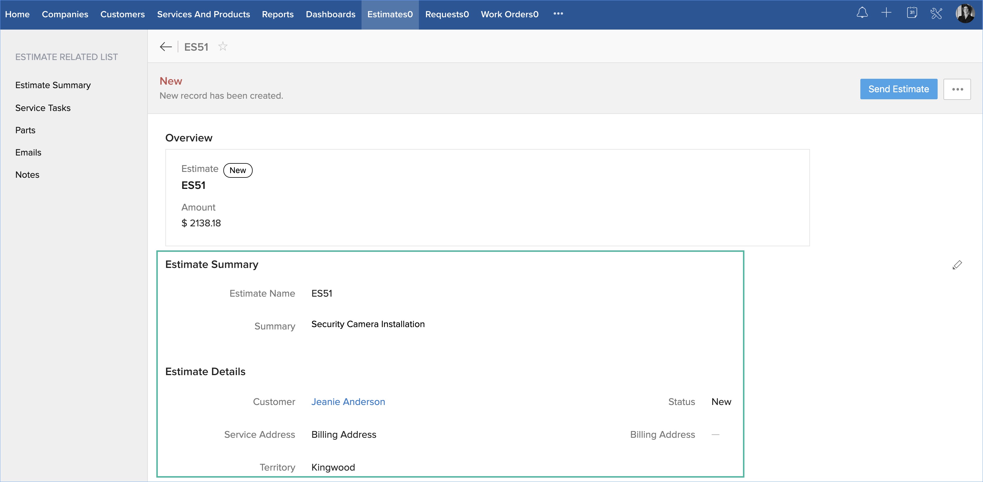 2. The Estimate Edit section builder is used to customize the fields in Estimate Details page (see screenshot below).