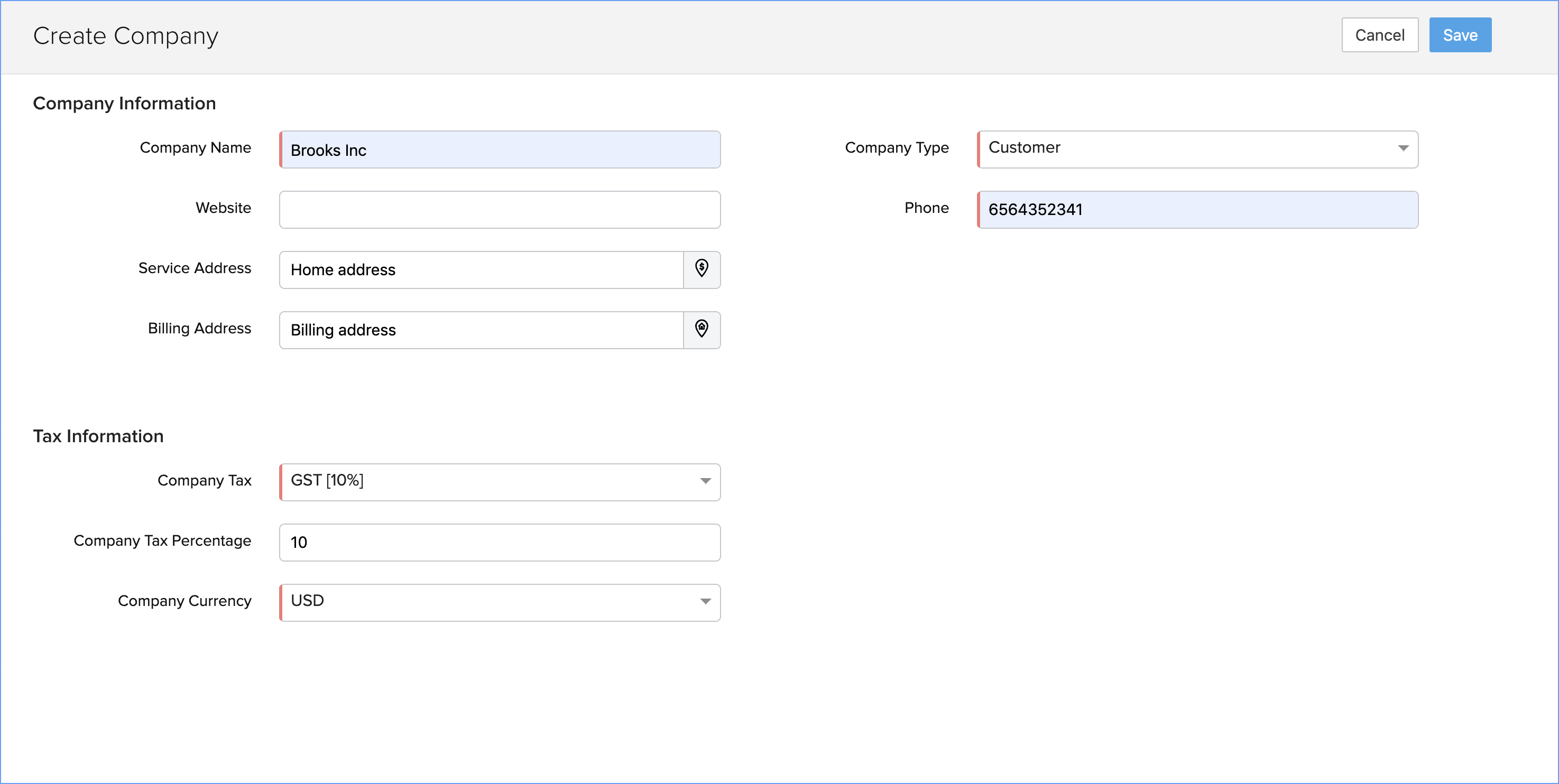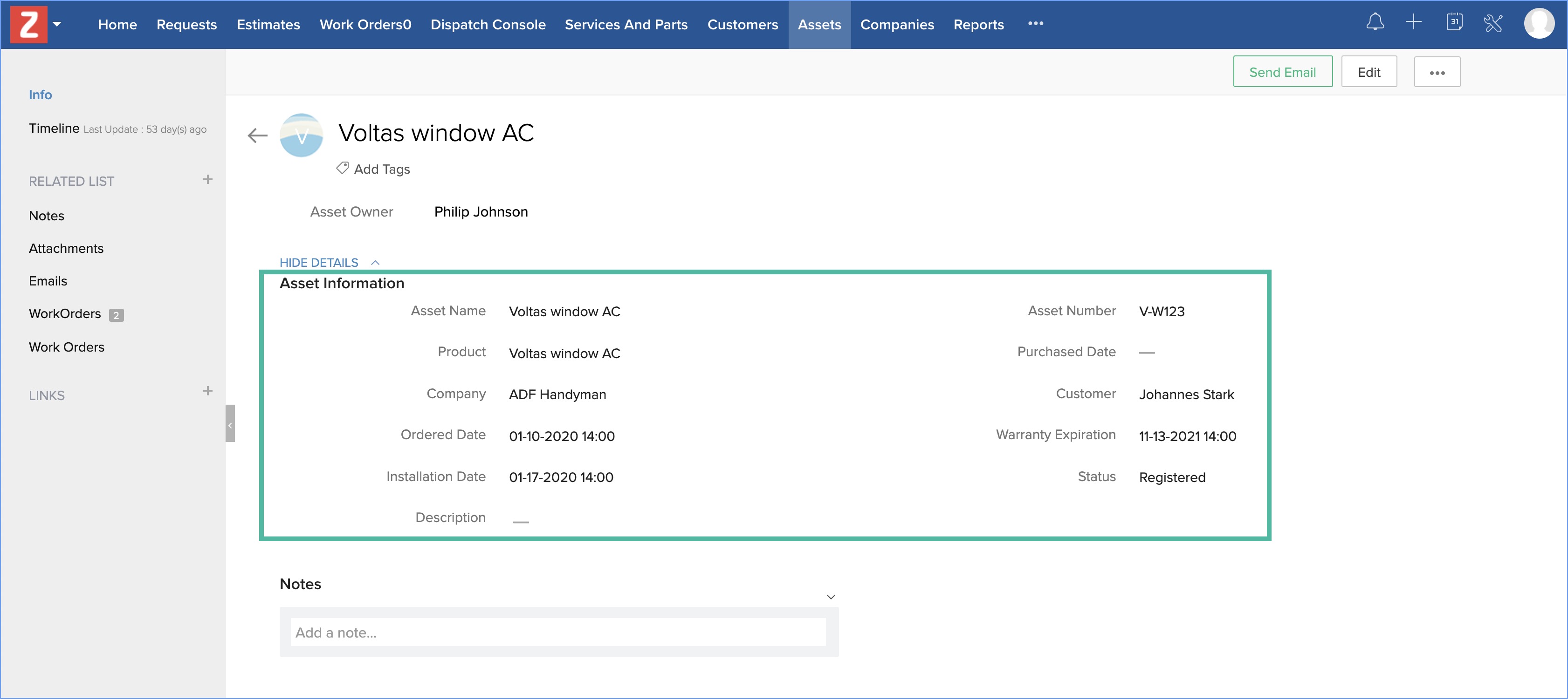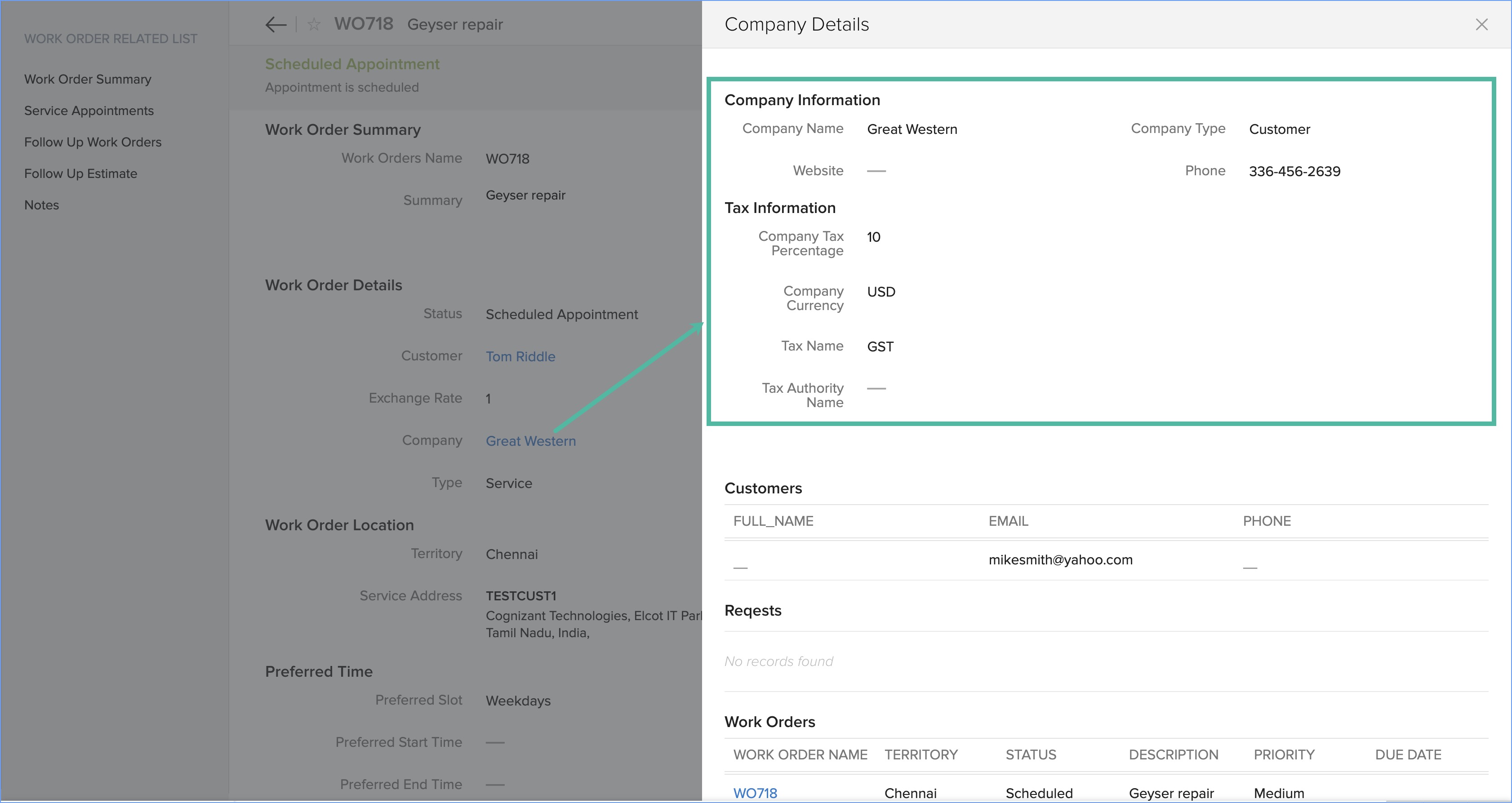 3. Company Information: This section contains company details of the customer in a work order which can be seen by clicking the name of the Company in the Work Order details page.