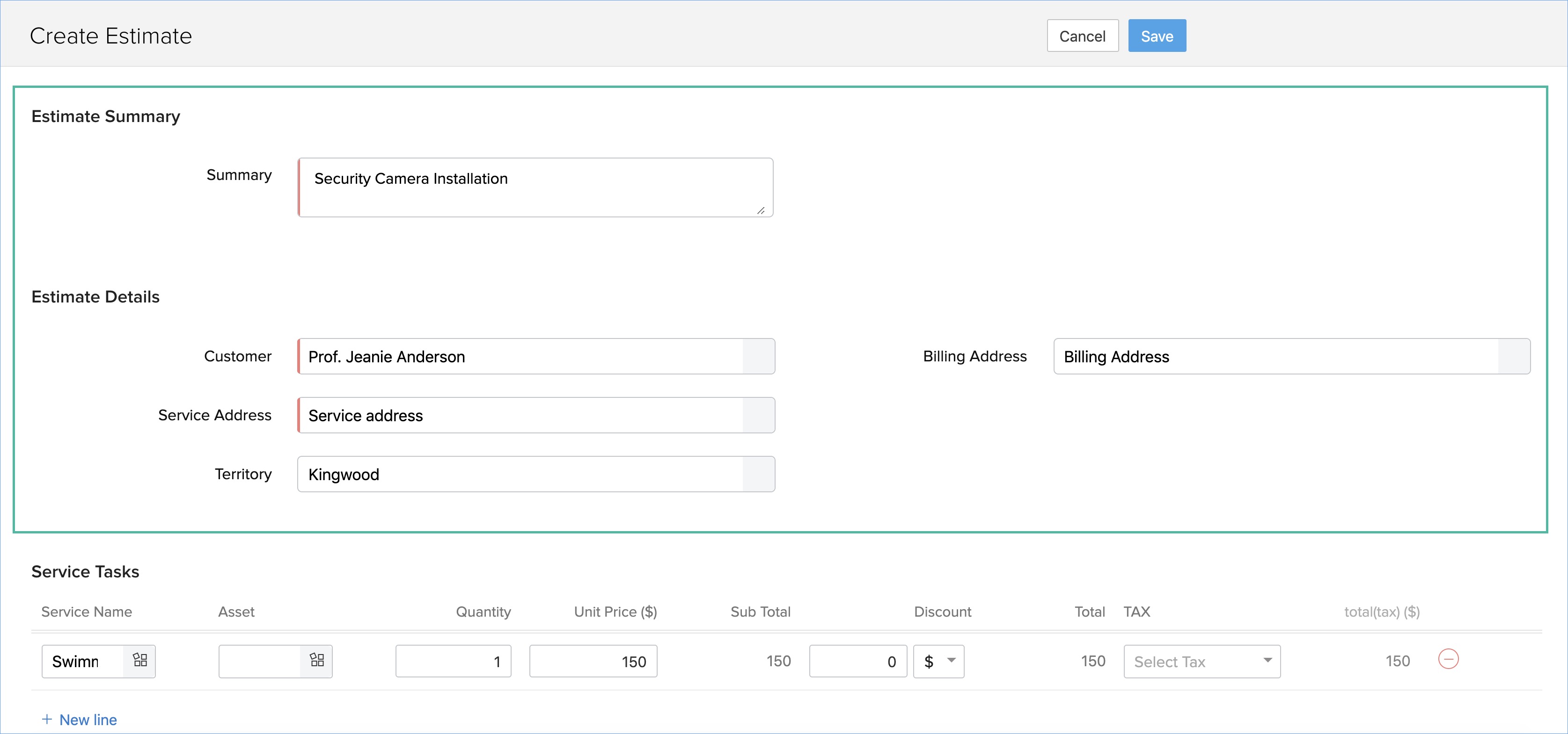 1. The Estimate Edit section builder is used to customize the fields in Create Estimate page (see screenshot below).