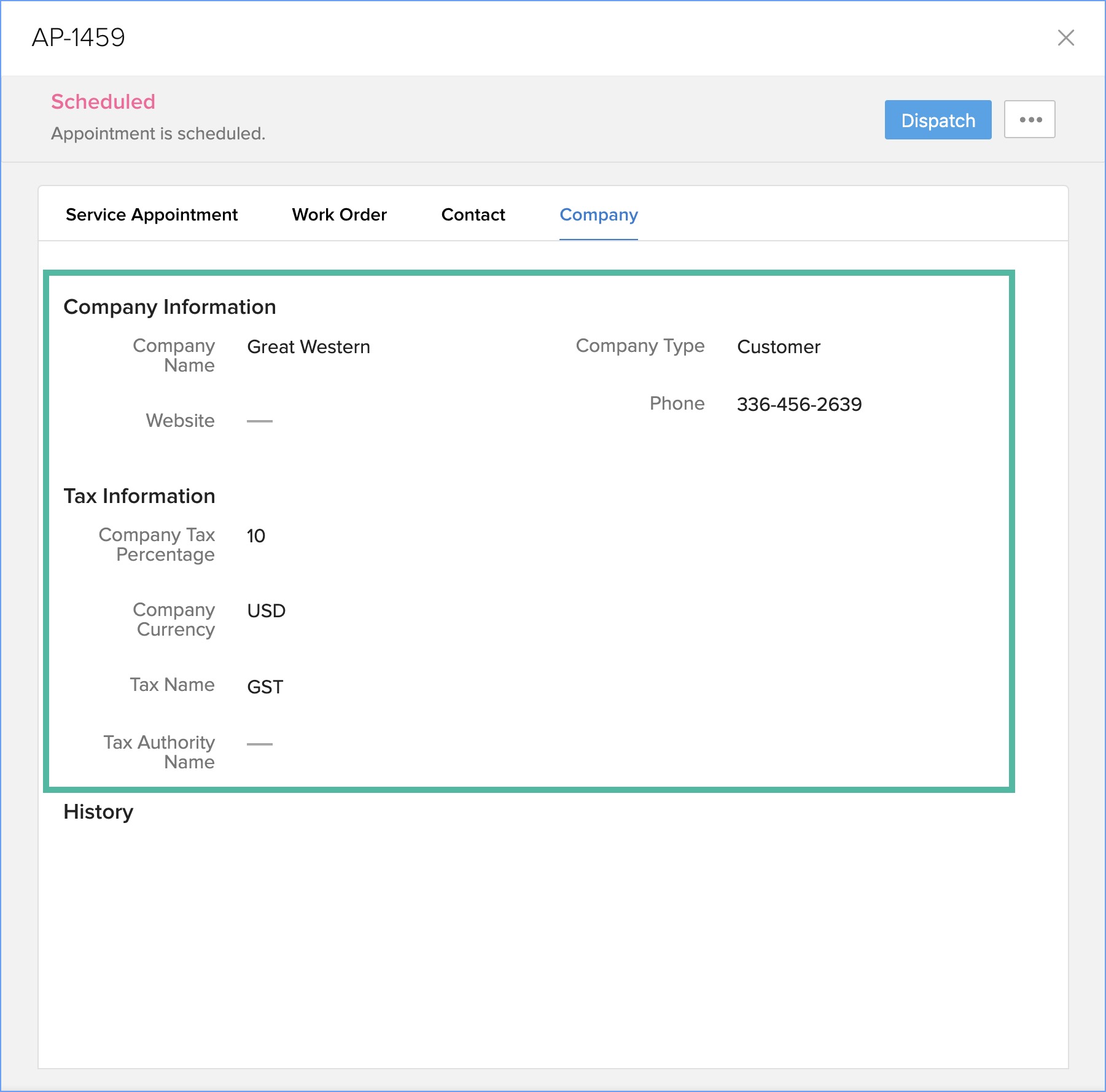2. The fields in the Company tab of the Service Appointment overlay (see screenshot below). You can view this overlay by clicking Service Appointments related list in the right pane of Work Order Details page.