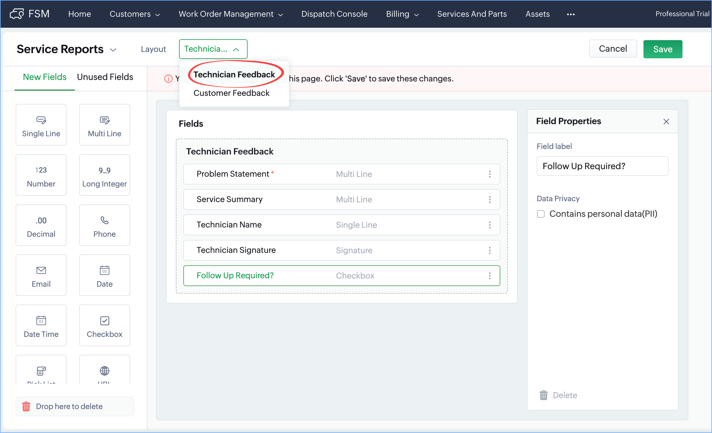 2. Select the Technician Feedback layout and add the necessary fields/customizations and click Save.