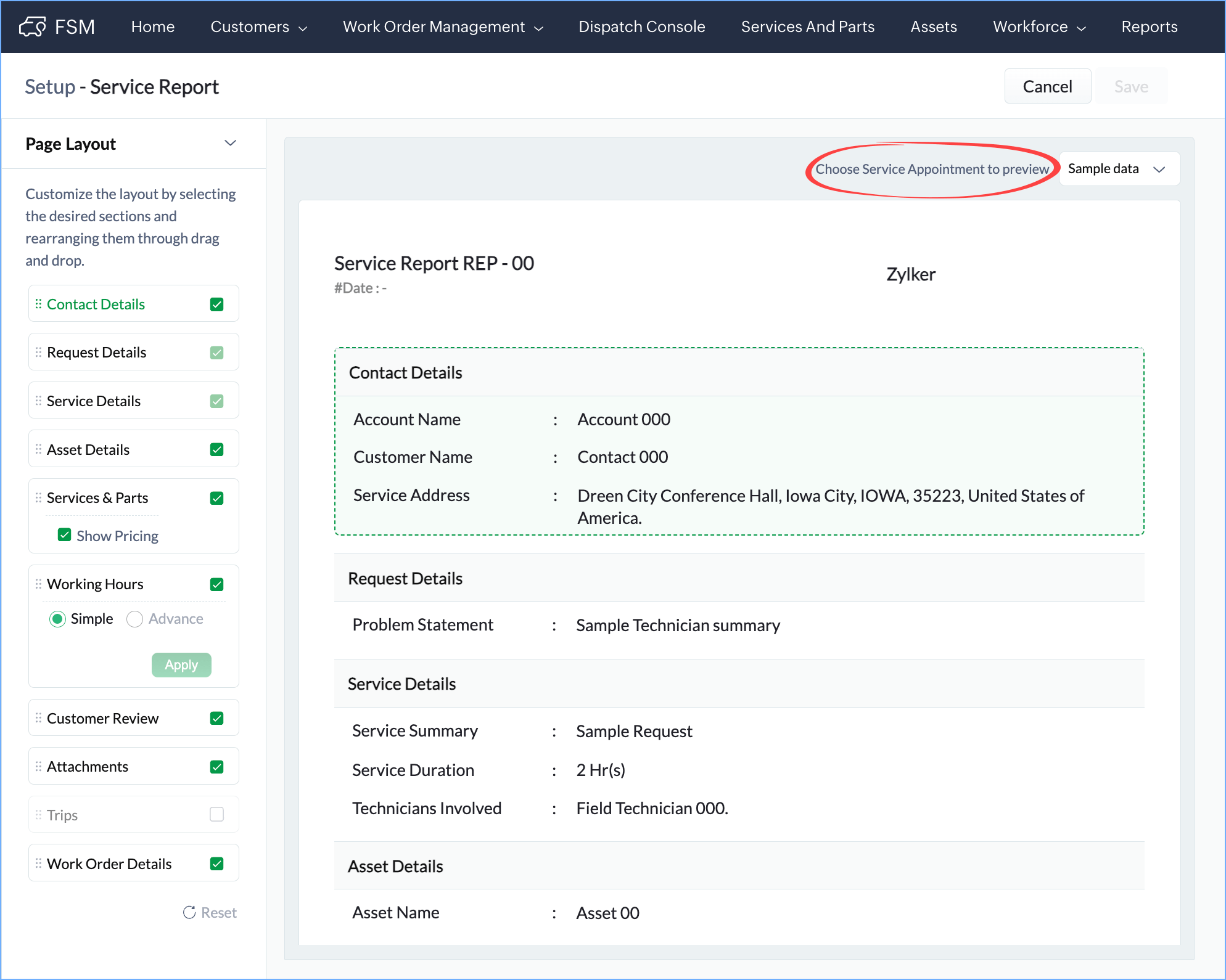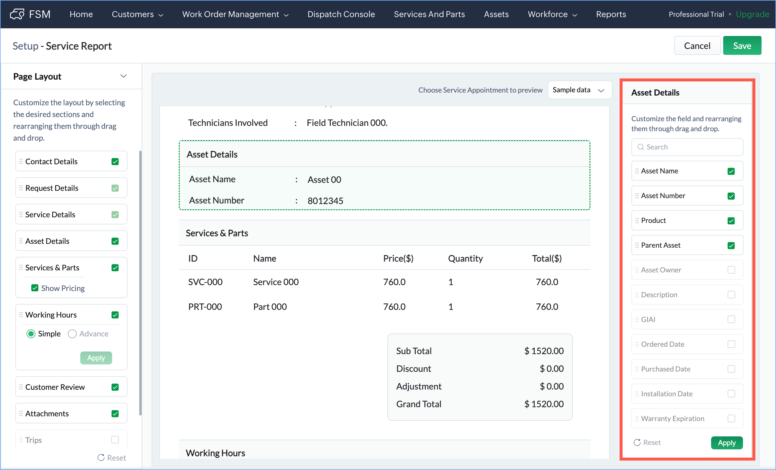 You can choose the fields that you want included in the Asset Details and Work Order Details sections of the service report template. When you select either of these sections, the fields available in them will be listed on the right side. Check the field you want to include in the section. Also, reorder the fields according to your needs. After you click Apply, the changes will be reflected in the respective section in the template. You can click on Reset  to revert the changes. Click Save to proceed with the changes.