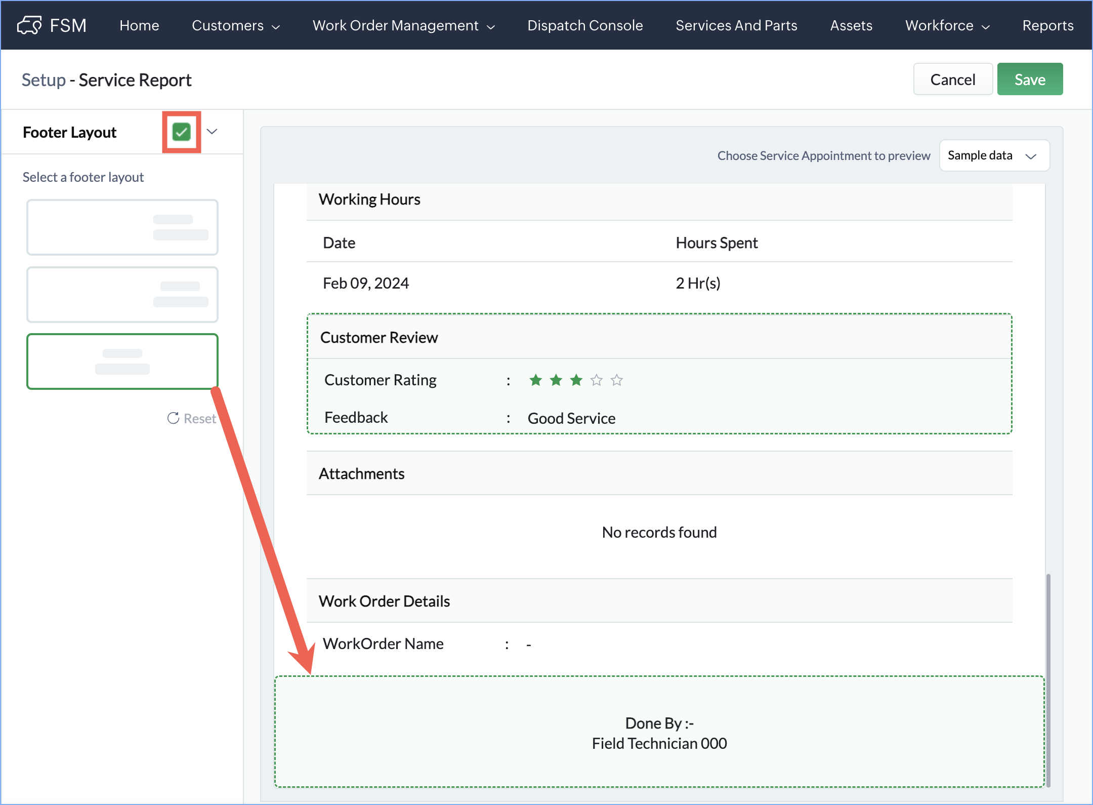 The footer will contain the name of the field agent and the customer signature (if present). You can choose from one of the three footer layouts. You can also remove the footer layout by deselecting the checkbox.