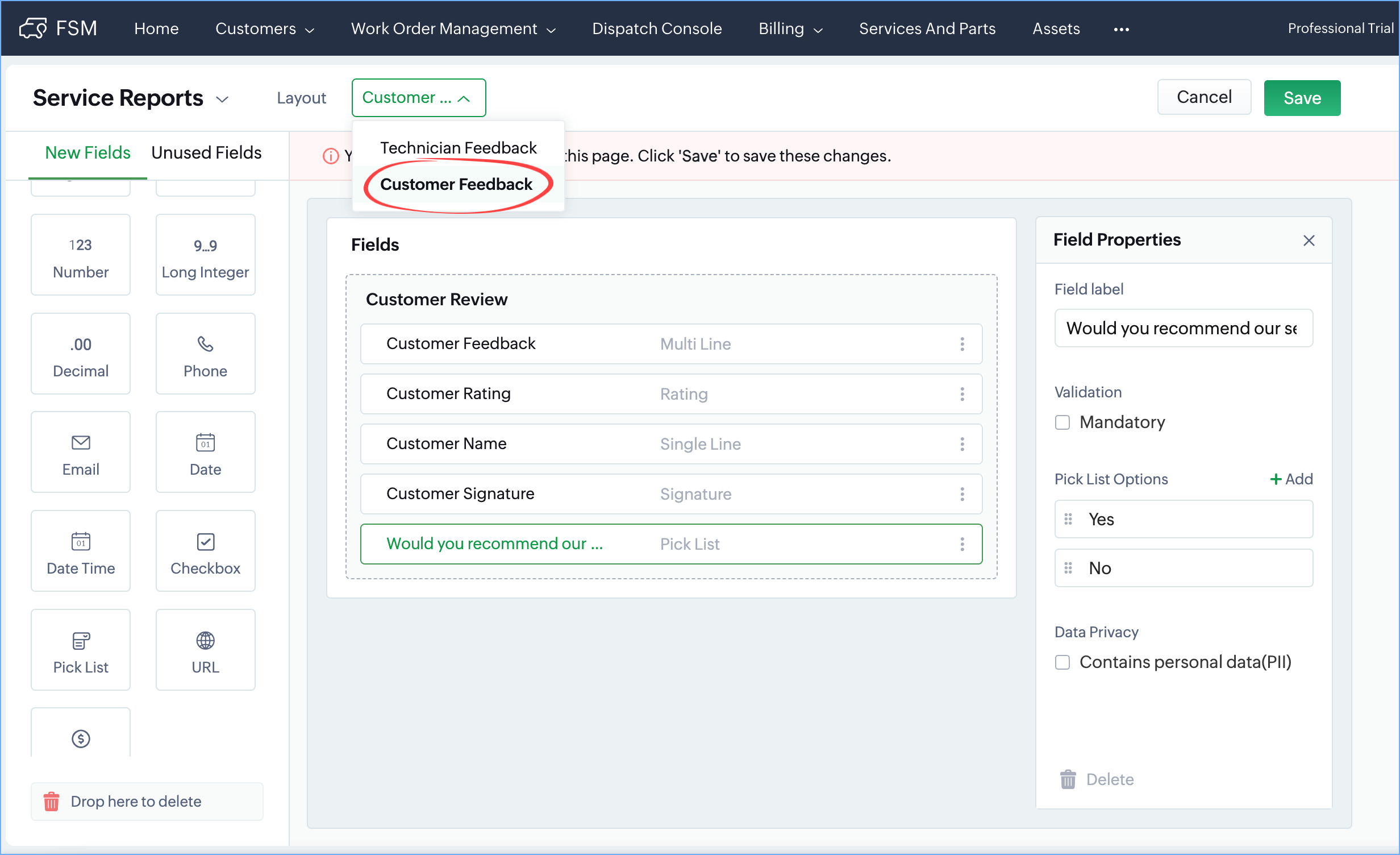 2. Select the Customer Feedback layout and add the necessary fields/customizations and click Save.