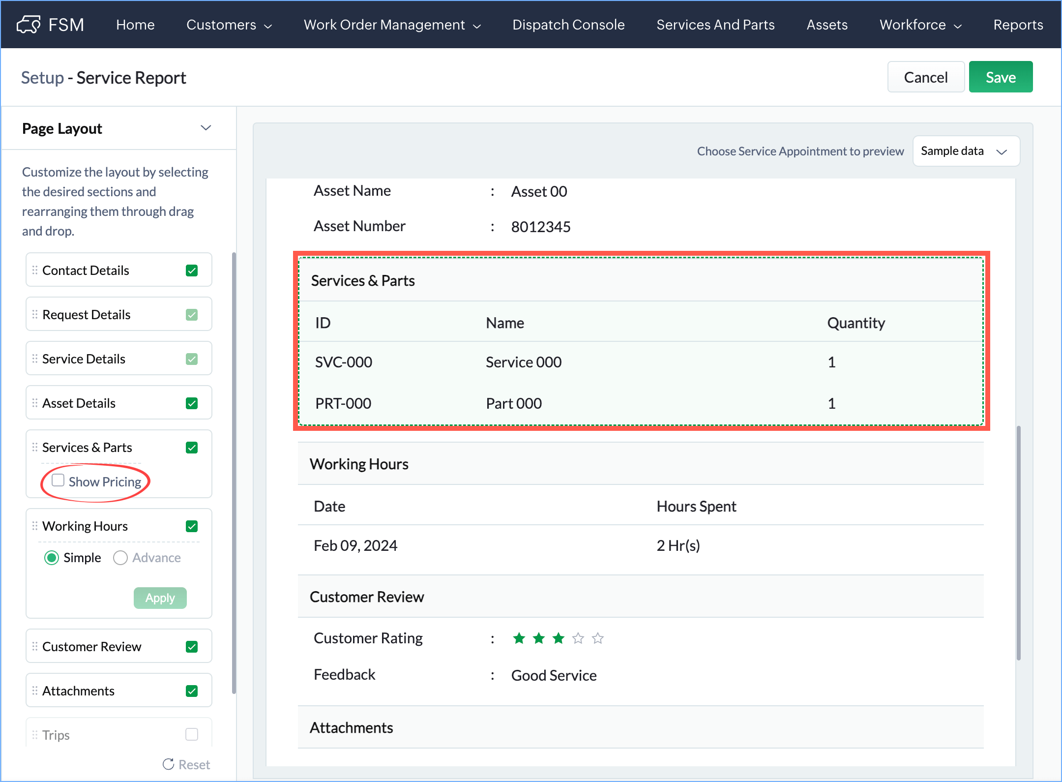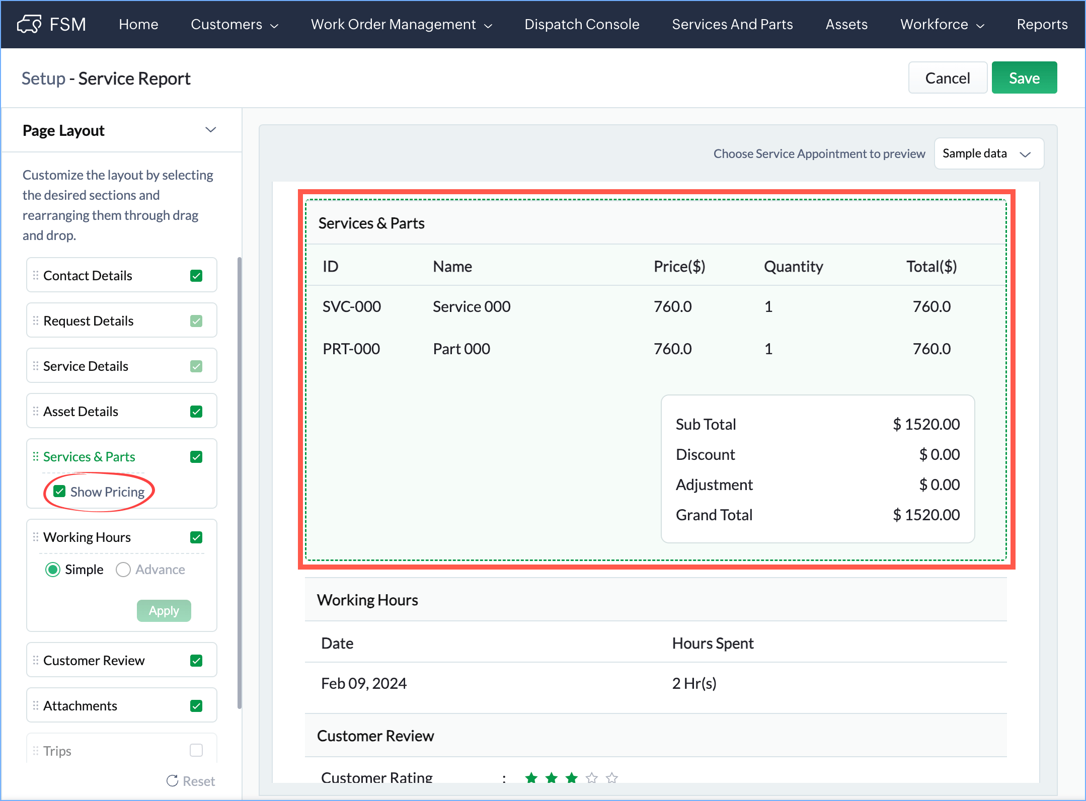 Once the checkbox is unselected, the pricing details will be hidden in the Service & Parts section of the service report.