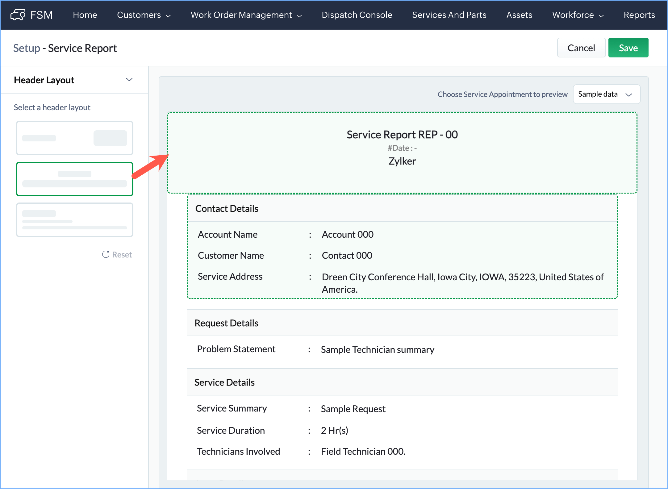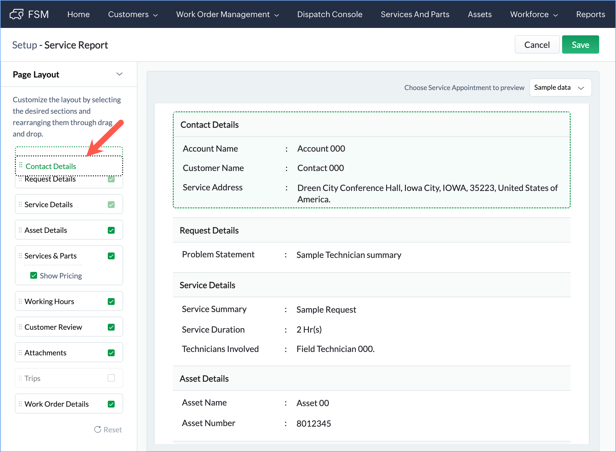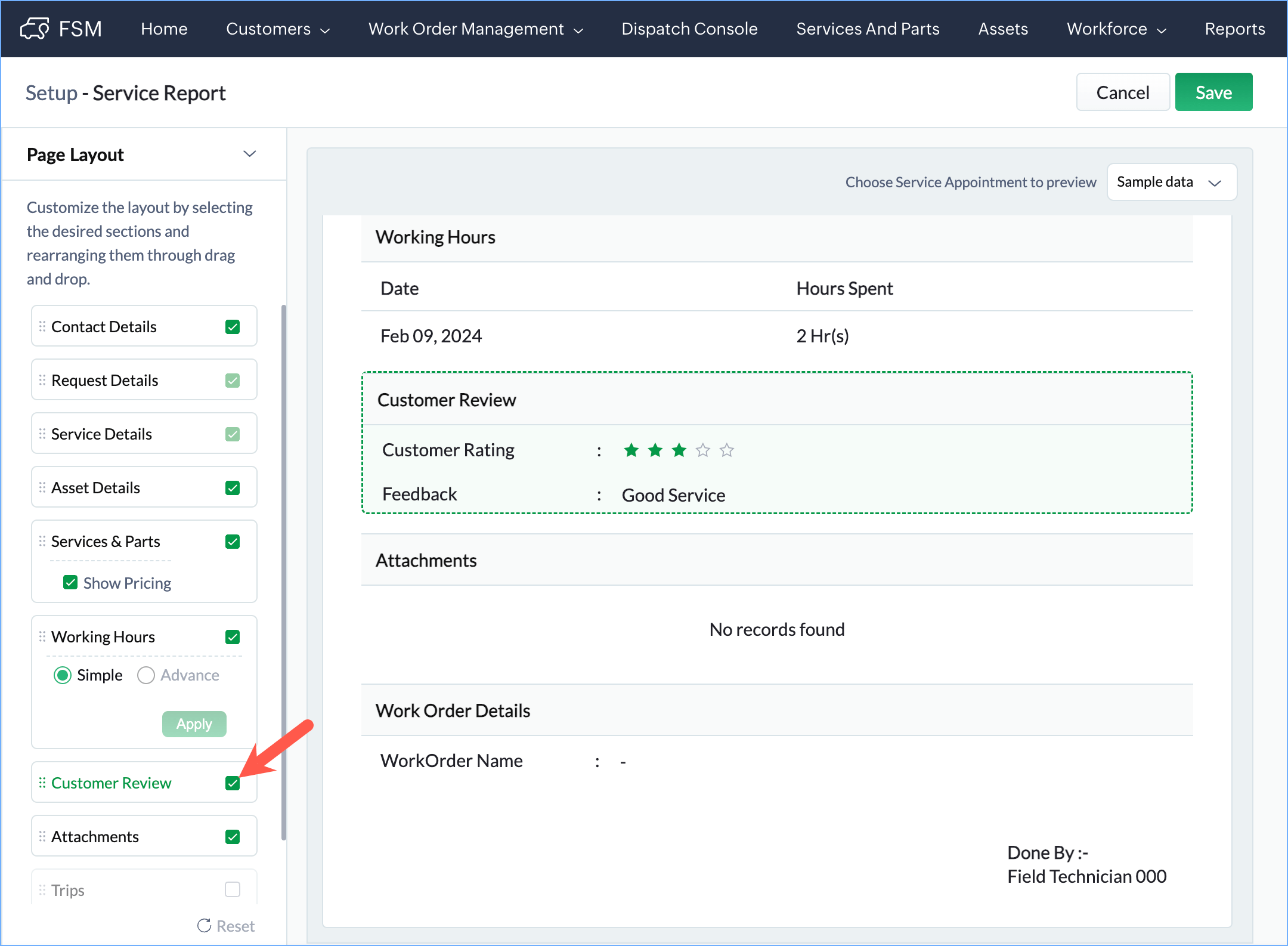Using this you can customize the body of the service report. Within the page layout, you can choose to rearrange the sections, and hide or display a section.