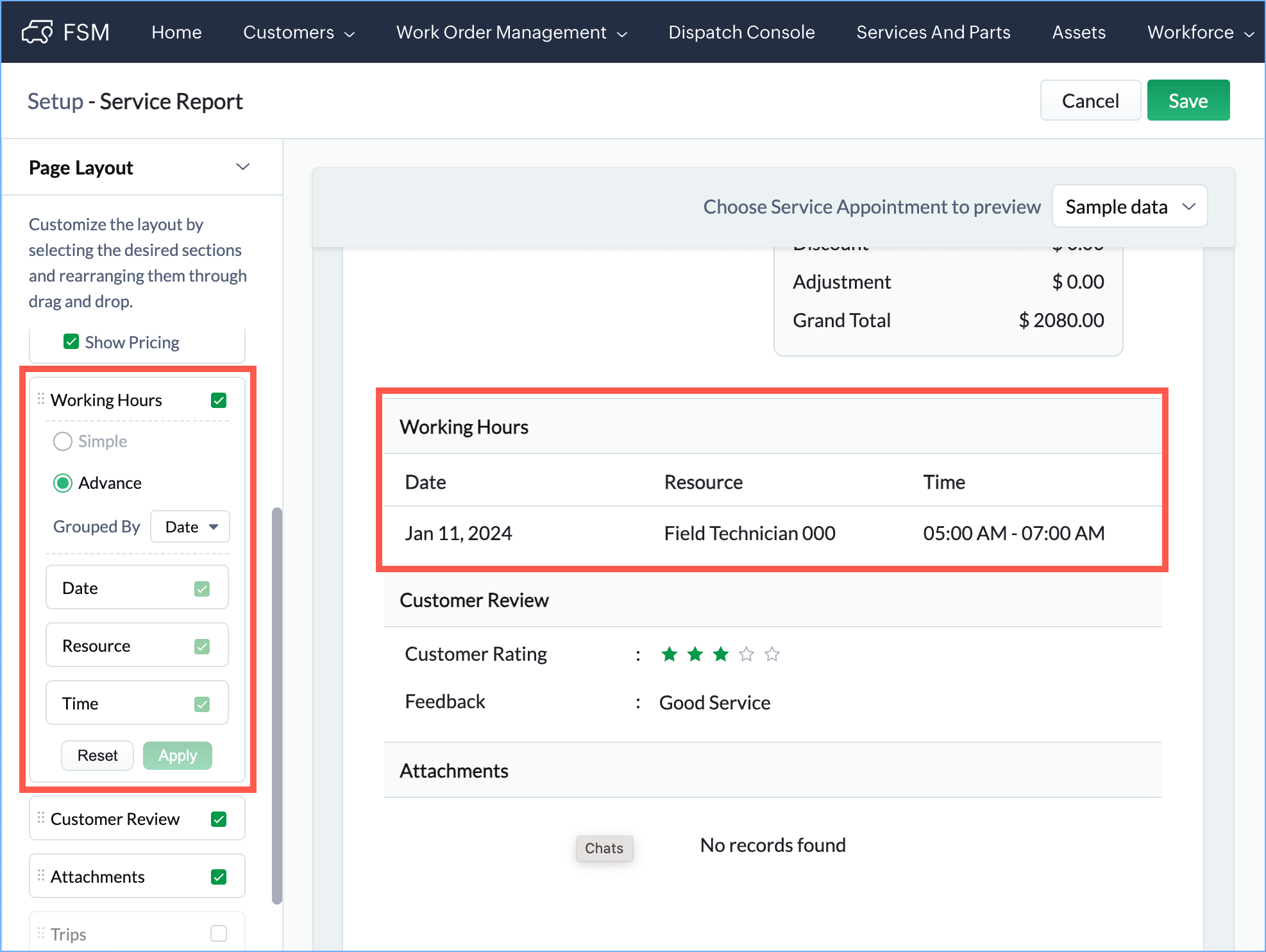 The Working Hours section captures the time sheet information of the service appointment. You have the option to choose a Simple or Advance view of the working hours. In the Advance view, you can group the time sheet entries by Date or User (Service Resource). Select the desired view and click Apply. Once you click Apply, you can see the preview in the template.