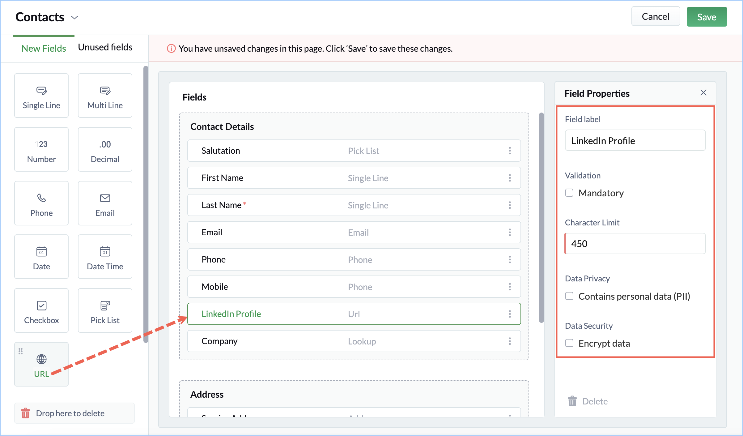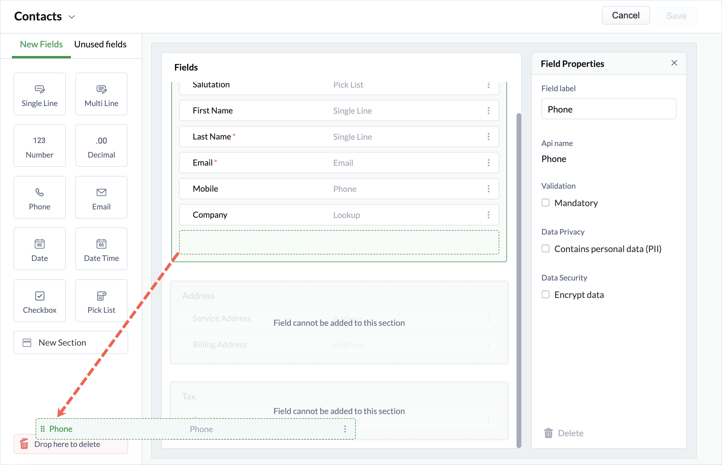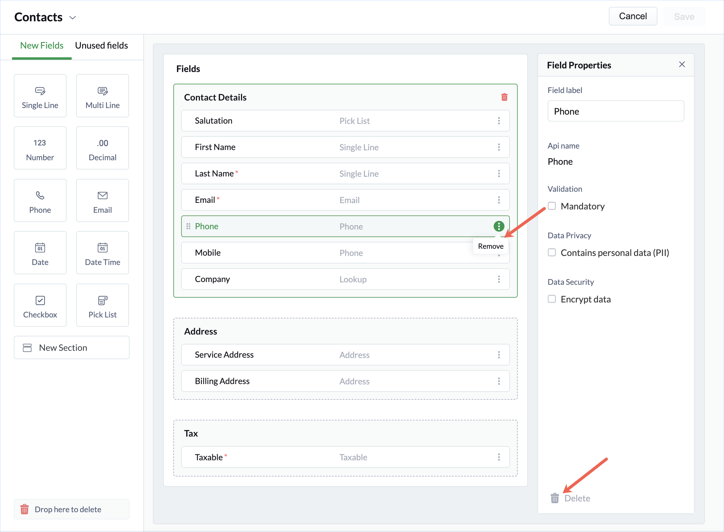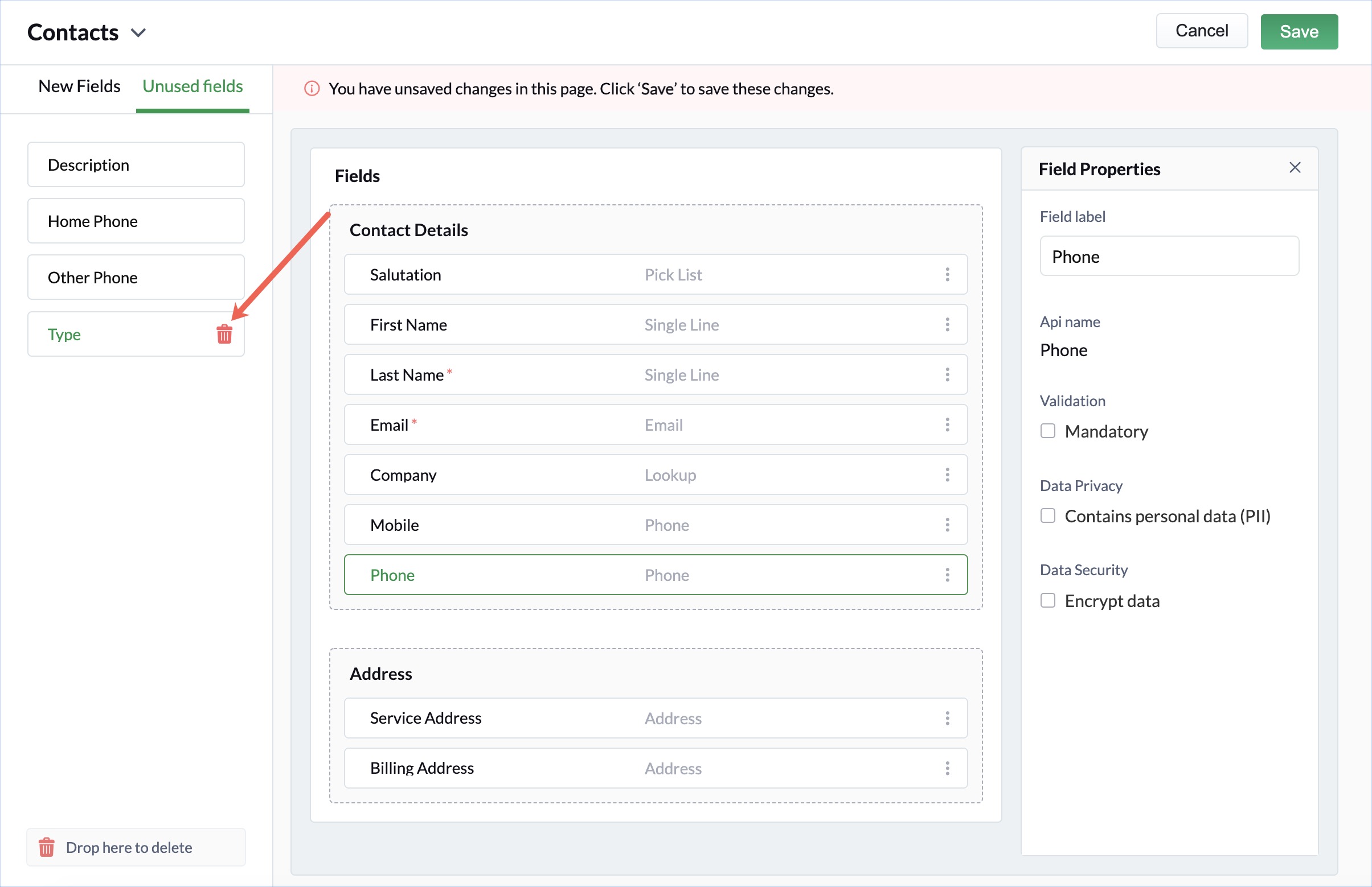 Unused fields section, you can either retrieve the field or delete it permanently from the module. To retrieve the field, drag and drop it back to the desired section of the module. To delete the field permanently, click on the Delete [