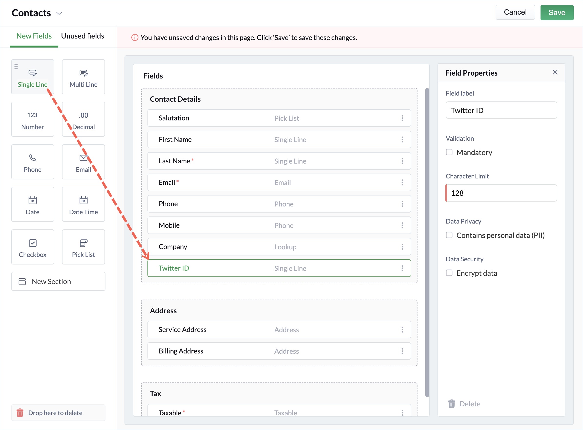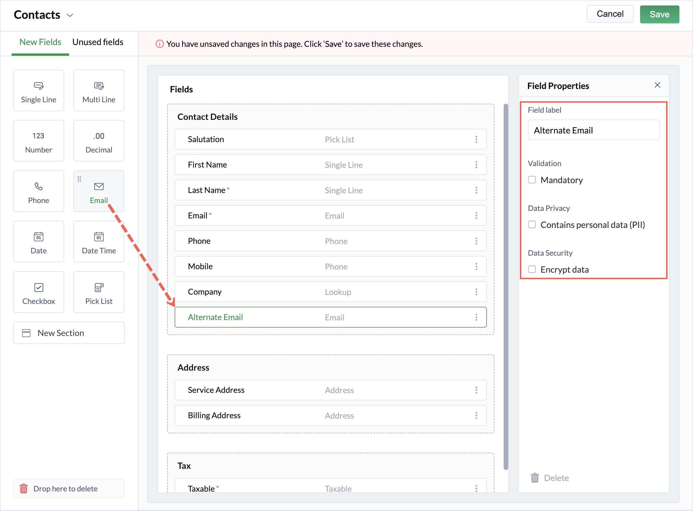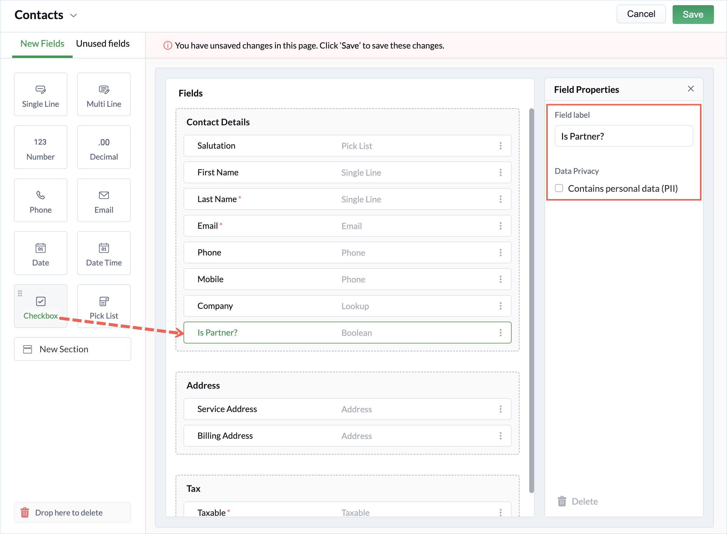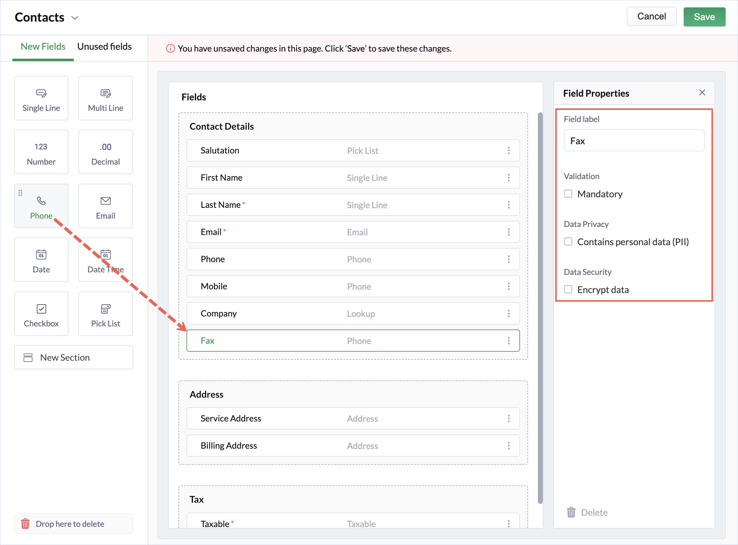 Unused fields section, you can either retrieve the field or delete it permanently from the module. To retrieve the field, drag and drop it back to the desired section of the module. To delete the field permanently, click on the Delete [