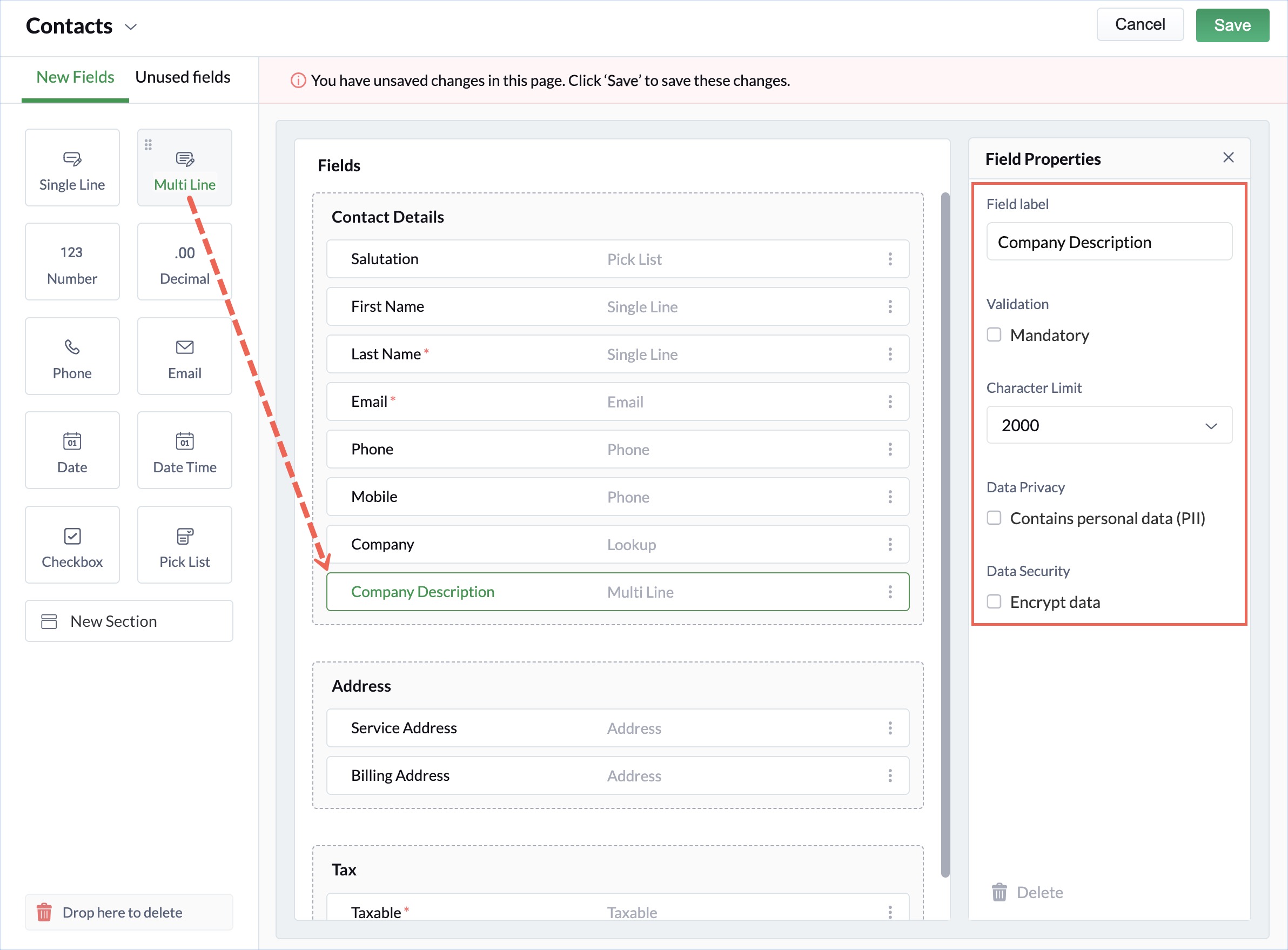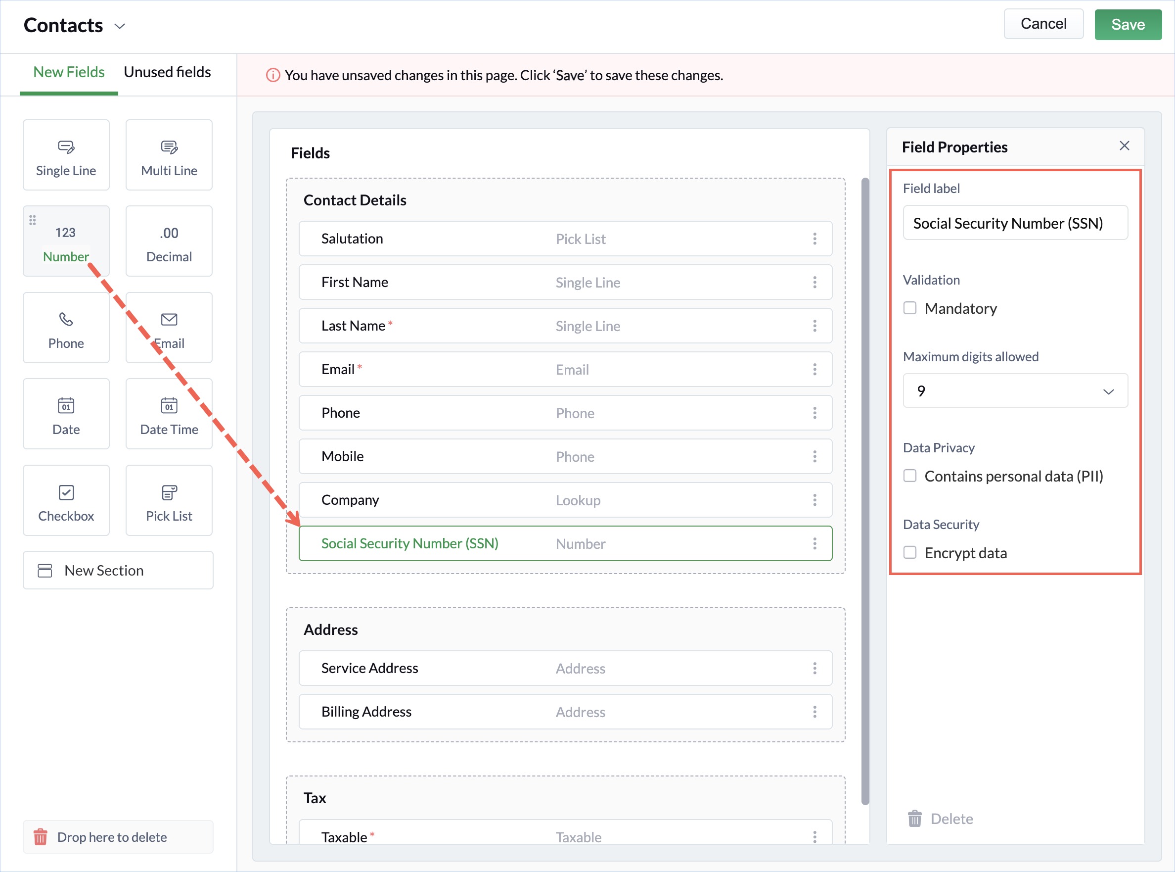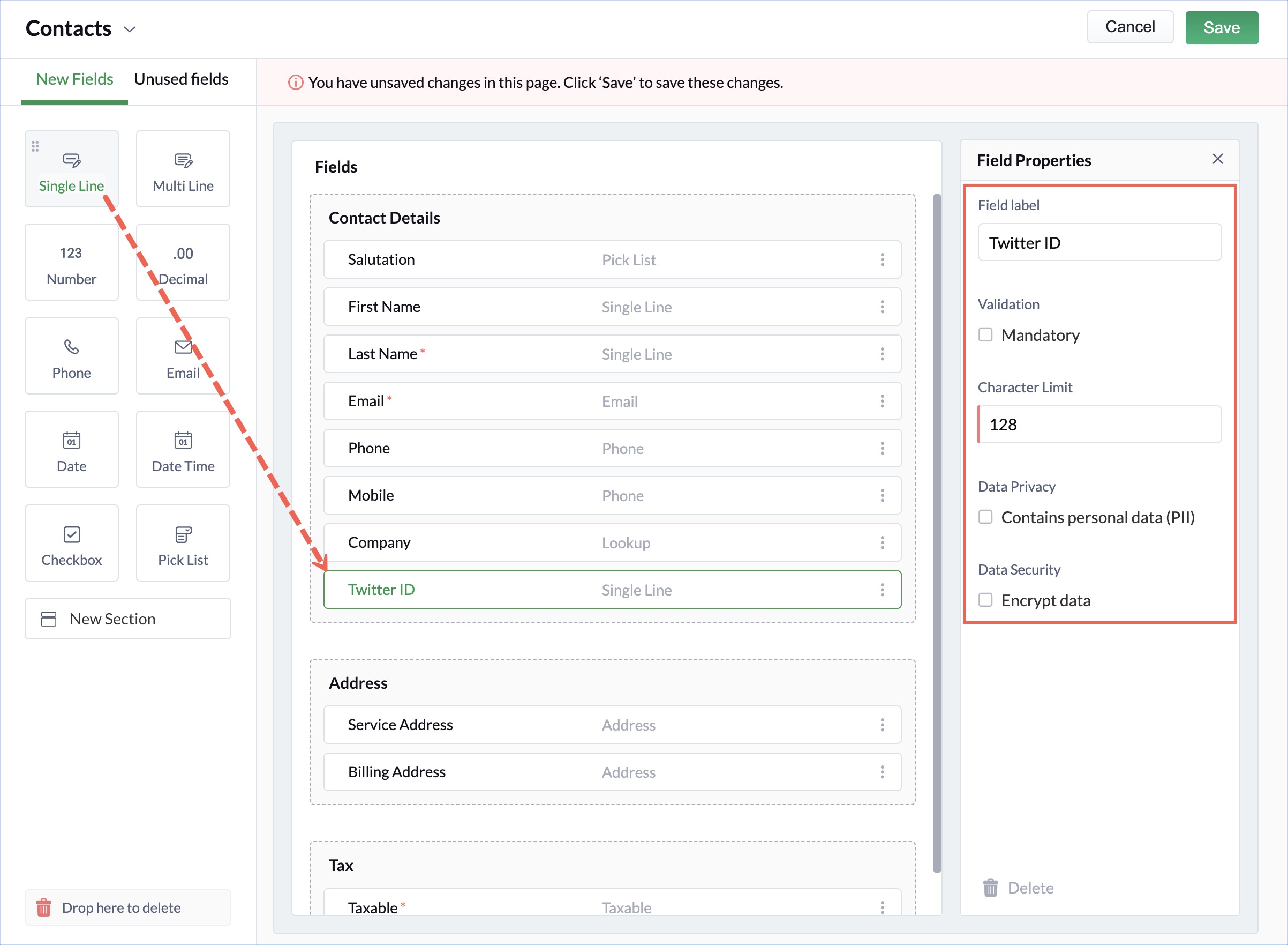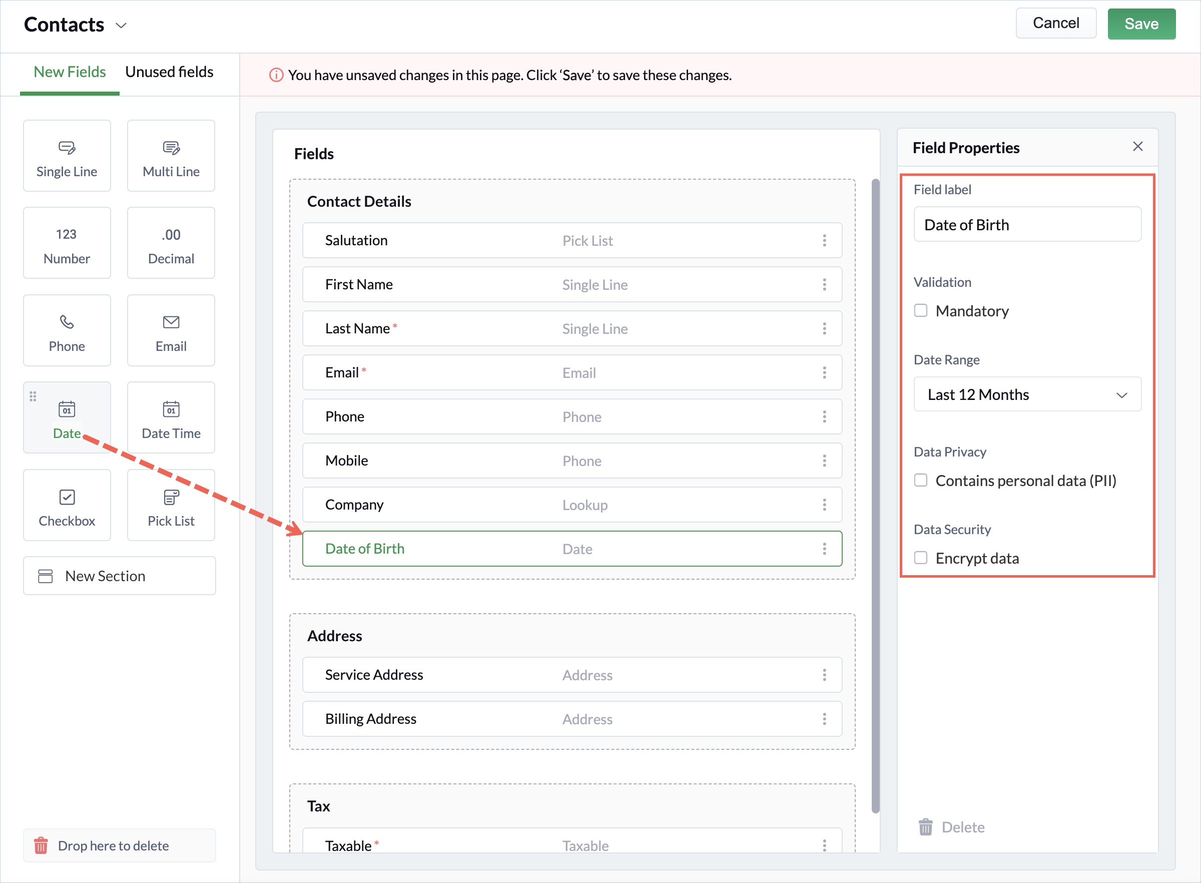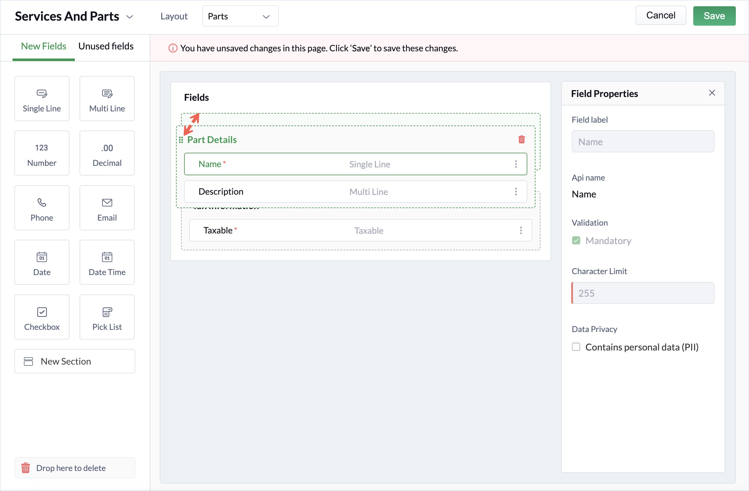 Unused fields section, you can either retrieve the field or delete it permanently from the module. To retrieve the field, drag and drop it back to the desired section of the module. To delete the field permanently, click on the Delete [
