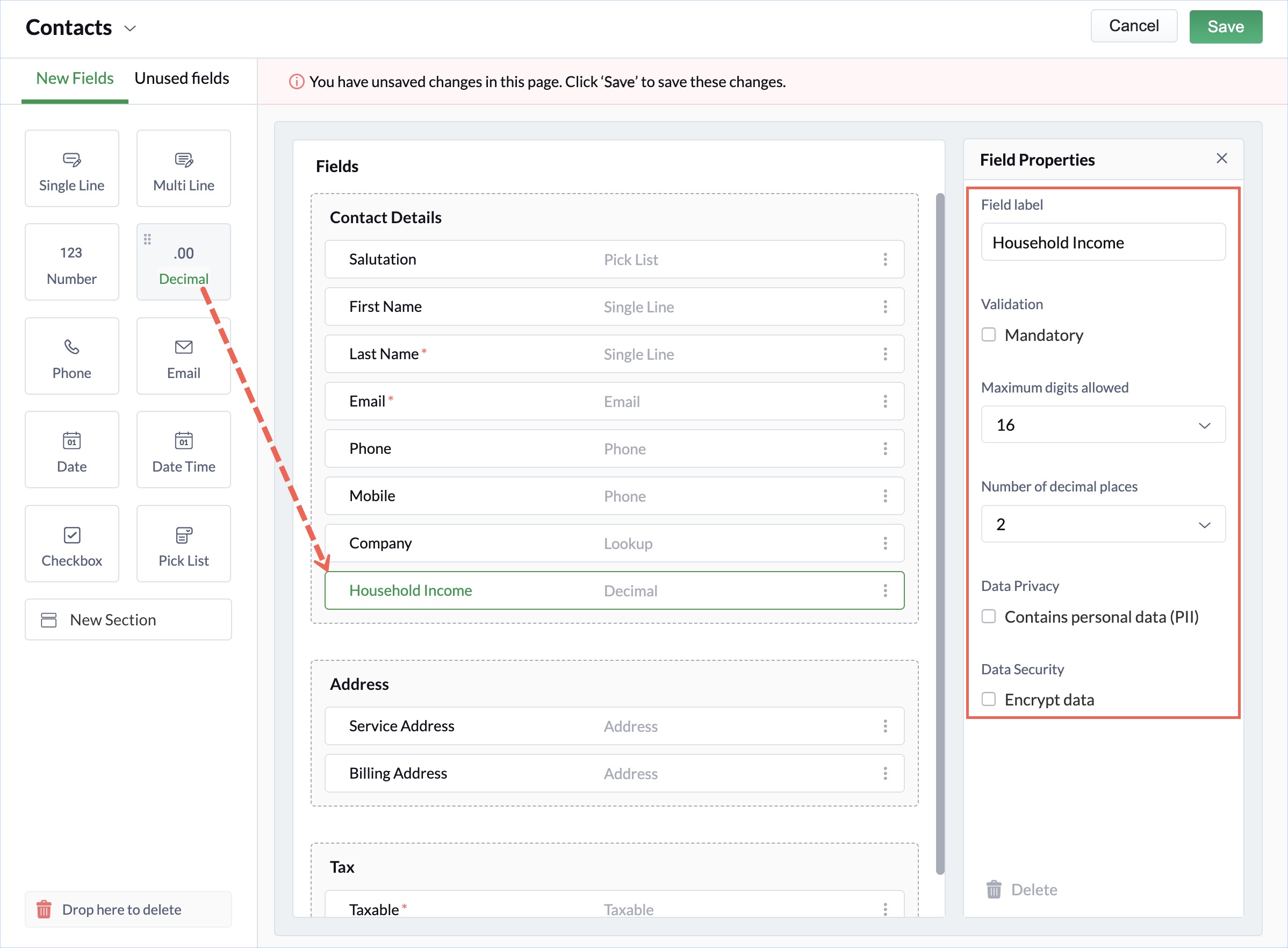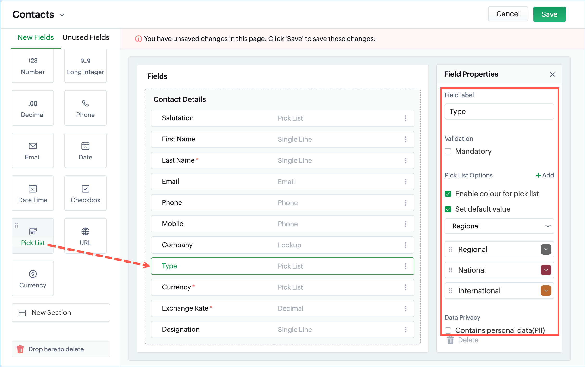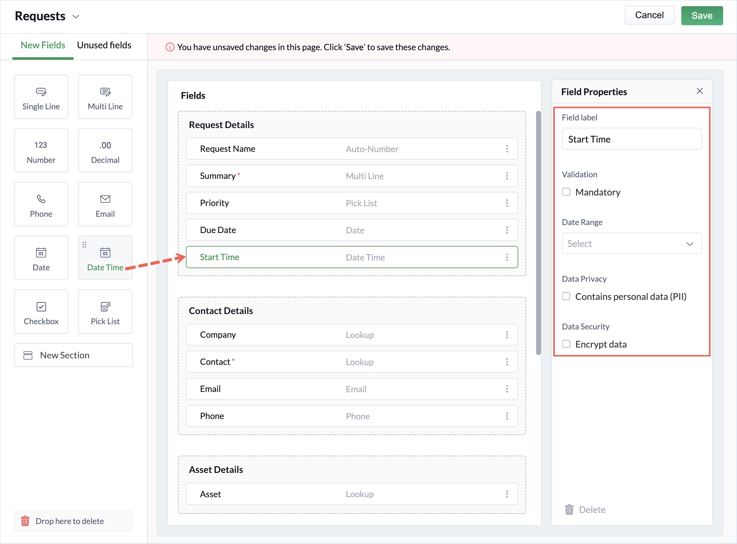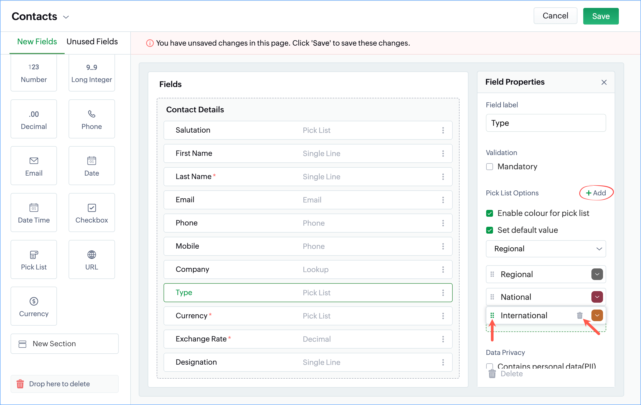 Unused fields section, you can either retrieve the field or delete it permanently from the module. To retrieve the field, drag and drop it back to the desired section of the module. To delete the field permanently, click on the Delete [