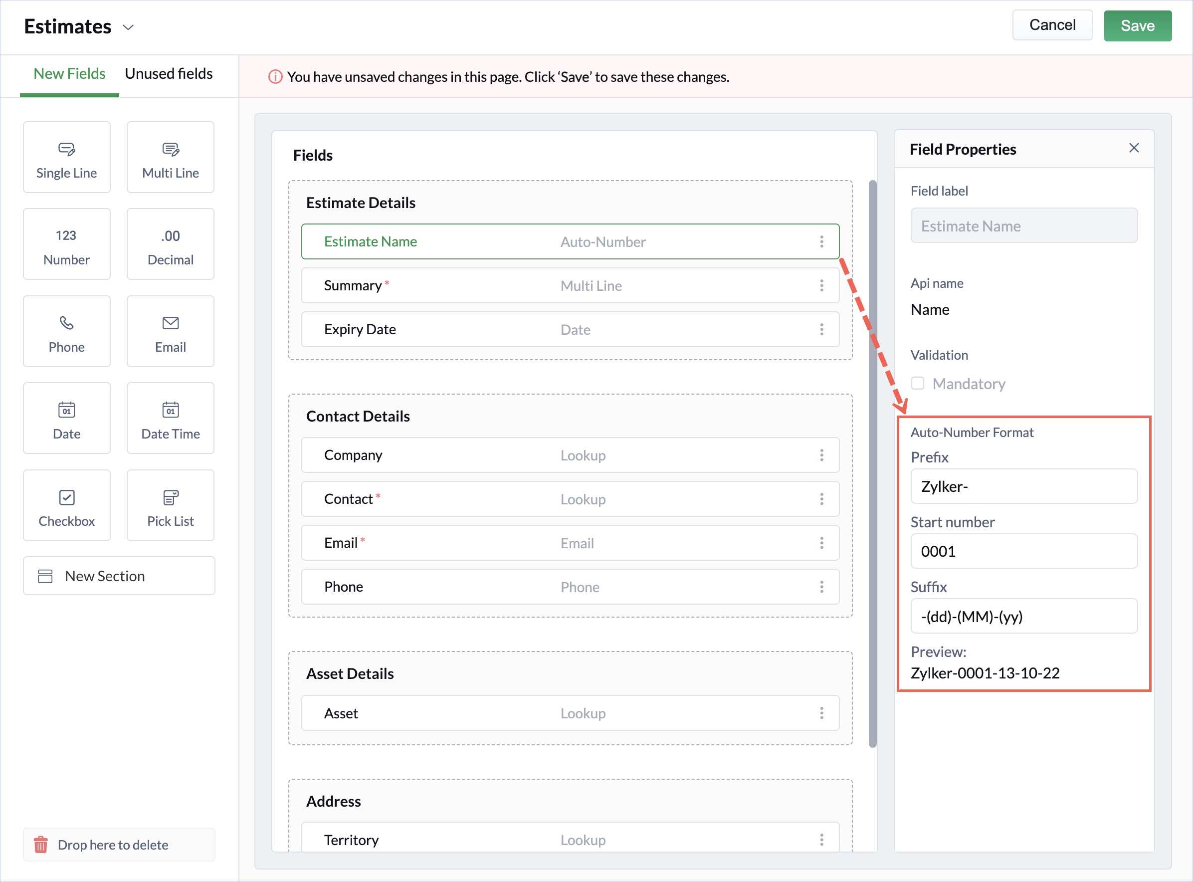 Example of an auto-number is Zylker-0001-13-10-22, where,