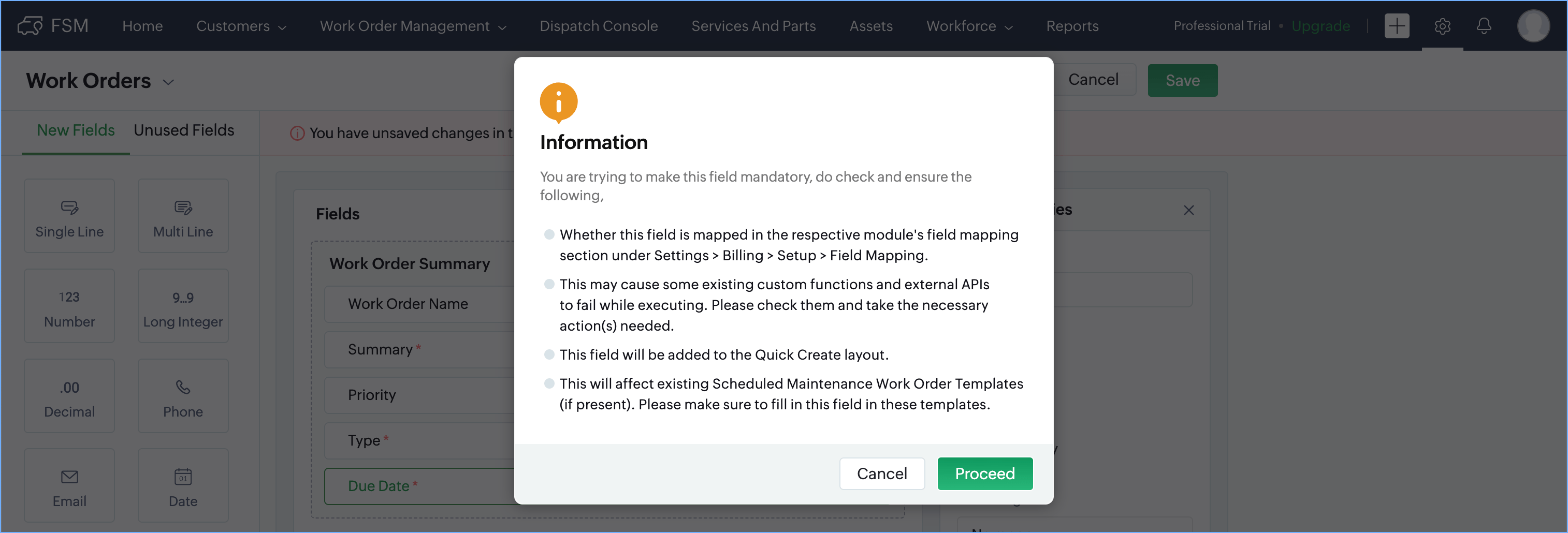 - If the field now marked as mandatory has been used in custom functions, or integrations involving FSM REST APIs, then their functioning will be impaired. You might need to revisit them and make the necessary changes.