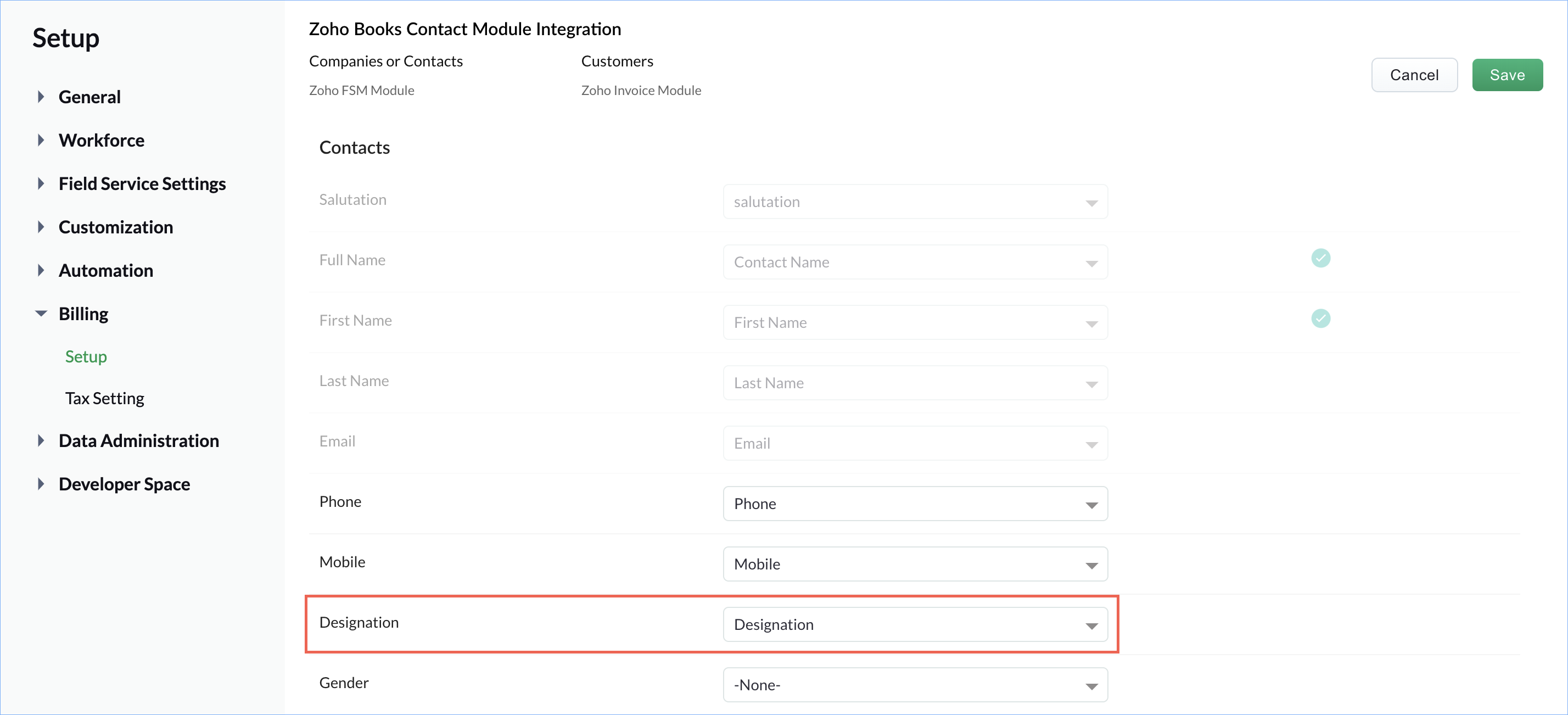 - In the Field Mapping for the FSM-Invoice/Books integration, ensure that the FSM field marked as mandatory is mapped to a field in Invoice/Books.
