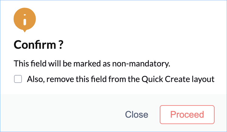 While removing the mandatory validation for a field, you have the option to remove it from the Quick Create layout. Select the Also, remove this field from the Quick Create layout checkbox if you want to remove the field from the Quick Create layout.