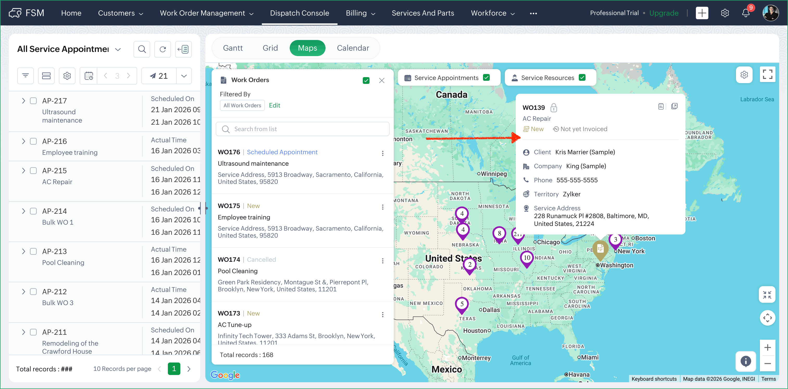 You can customize the details that are shown in the popover displayed on hovering over the service appointment entries in the Gantt, Grid, and Calendar views of the Dispatch Console. You can choose the details that you want to see and the order in which you want them to be displayed. By default, the following parameters will be displayed: