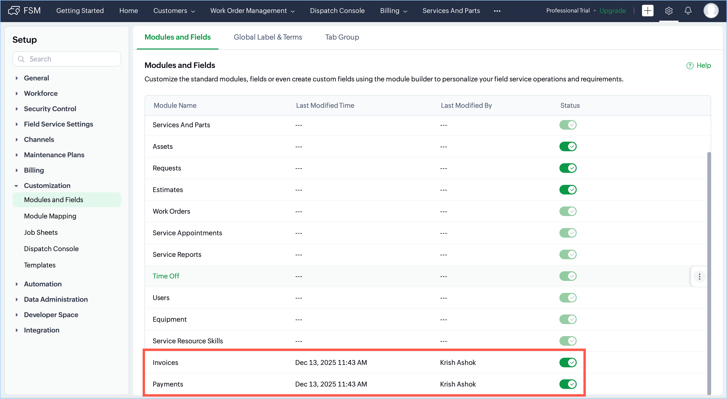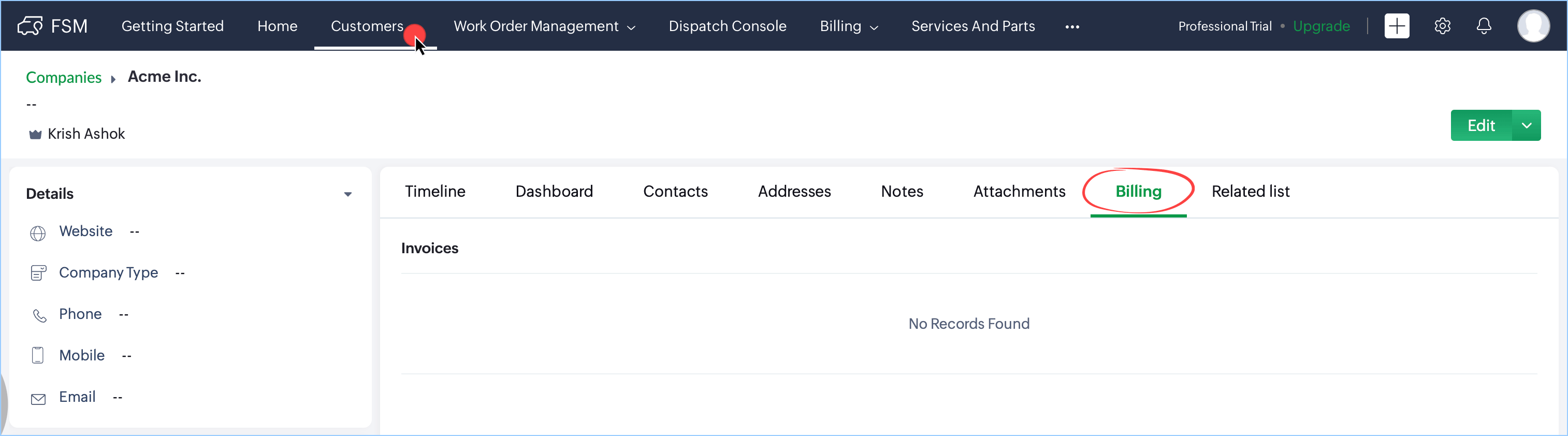 Zoho FSM allows you to control the visibility of billing-related features based on your business needs. If you do not use invoicing and payment functionalities within Zoho FSM, you can hide the Billing tab to simplify the interface and reduce unnecessary clutter. Disabling the Billing tab hides all invoice- and payment-related options across the application, ensuring that users only see the features relevant to their needs.
